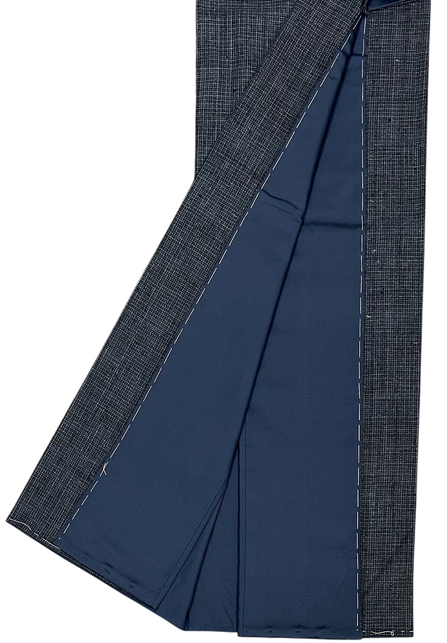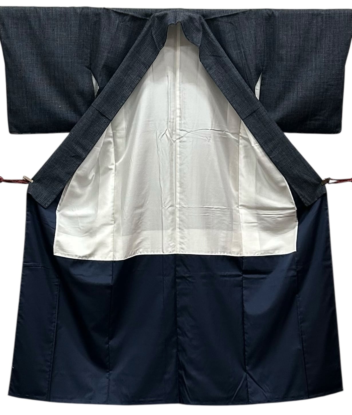 紬 黒に近い濃藍色×舛花色 細かい格子柄 仕付け糸つき 裄丈 68㎝ K4709