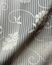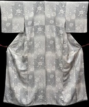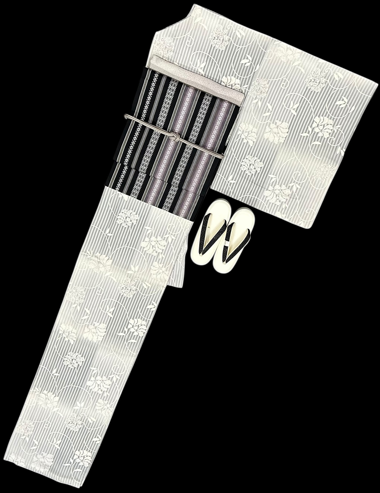 洗練された上品な小紋のお着物のご提案です。鼠色、銀鼠色、絹鼠色のグレー系の濃淡が美しいこの着物には、縦縞の上に白い唐草模様が施されており、さりげなくお洒落な印象を与えます。光沢のある美しい地と、つるっとした肌触りが特徴で、快適にお過ごしいただけます。