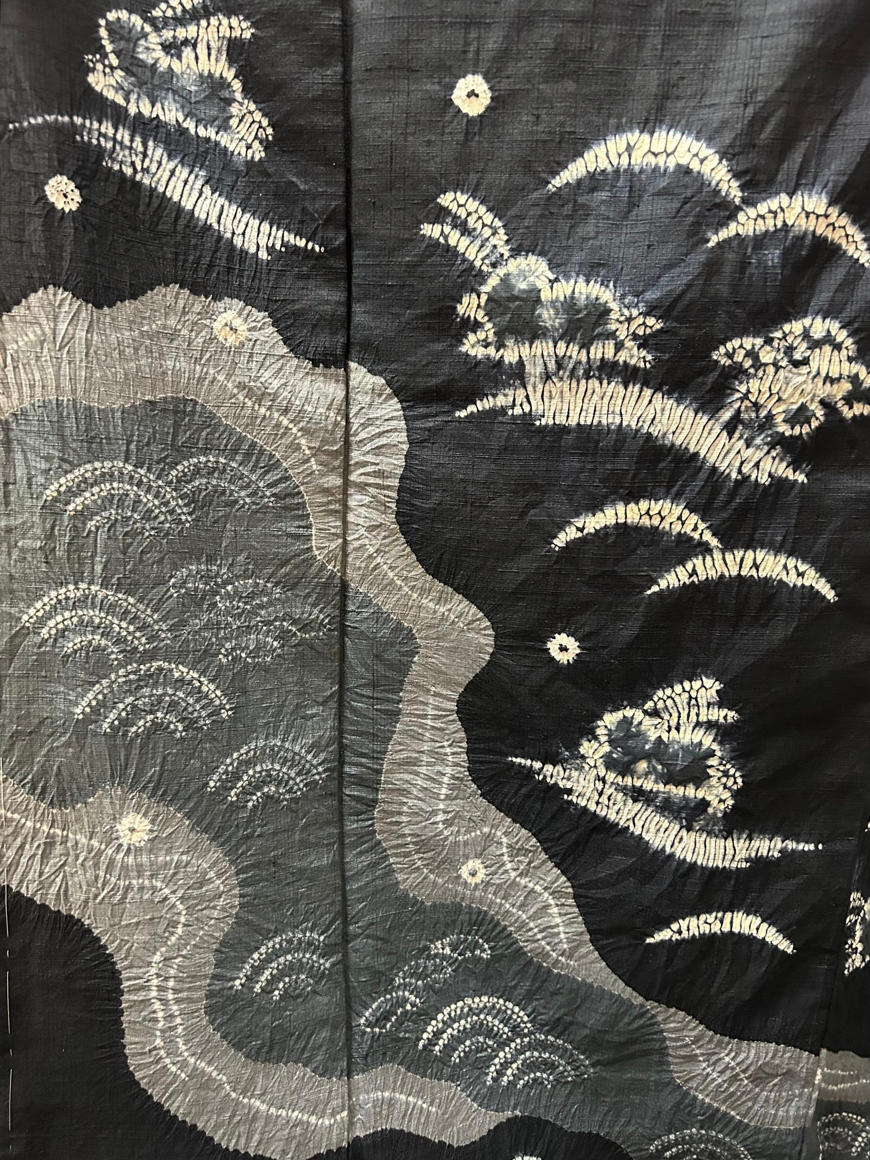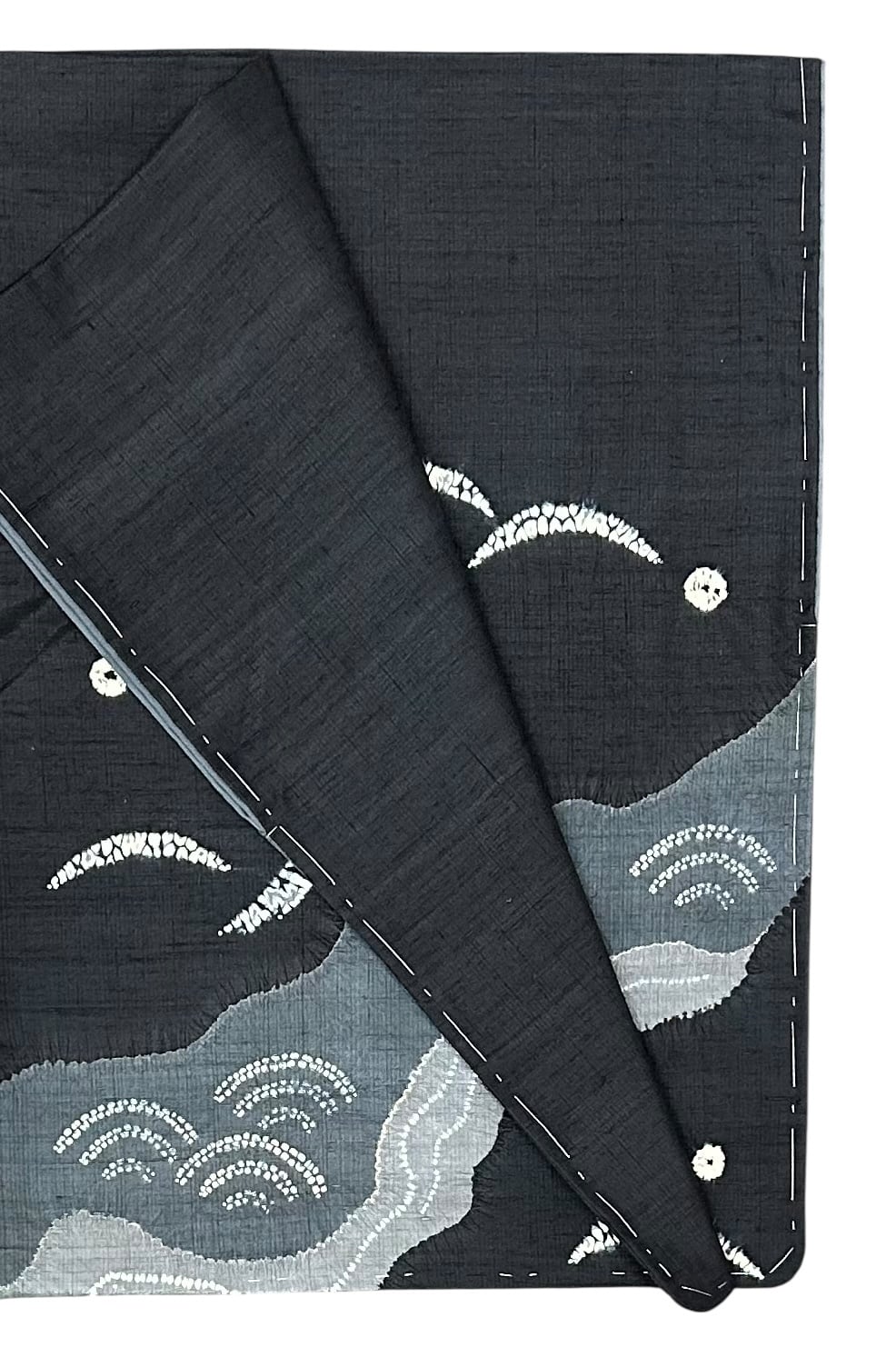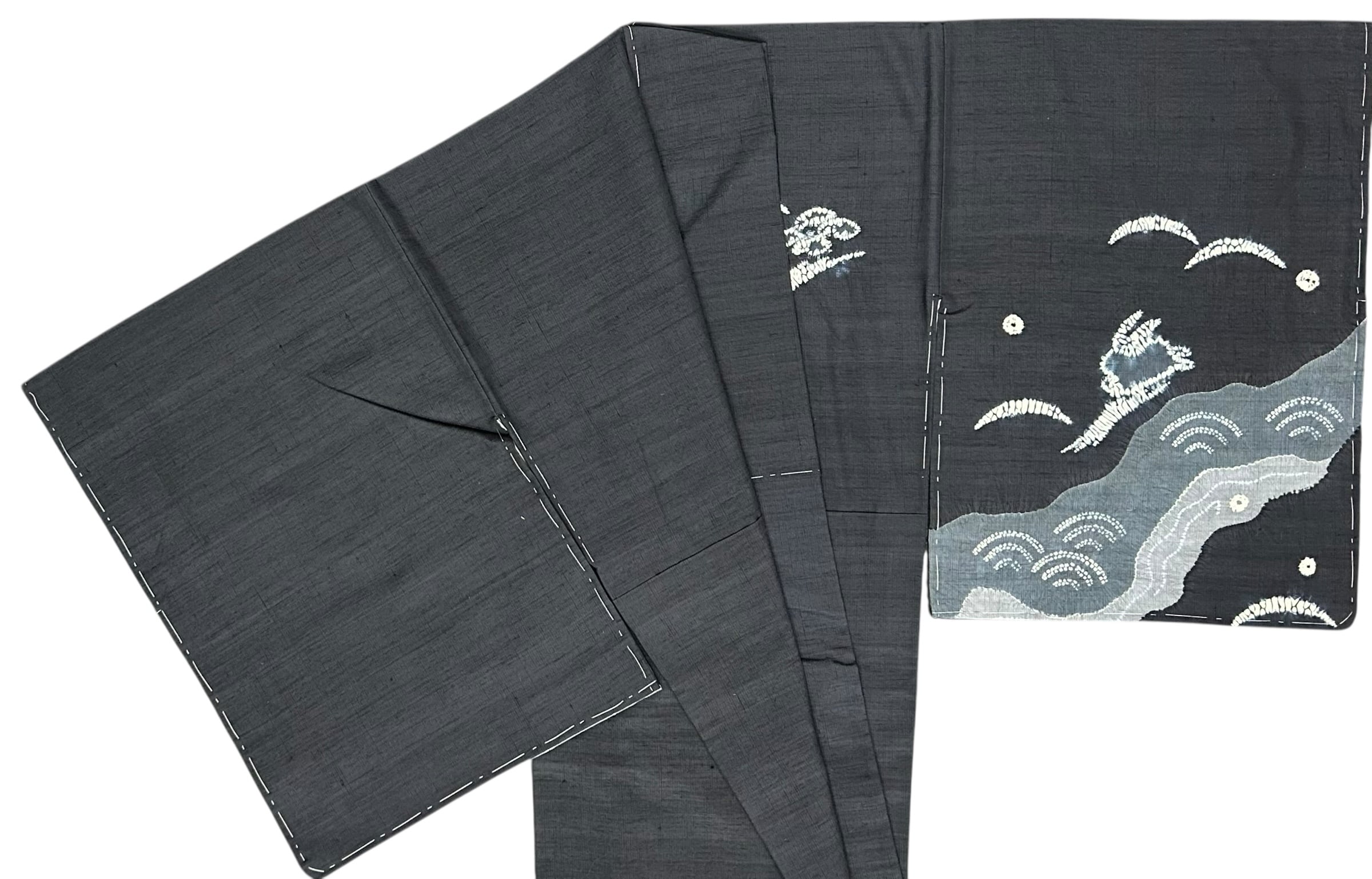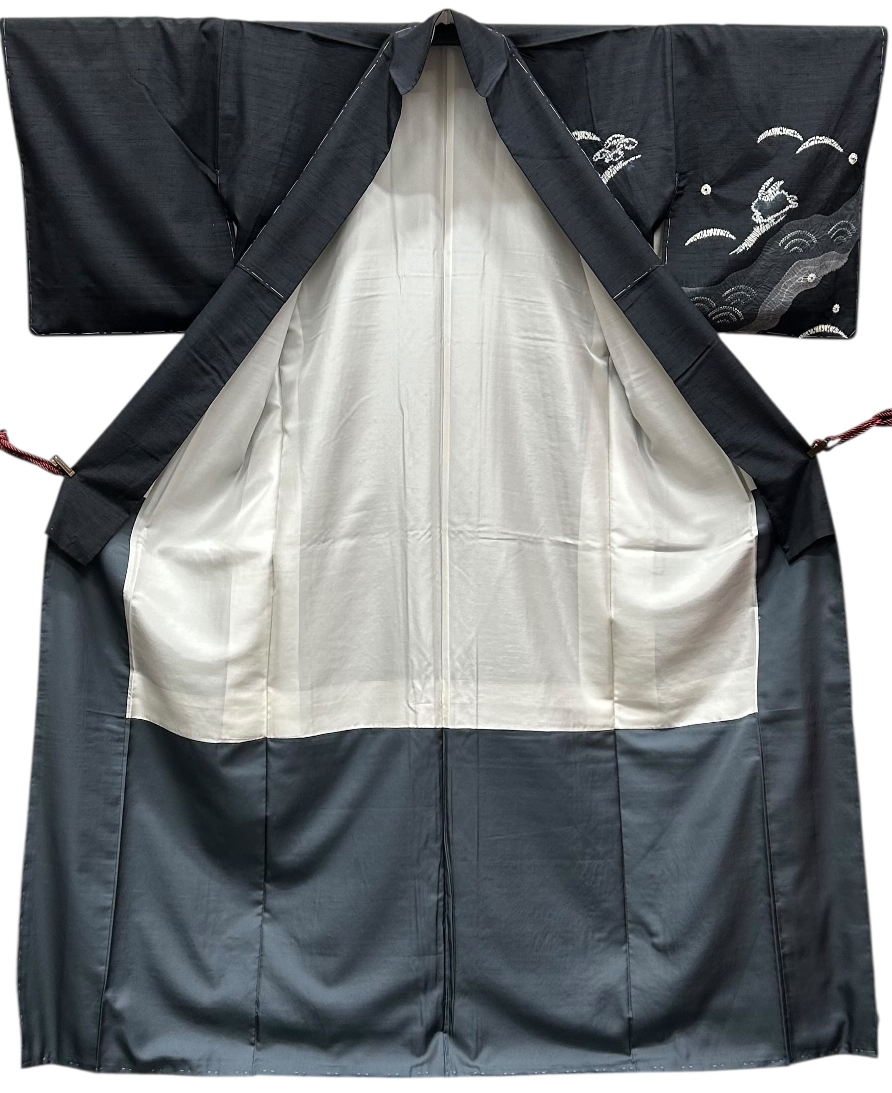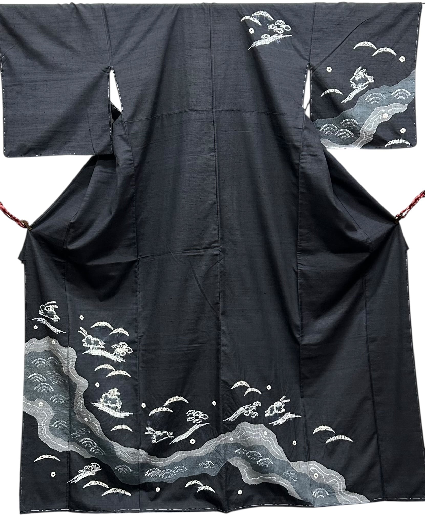 付下げ 紬 絞り 黒地 白いうさぎ 鼠色と錆鼠色の流水文様 しつけ糸つき 裄丈 68.5㎝ K5967