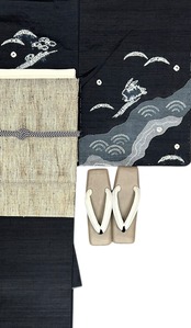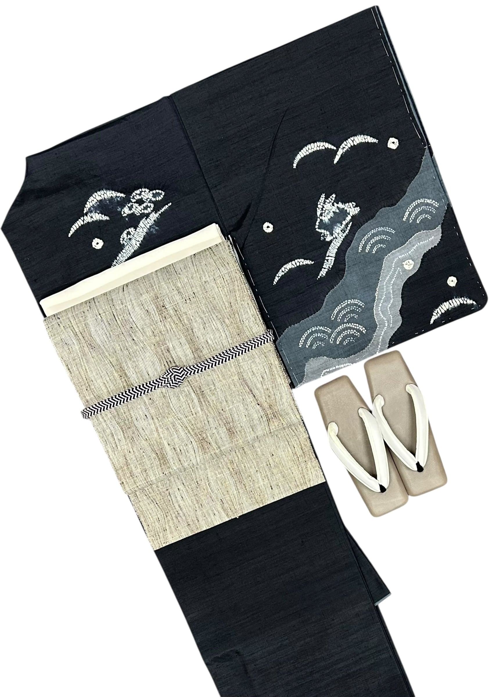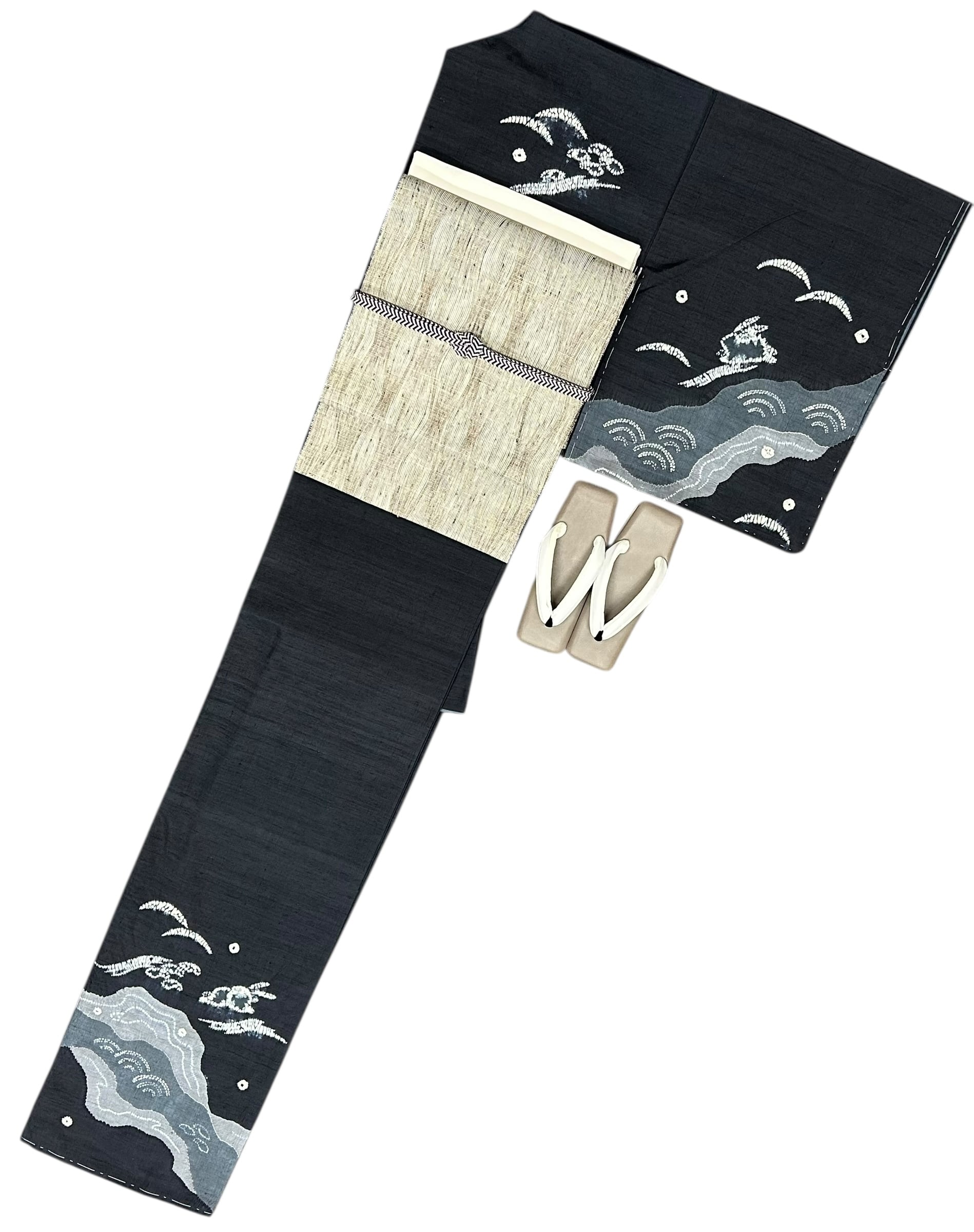 洗練されたデザインの紬地、付下げ着物のご提案です。黒地に映える鼠色と錆鼠色の流水模様が流れるような美しさを演出し、可愛らしい白いうさぎの柄が個性を引き立てます。柔らかい肌触りの紬地が、着心地の良さを感じさせる一着です。しつけ糸つき。