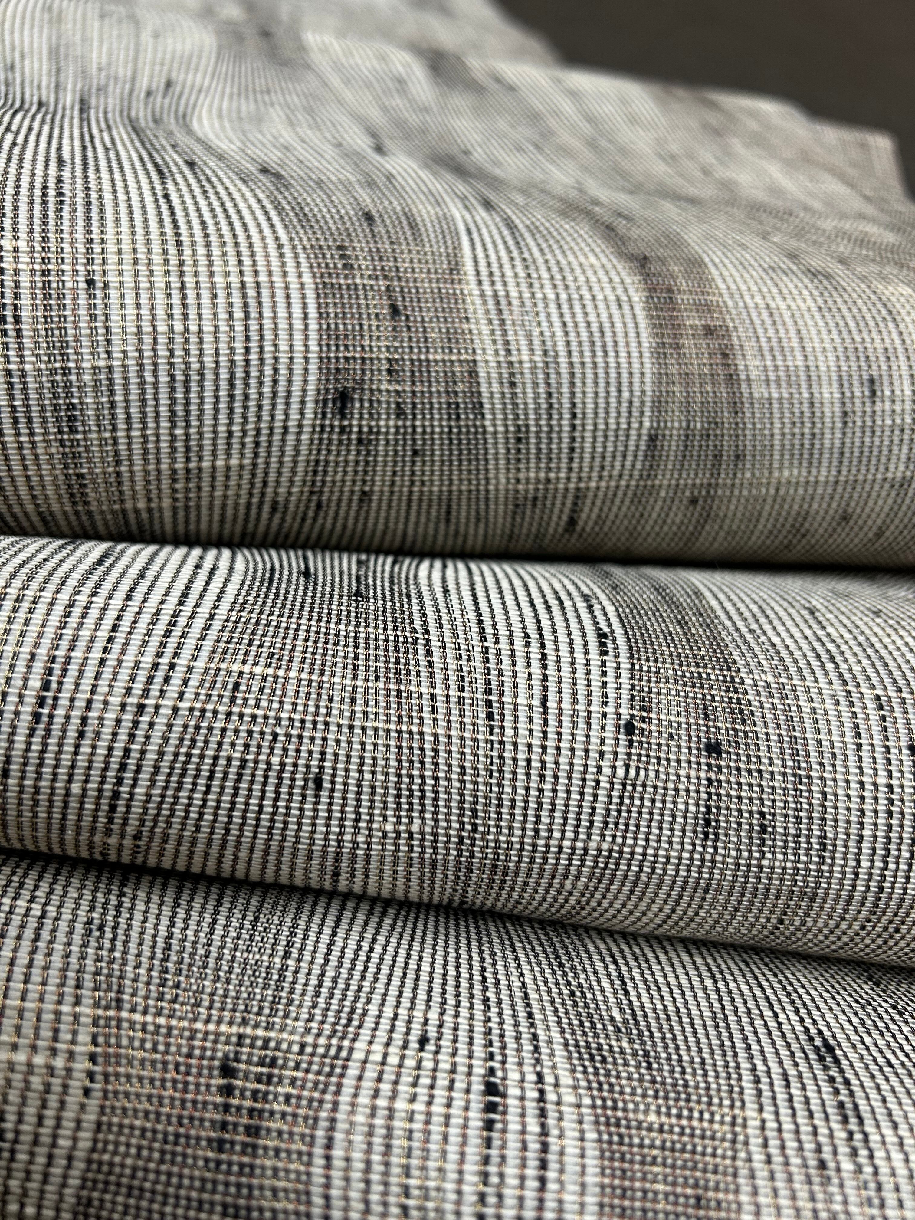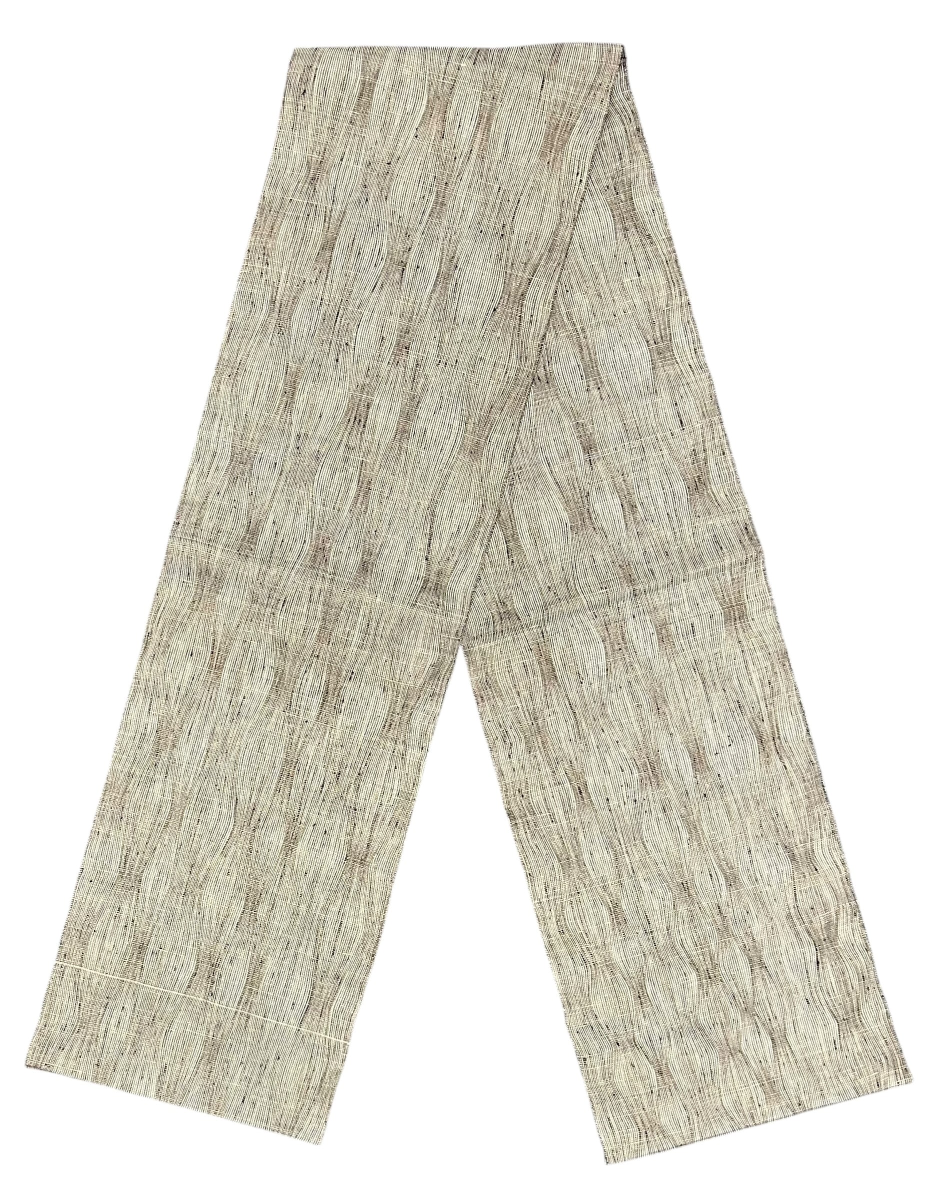 美しい色合いと繊細なデザインが魅力的なリバーシブル袋帯のご提案です。生成り色と白鼠色、黒、そして銅に近い金糸のよろけ縞の面と、もう一方の面には細かい格子模様。とても高い技術の手織りによるこちらの帯は、しなやかで軽やかな仕上がりで、着用時に感じる心地よさが特徴です。「帛 筬」証紙も付いており、品質に信頼のおける一品です。