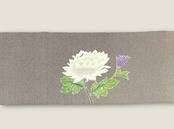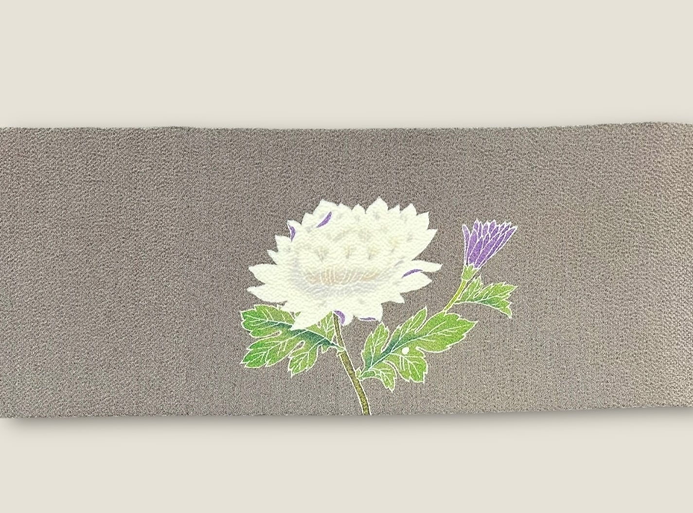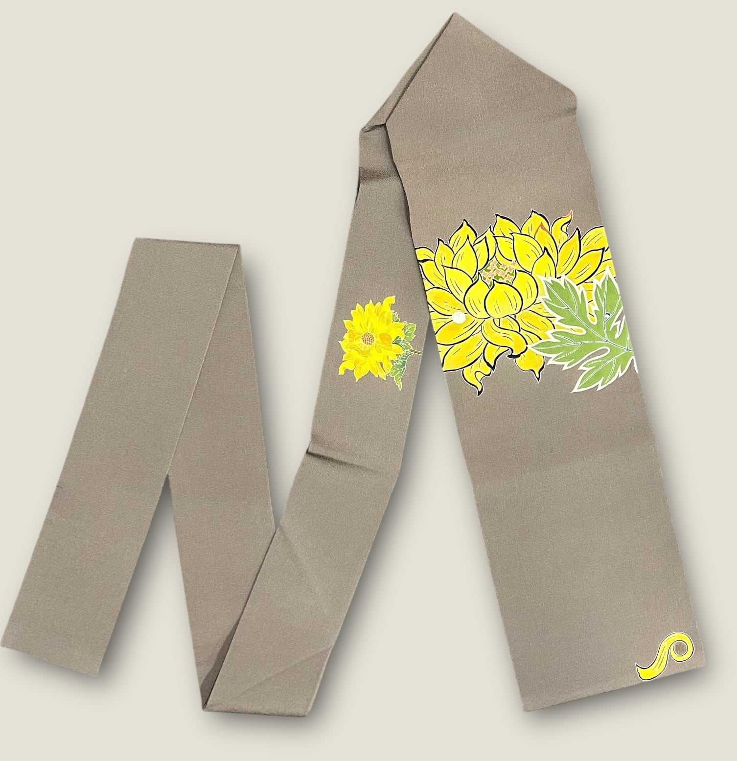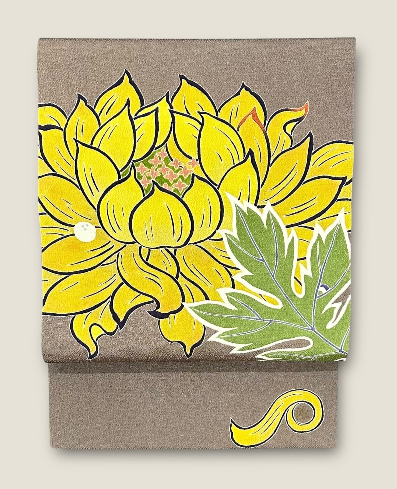 美しい濃いめの胡桃染色の地に大胆に描かれた大きな黄色の花が目を引く名古屋帯のご提案です。程よいハリのあるちりめん地は、着用時に心地よさを感じさせ、その独特の存在感を引き立てます。たれ先には黄色のワンポイントが配されており、個性豊かな印象を与えます。関東巻と関西巻で前腹の柄が異なるため、お好みに合わせたスタイリングが楽しめます。