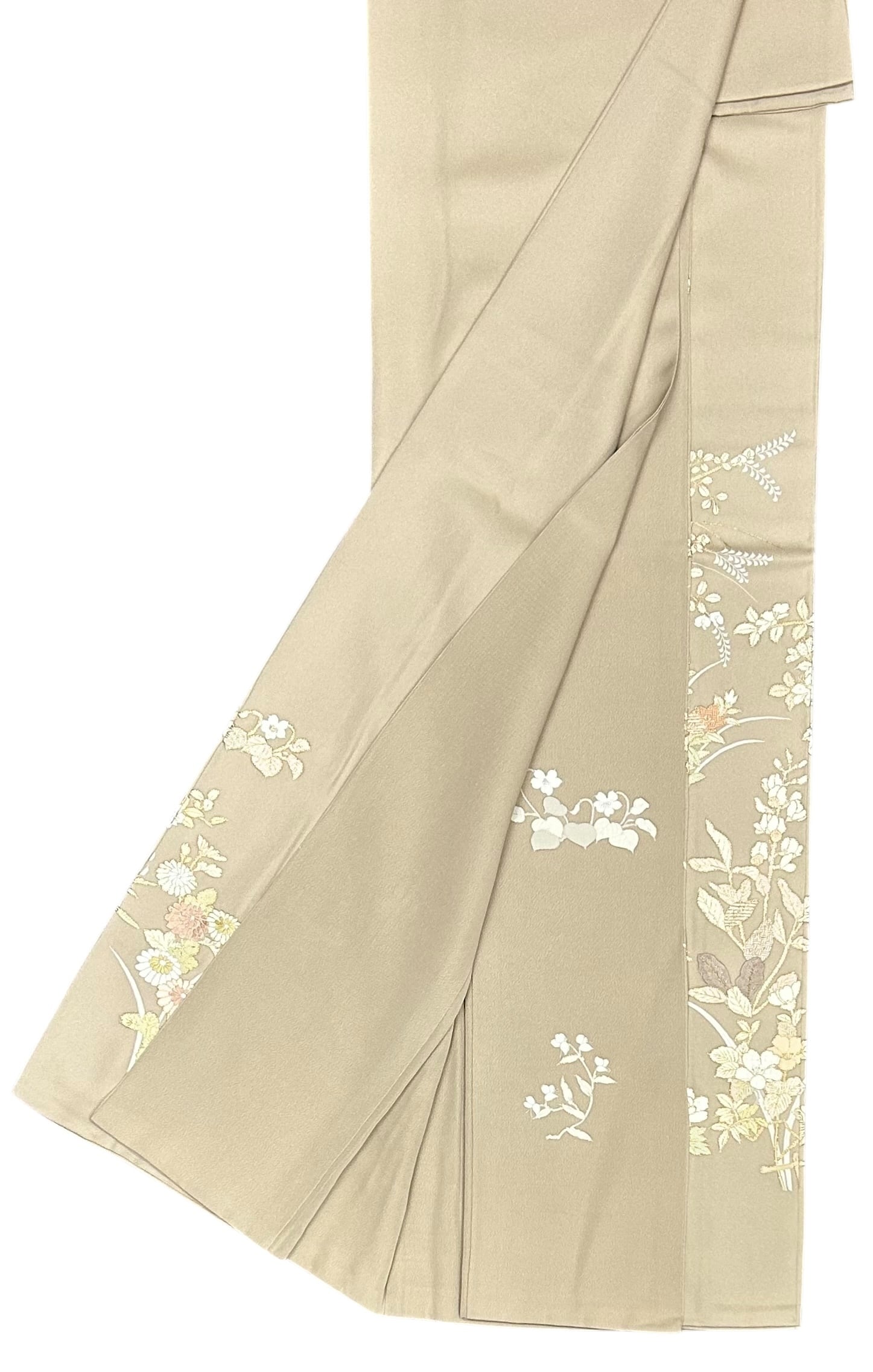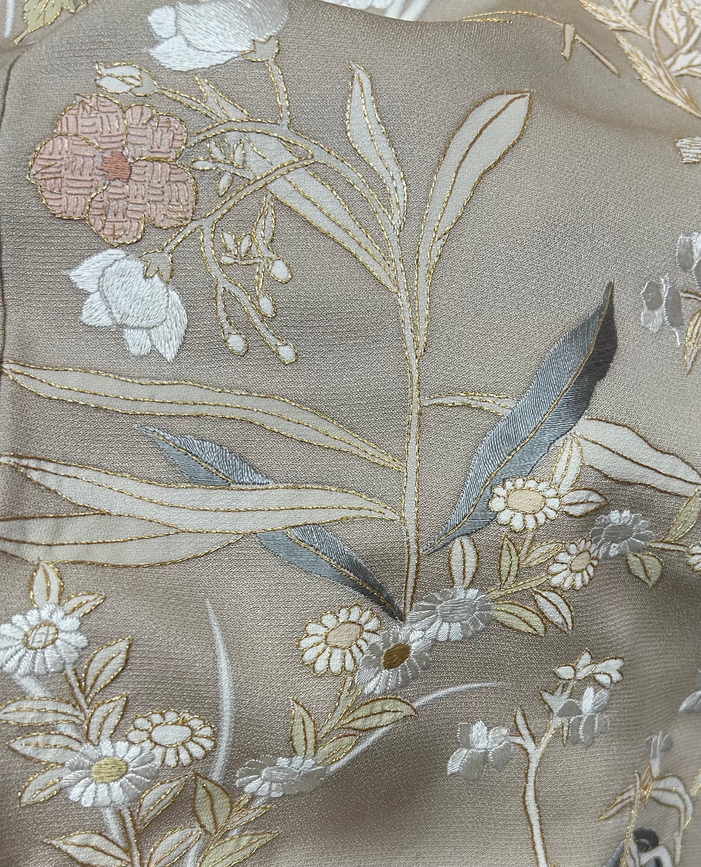 美しい暗めの薄香色の地に施された豪華な草花の刺繍柄が魅力的な訪問着のご提案です。優しく淡い色合いの白、ときがら茶色、薄い柳色などが絶妙に組み合わさり、高い技術力を感じられる一品となっています。ハリのあるさっぱりとした地は、着用時に心地よさを感じさせ、その独特の存在感を引き立てます。