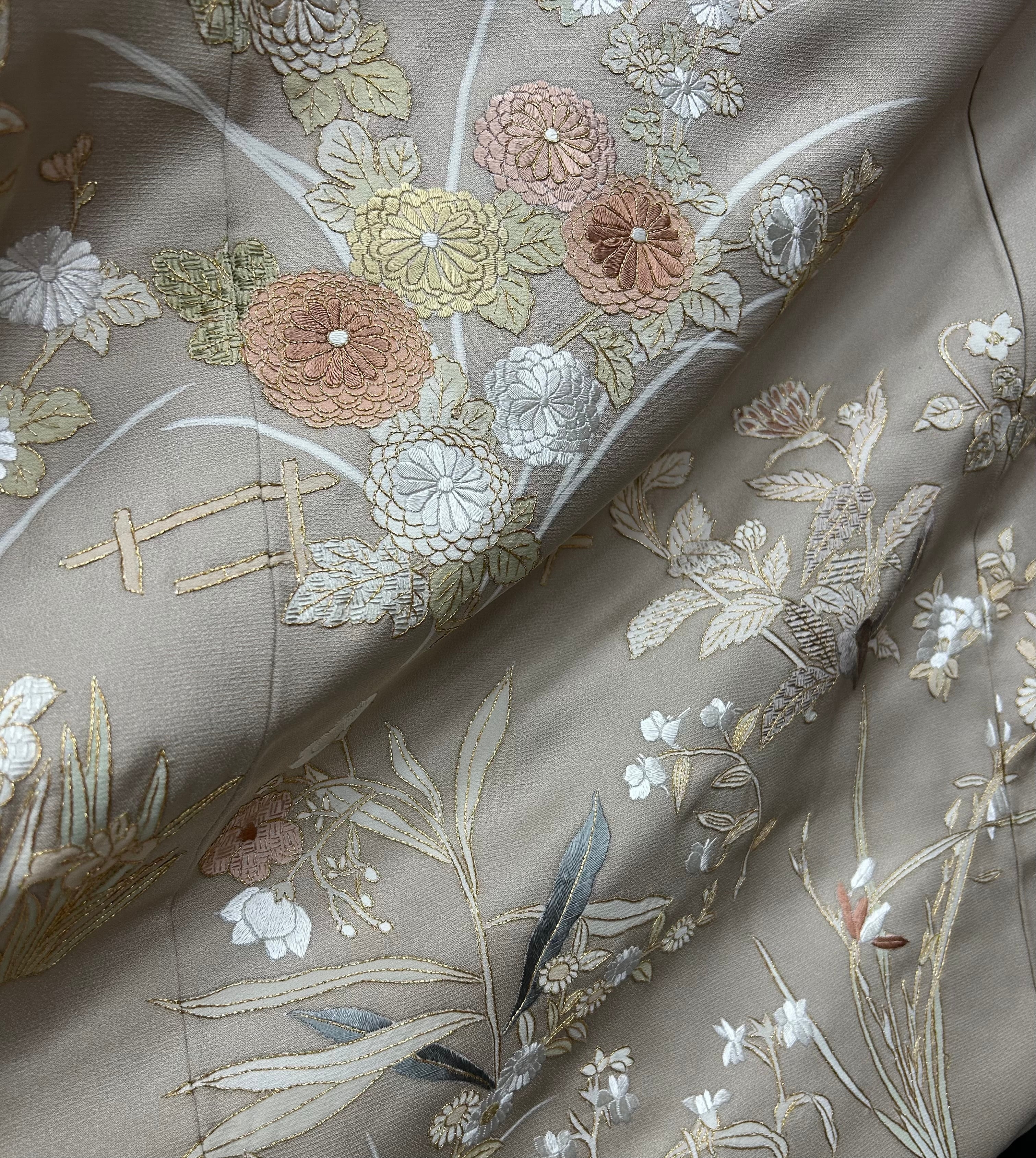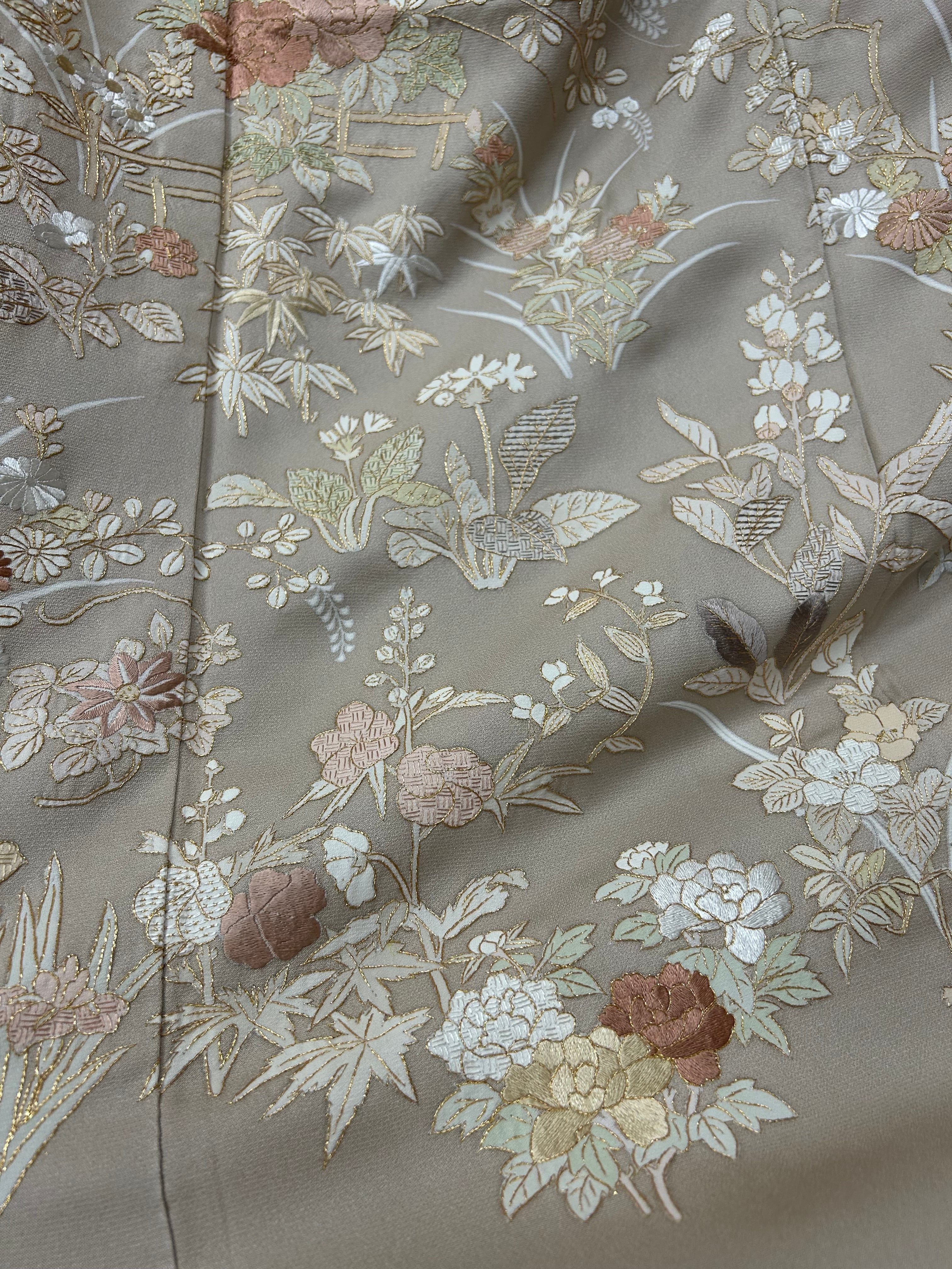 訪問着 暗めの薄香色 豪華な草花の刺繍柄 裄丈 70㎝ K5093