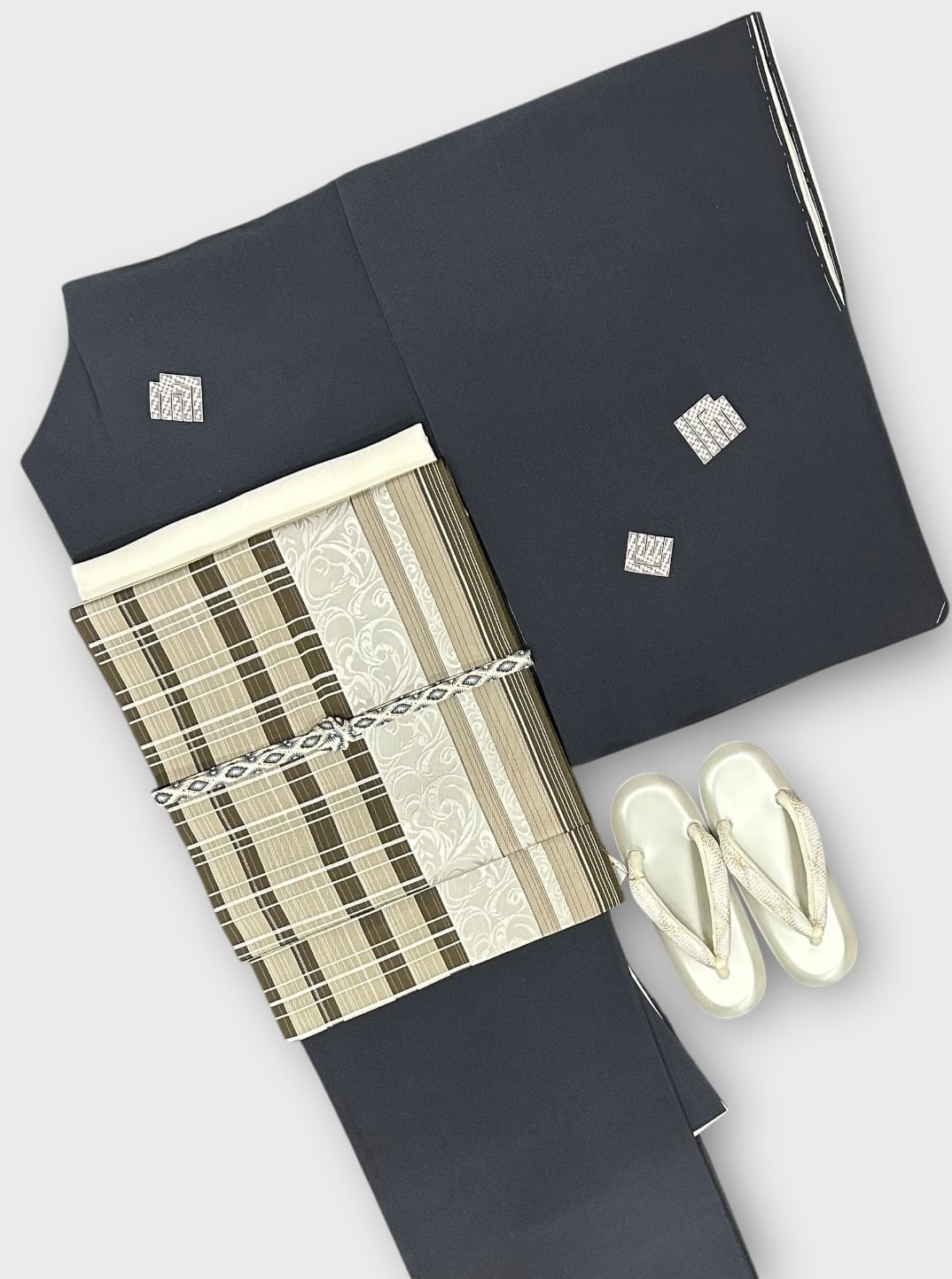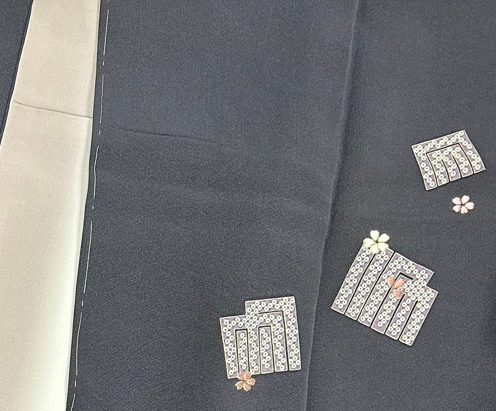 美しい暗めの鉄御納戸色の地に、源氏香柄が施された付下げのご提案です。源氏香には、薄色の疋田柄に、白やピンクの桜の花びらが所々に刺繍されており、上品さと華やかさを兼ね備えた一品となっております。ハリのあるさっぱりとした地は、着用時に心地よさを感じさせます。