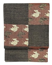 金糸が織り込まれた美しい黒と渋めの小豆色の市松の地に、生成り色や黒と金糸で施された 荒磯文のお洒落な袋帯のご提案です。軽くハリのある地は、着用時に心地よさを感じさせ、その特別な存在感を演出します。