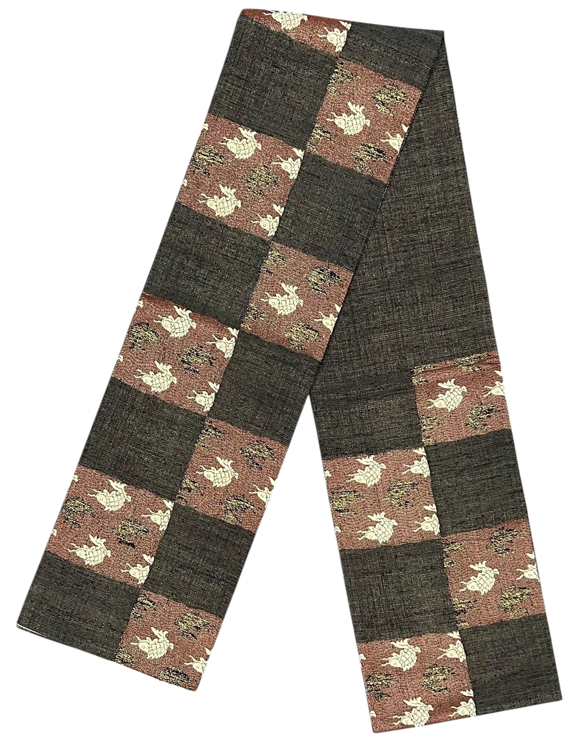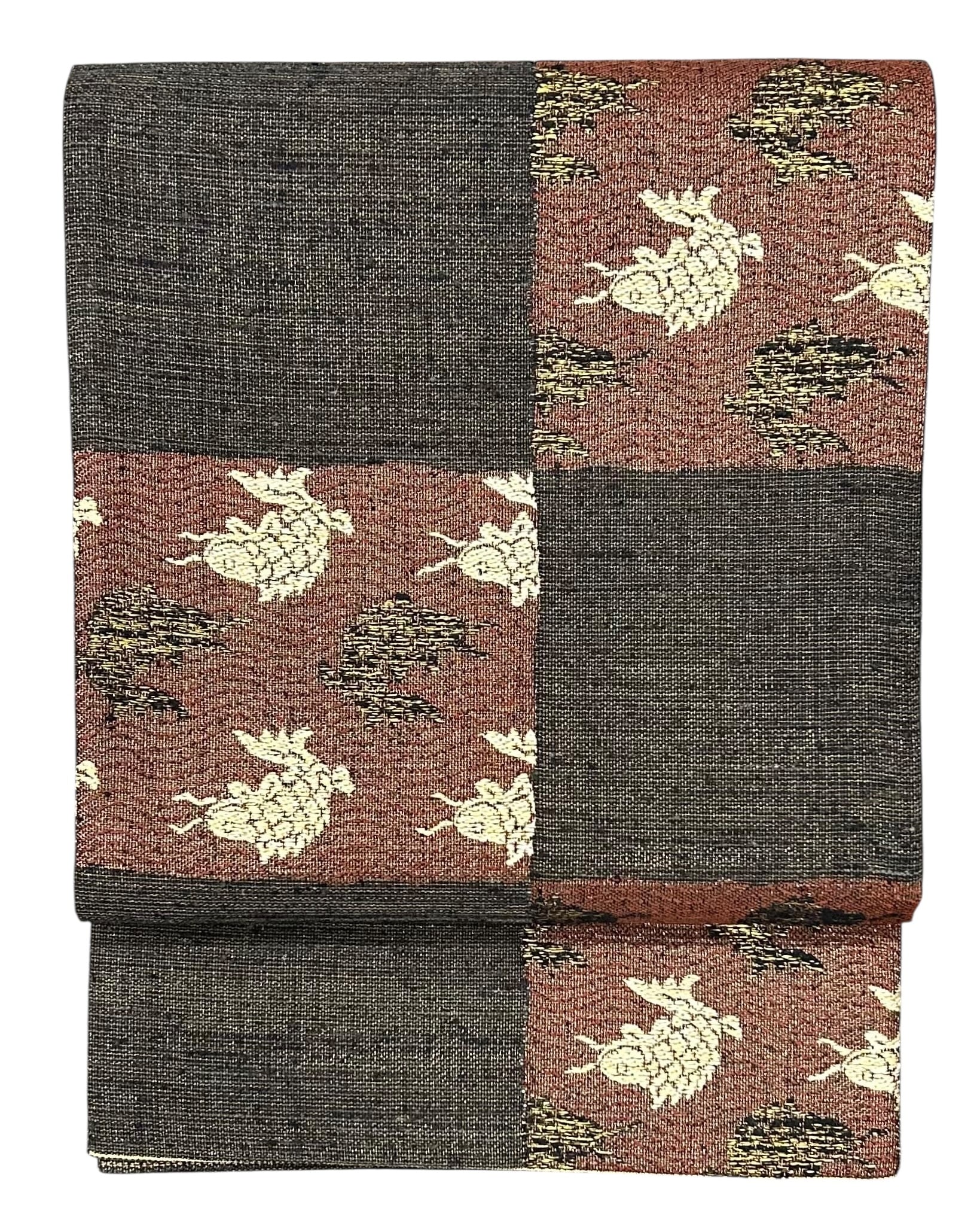 袋帯 リバーシブル 金糸が織り込まれた黒と渋めの小豆色 市松模様 荒磯文 未使用品 長さ 442㎝ Q5017