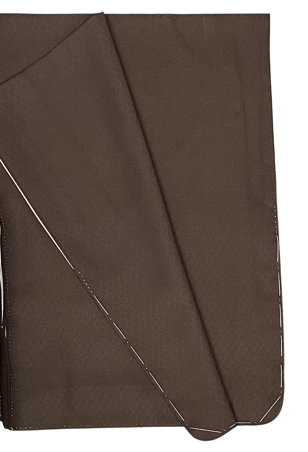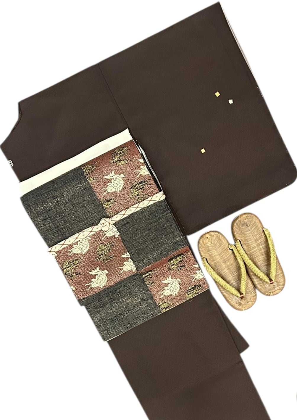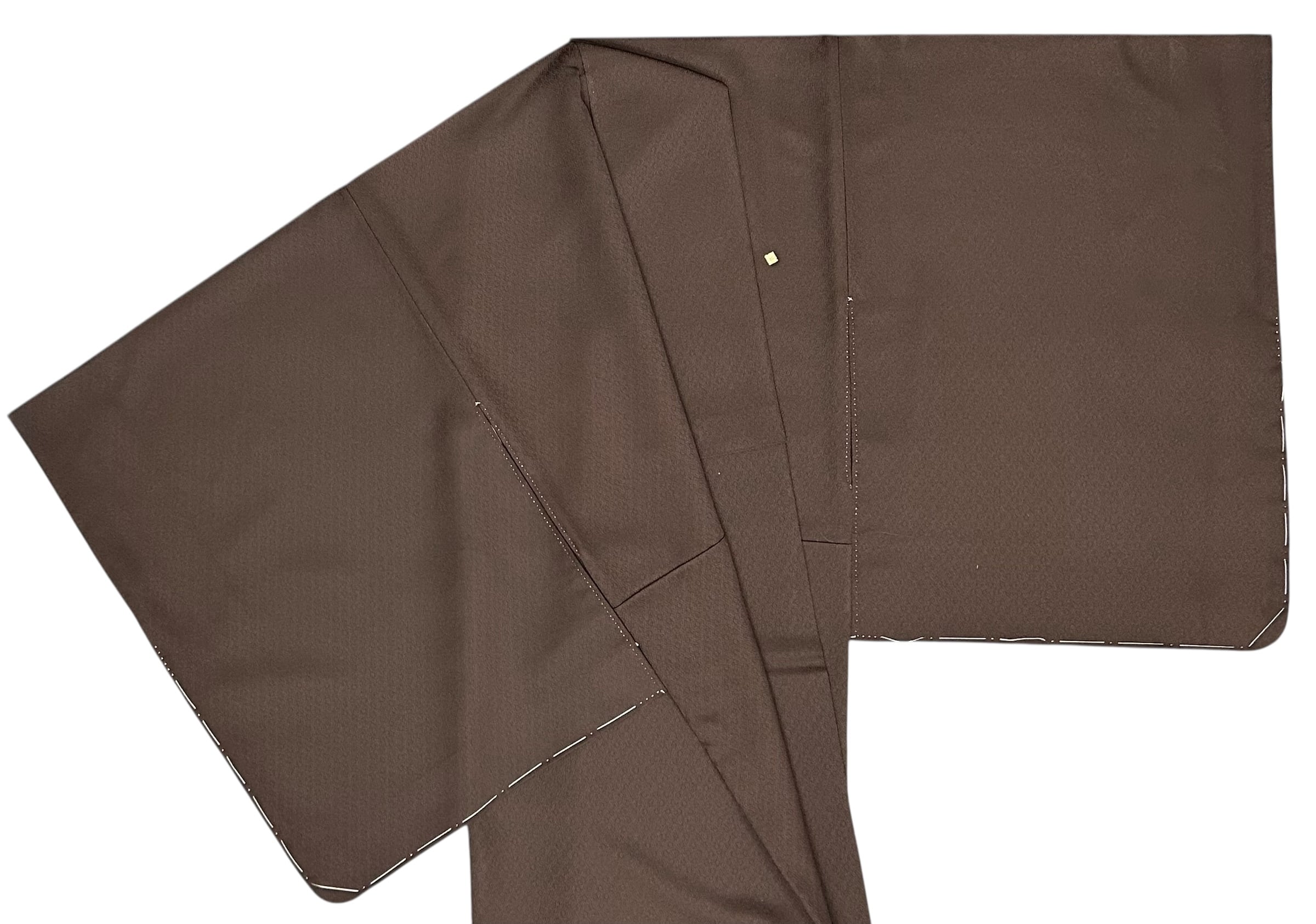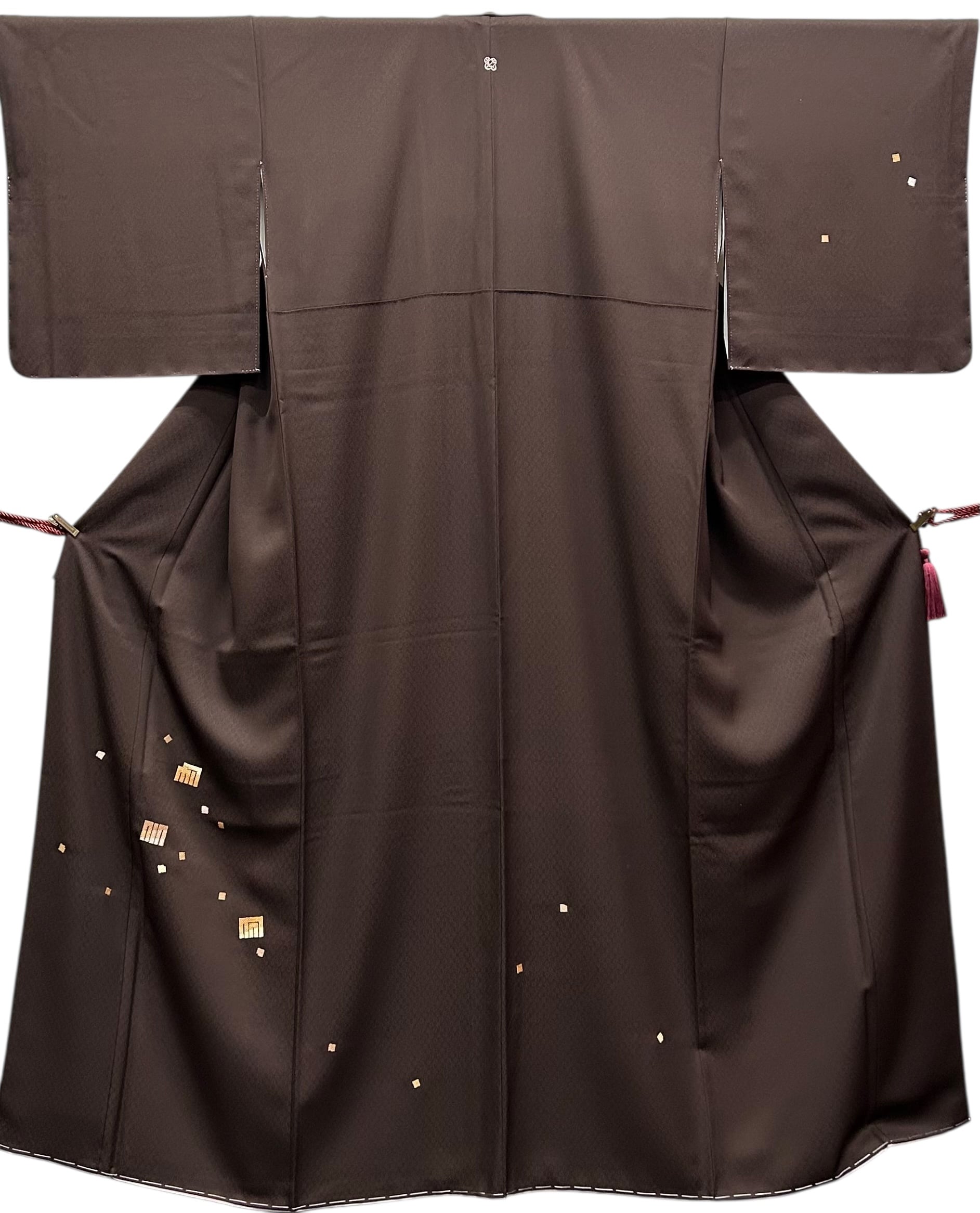 細かい菱形のような地紋のある 濃い目の煤竹色の美しい地に、飴色のような所々金色にも見えるお色味の源氏香と、はらりと舞う紙吹雪が施された付下げのご提案です。ハリのある地は、着用時に心地よさを感じさせ、その特別な存在感を引き立てます。ガード加工済み。一つ紋(縫い紋)、しつけ糸つき。