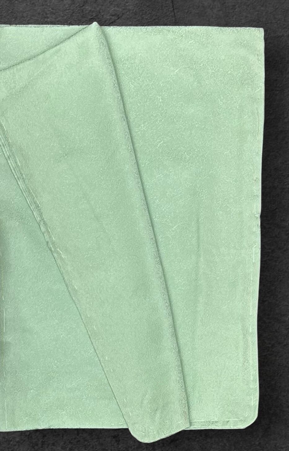 色無地 ペーズリー柄のような地紋 薄萌葱色の地 一つ紋 しつけ糸つき 裄丈63 ㎝ K5179