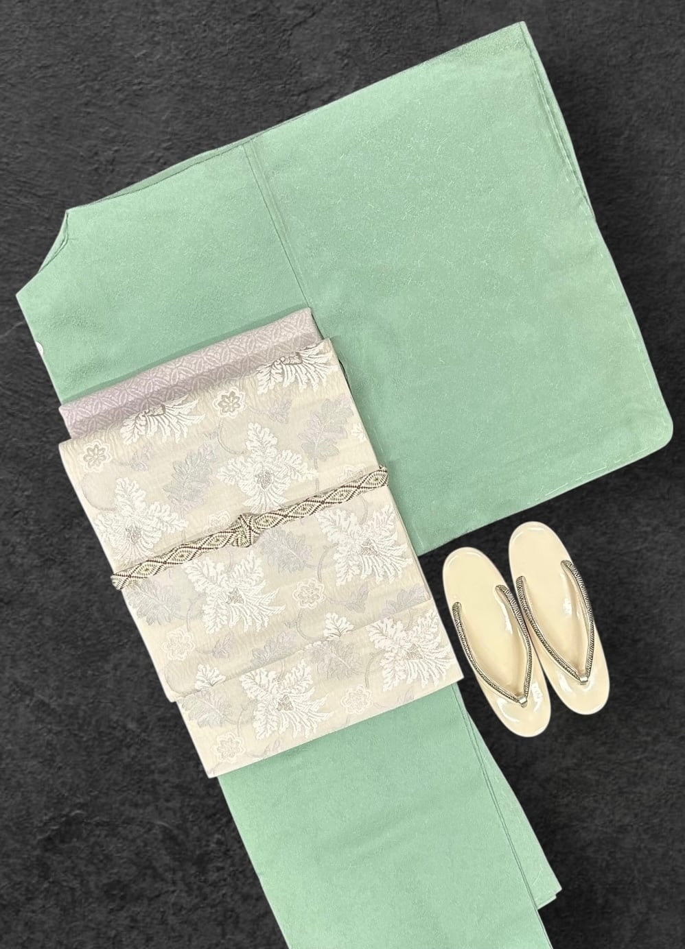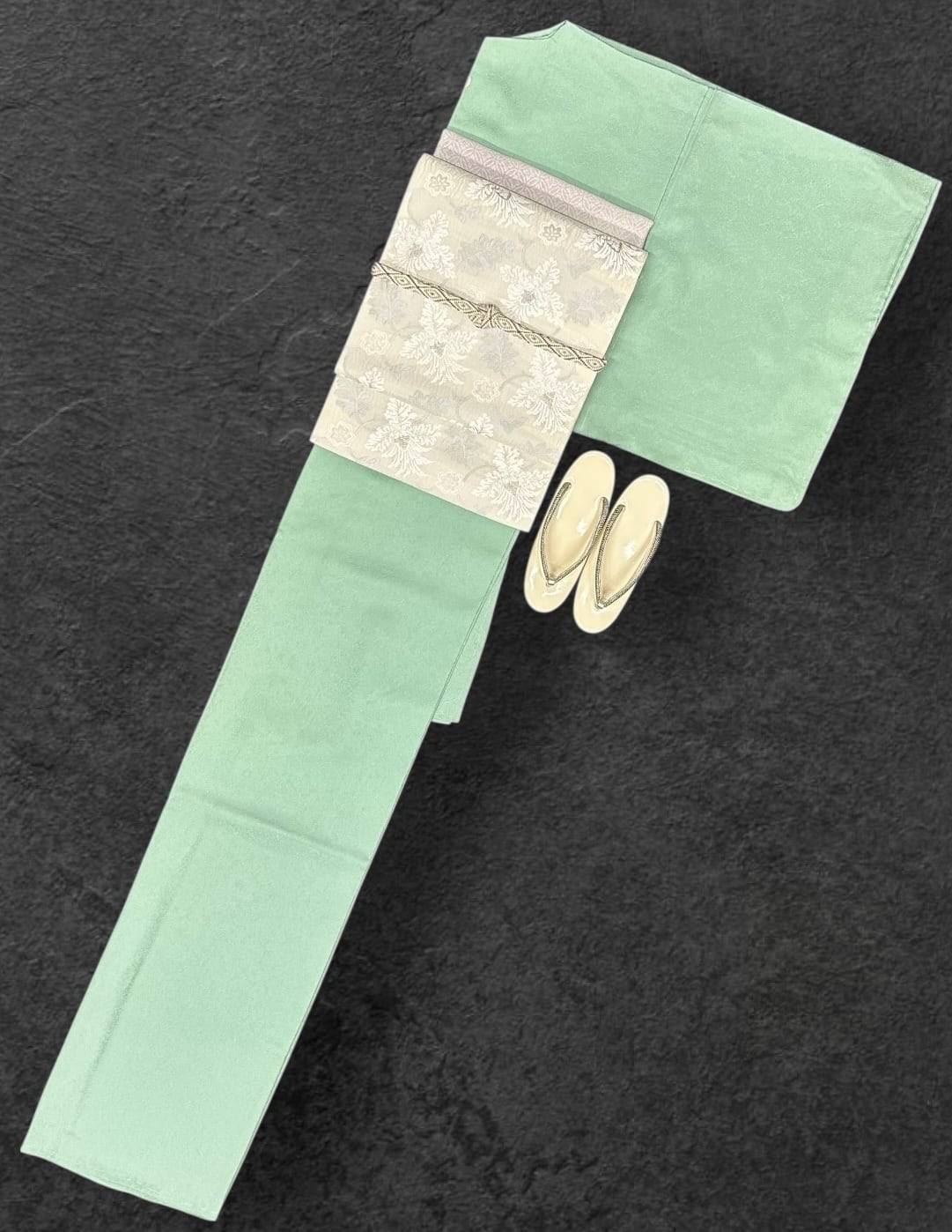 ペーズリー柄のような地紋が施された色無地のご紹介です。ほんのりと光沢のある薄萌葱色の地に、一つ紋が入っており、しっかりとしたハリ感のある地は、さっぱりとした着心地を感じさせ、その特別な存在感を引き立てます。しつけ糸つき。