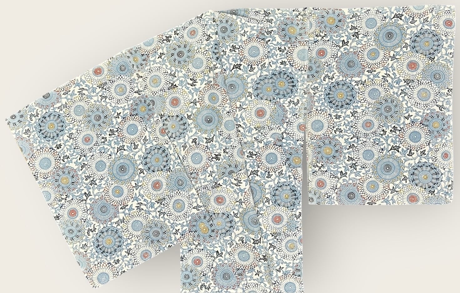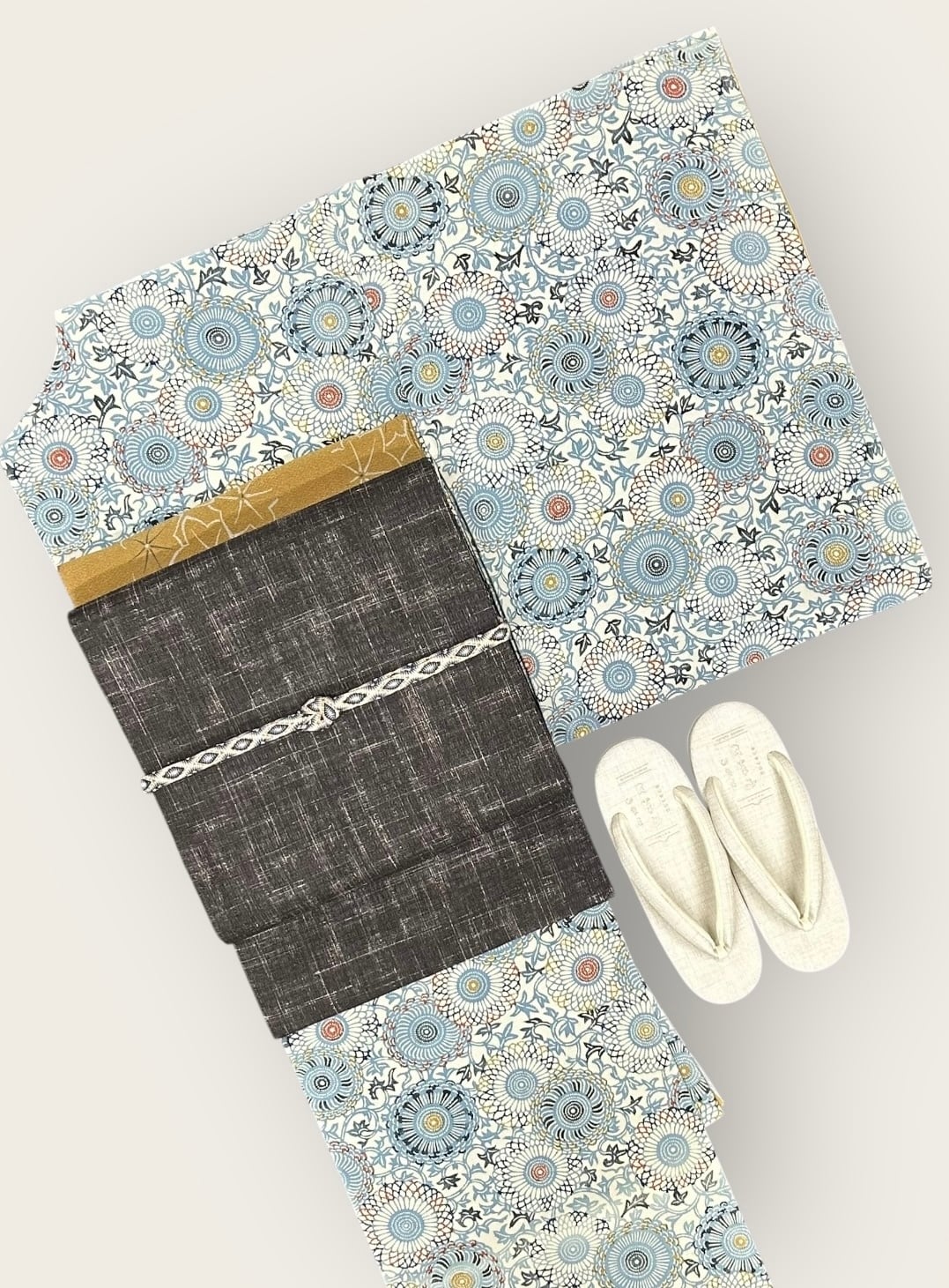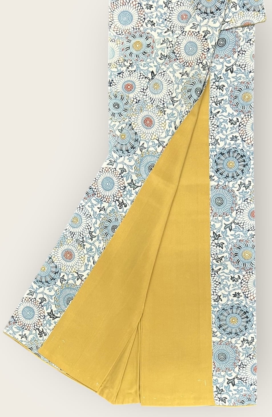 藍染の型染め小紋の美しいお着物のご提案です。くすんだ灰白色を基調とした地に、秘色色や藍色の濃淡が重なり、山吹色や褐色の染めでお洒落な唐花模様が施されており、見る人を魅了する一品です。ほんのりとしたハリ感は、着用時に心地よさを感じさせ、その特別な存在感を引き立てます。しつけ糸つき。