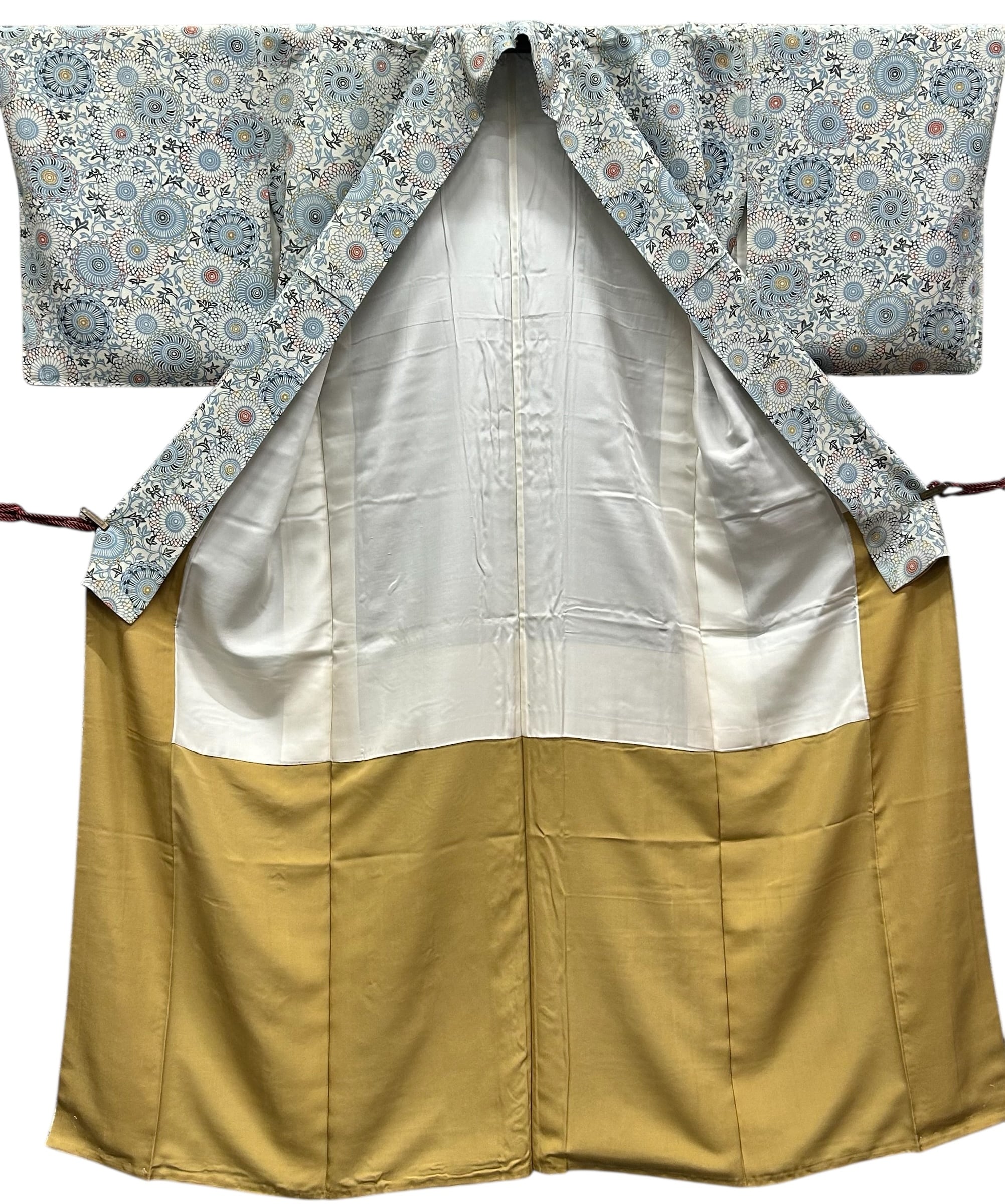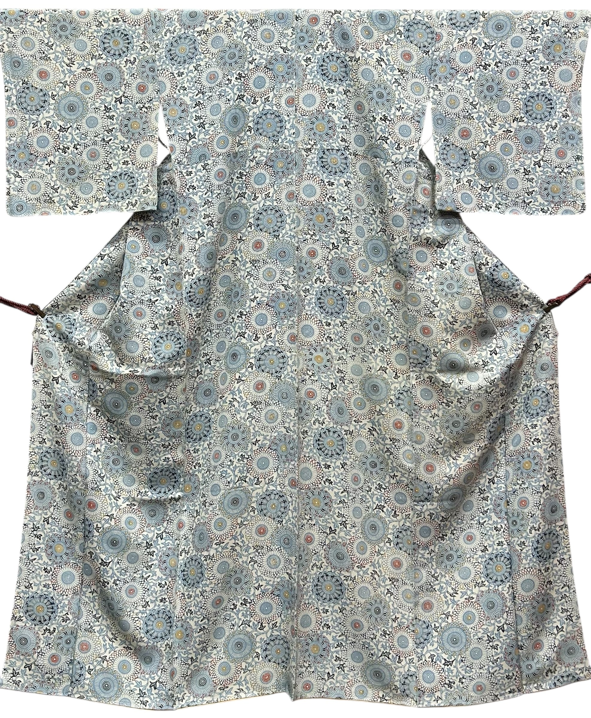 小紋 藍染 型染め くすんだ灰白色の地 お洒落な唐花模様 しつけ糸つき 裄丈 68.5㎝ K5190