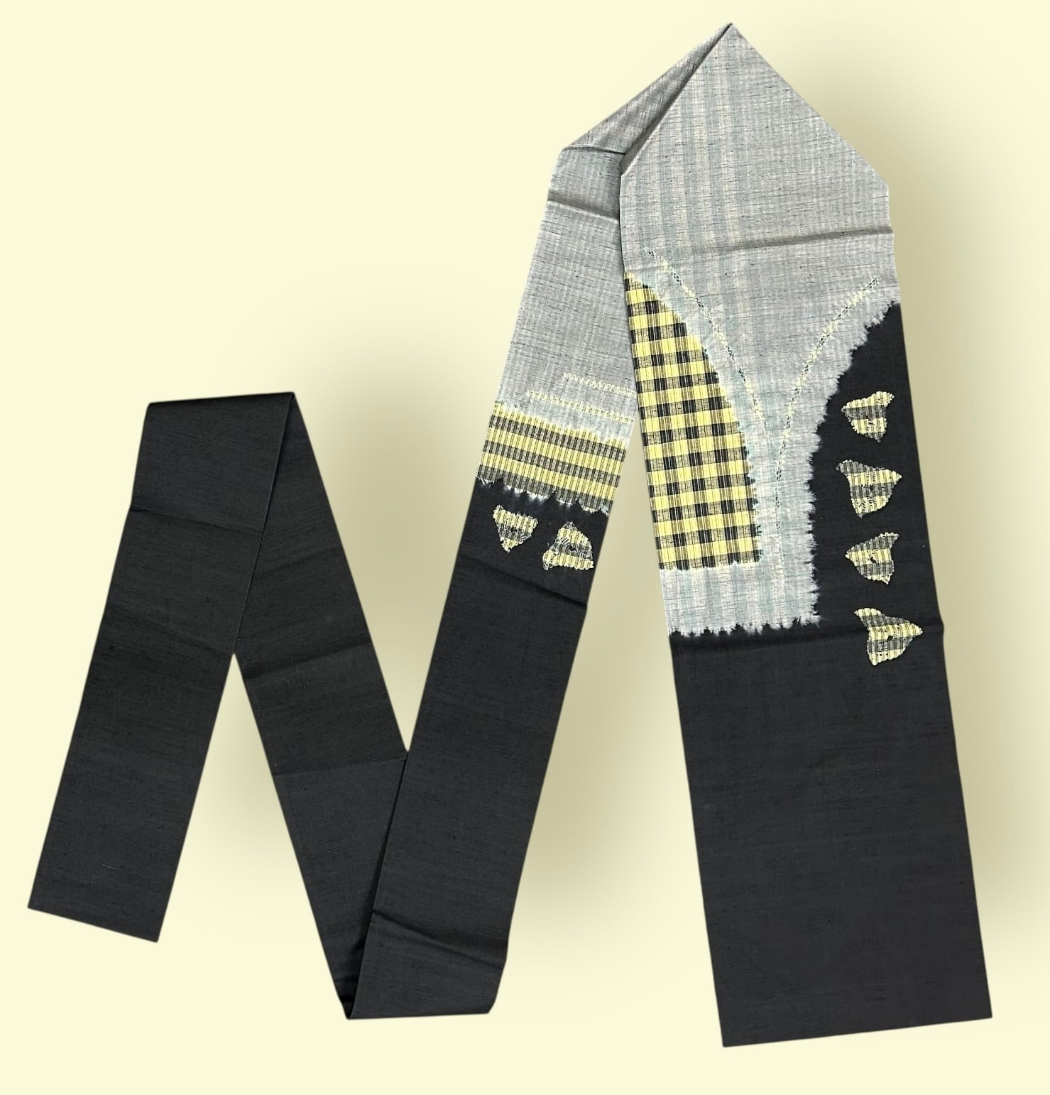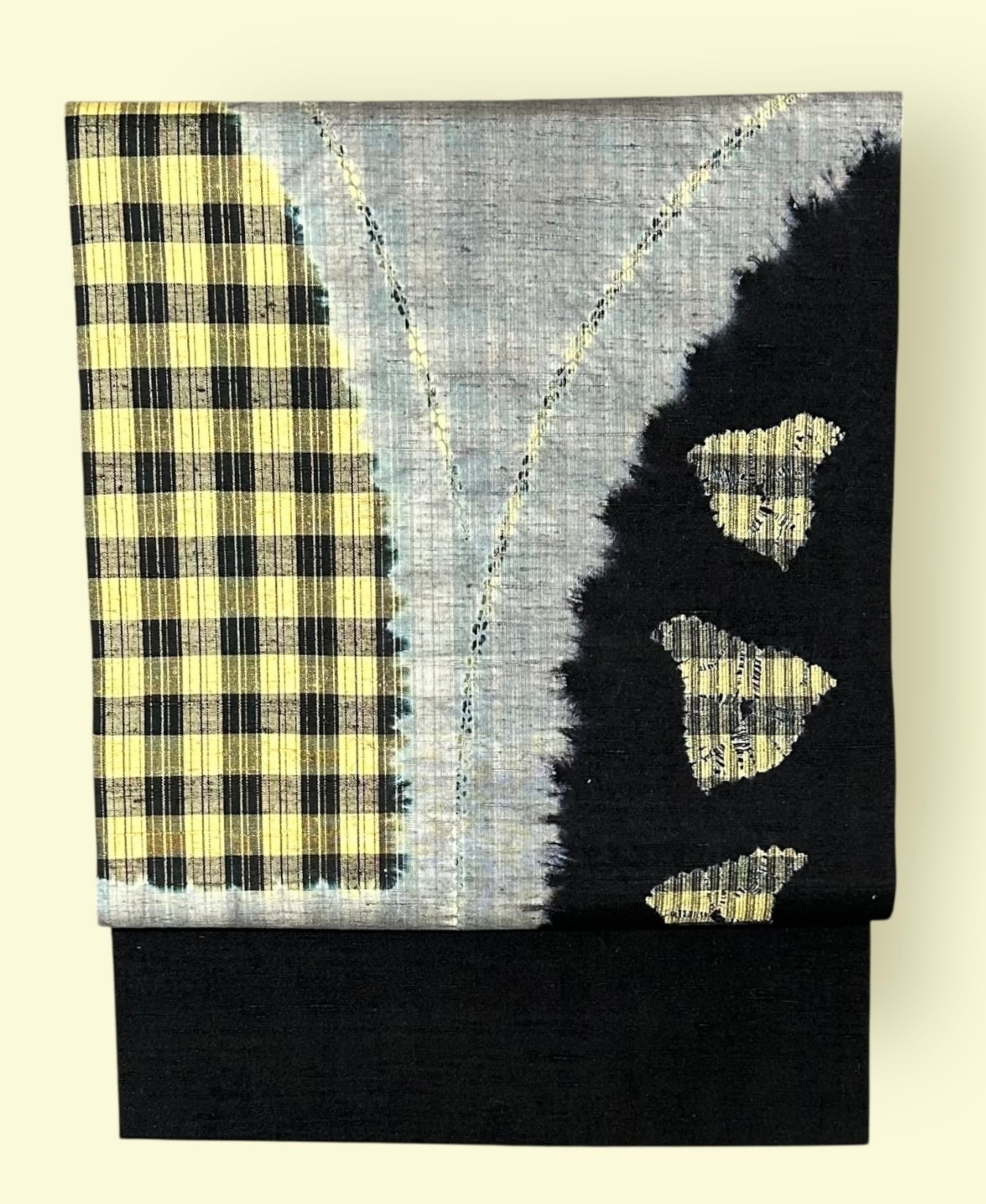 こちらの名古屋帯は、黒地と枯色の格子柄としばらくの千鳥が魅力的で可愛い一品です。灰色の染め模様と千鳥のような絞りが絶妙に調和し、とても凝った仕上がりとなっています。しっかりとしたハリのある地に、 手触りの良いシボ感が美しさが引き立ちます。