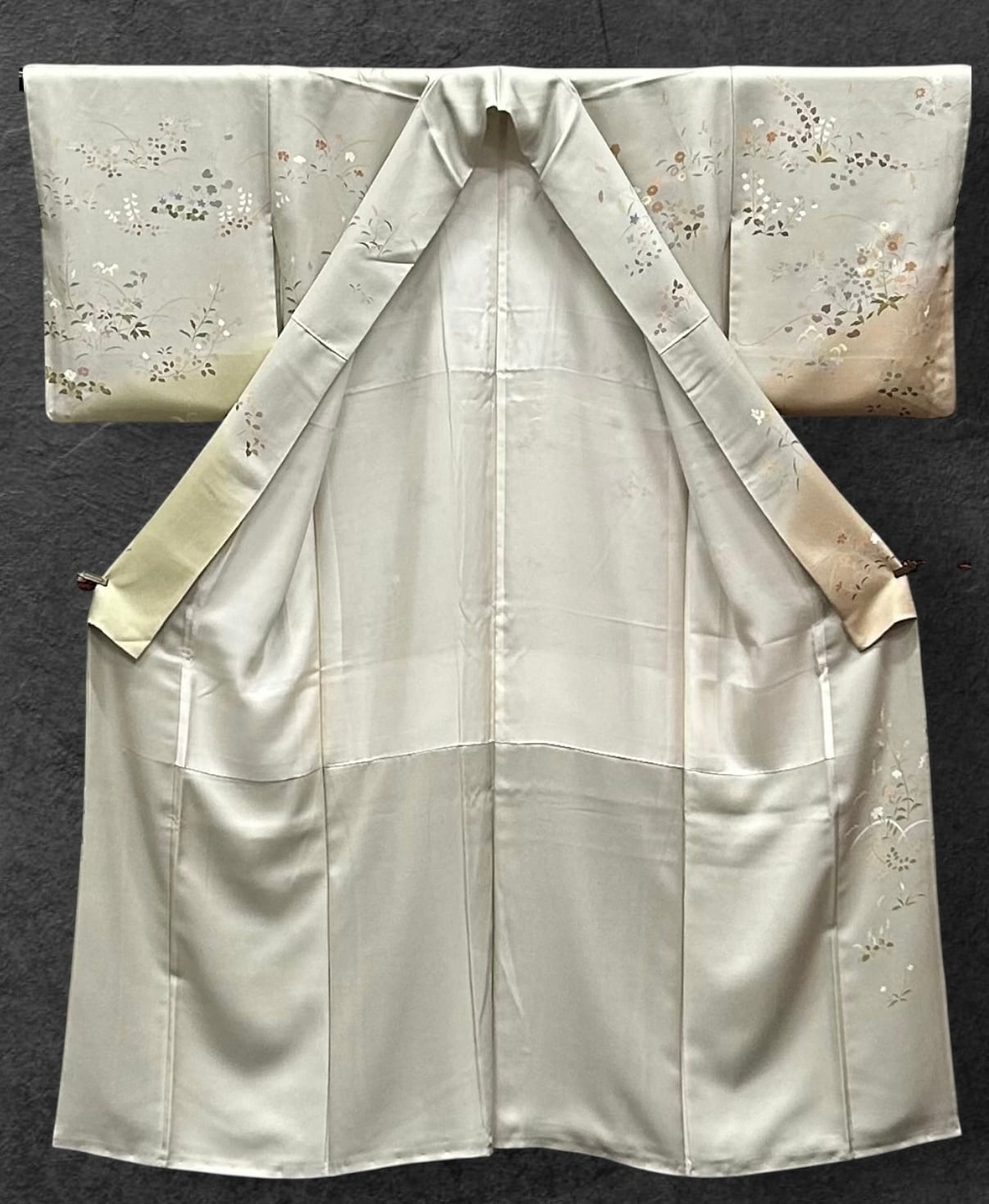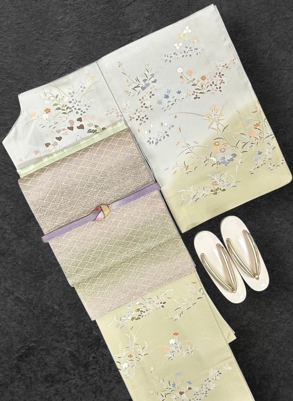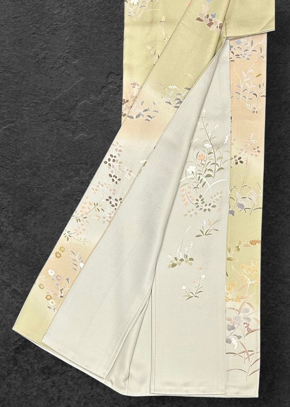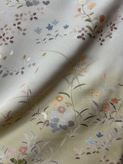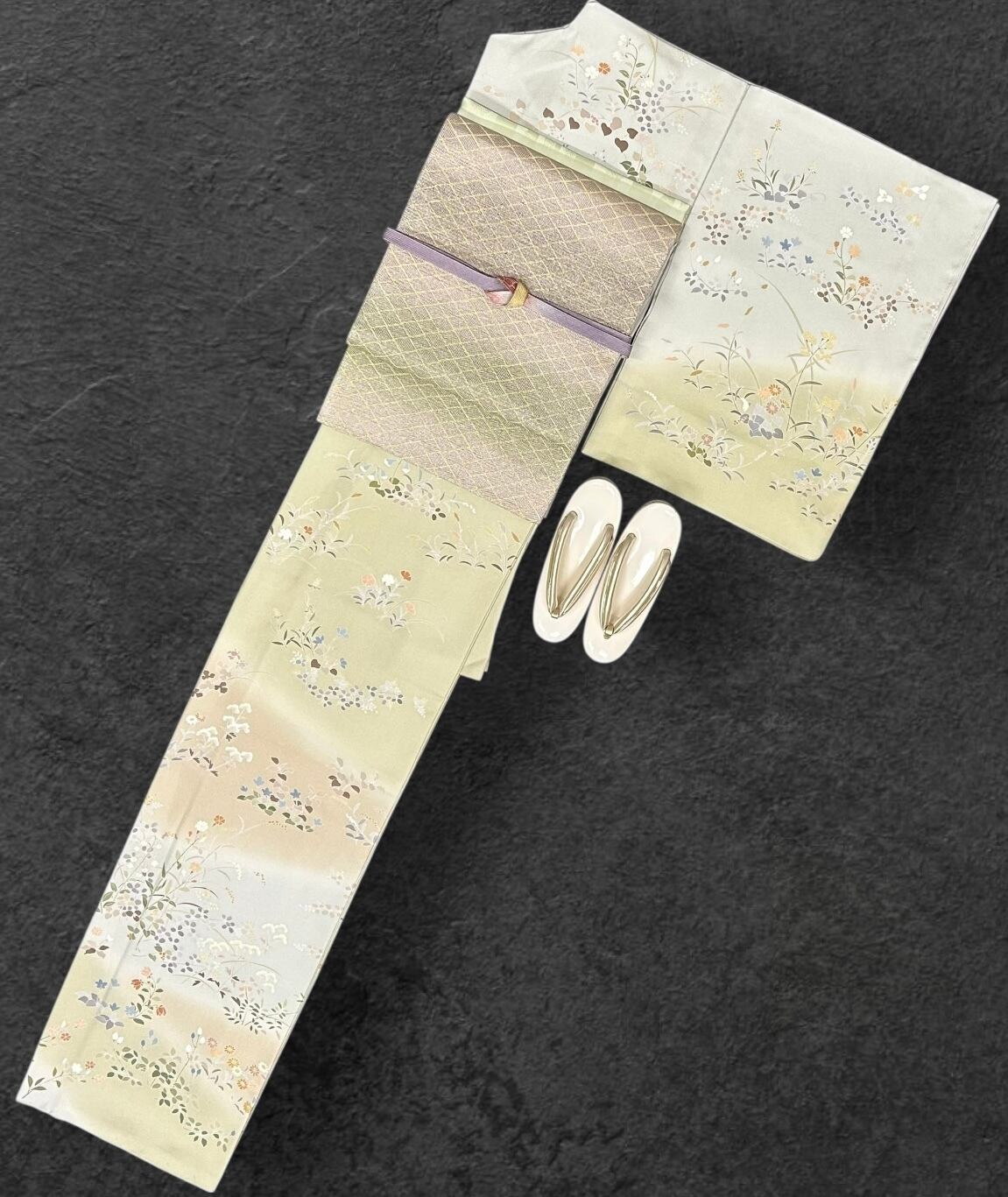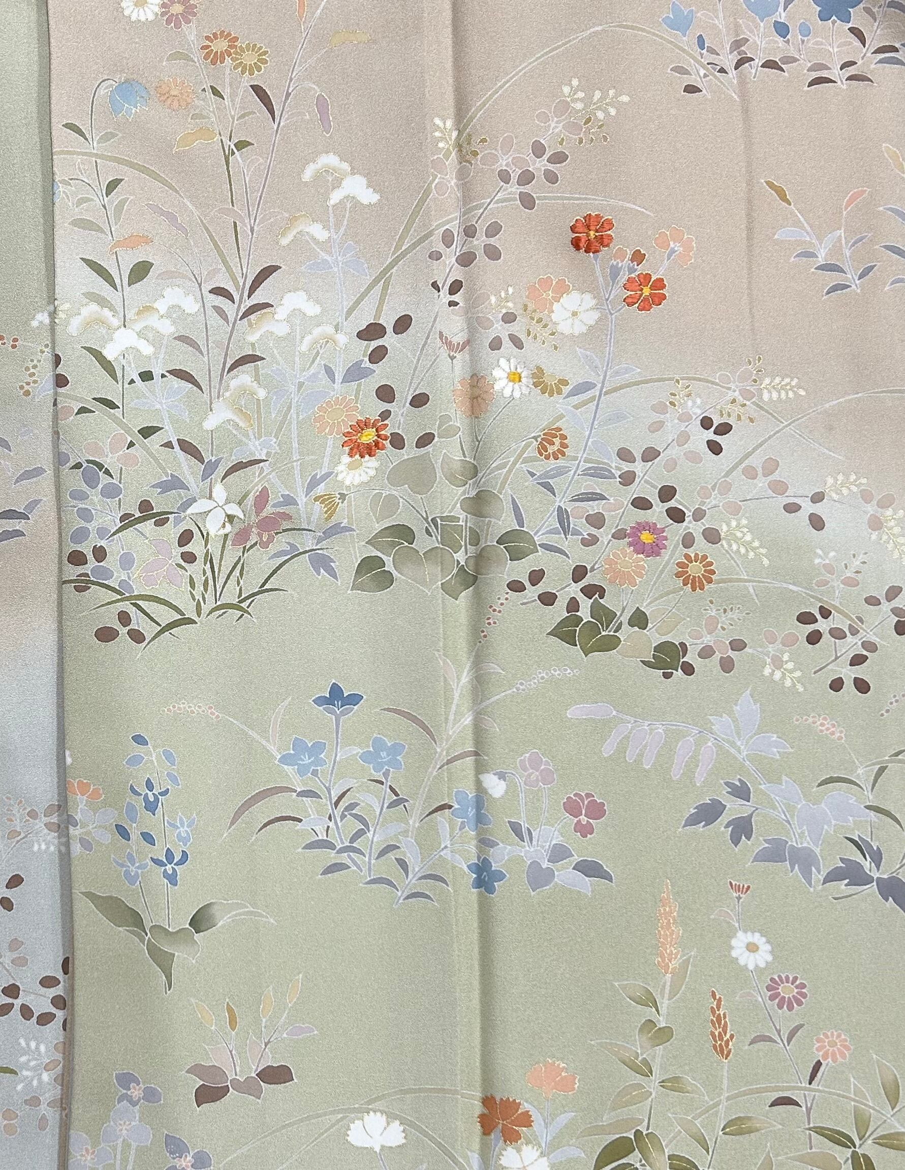 こちらのお着物は、穏やかな優しいお色味の付下げ小紋です。緑が濃い目の灰黄緑色から薄い抹茶色、そして薄い伽羅色などへのぼかしの地に、上品な草花が全体に広がり、所々金色で囲まれている美しいデザインです。ハリがありさっぱりとした肌触りが魅力で、着用時には優雅な存在感をもたらします。ガード加工済み。