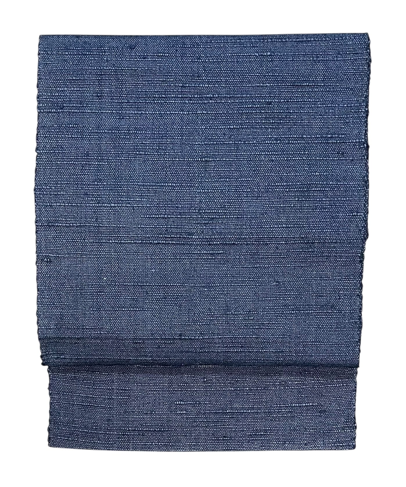 若干くすんだ留紺色がシックな印象を与えるこちらの八寸帯は、紬地に松葉仕立てで、無地のシンプルさが魅力です。フシが多めの太い糸が織り成す柔らかな地は、着用のシーンを一層引き立てます。