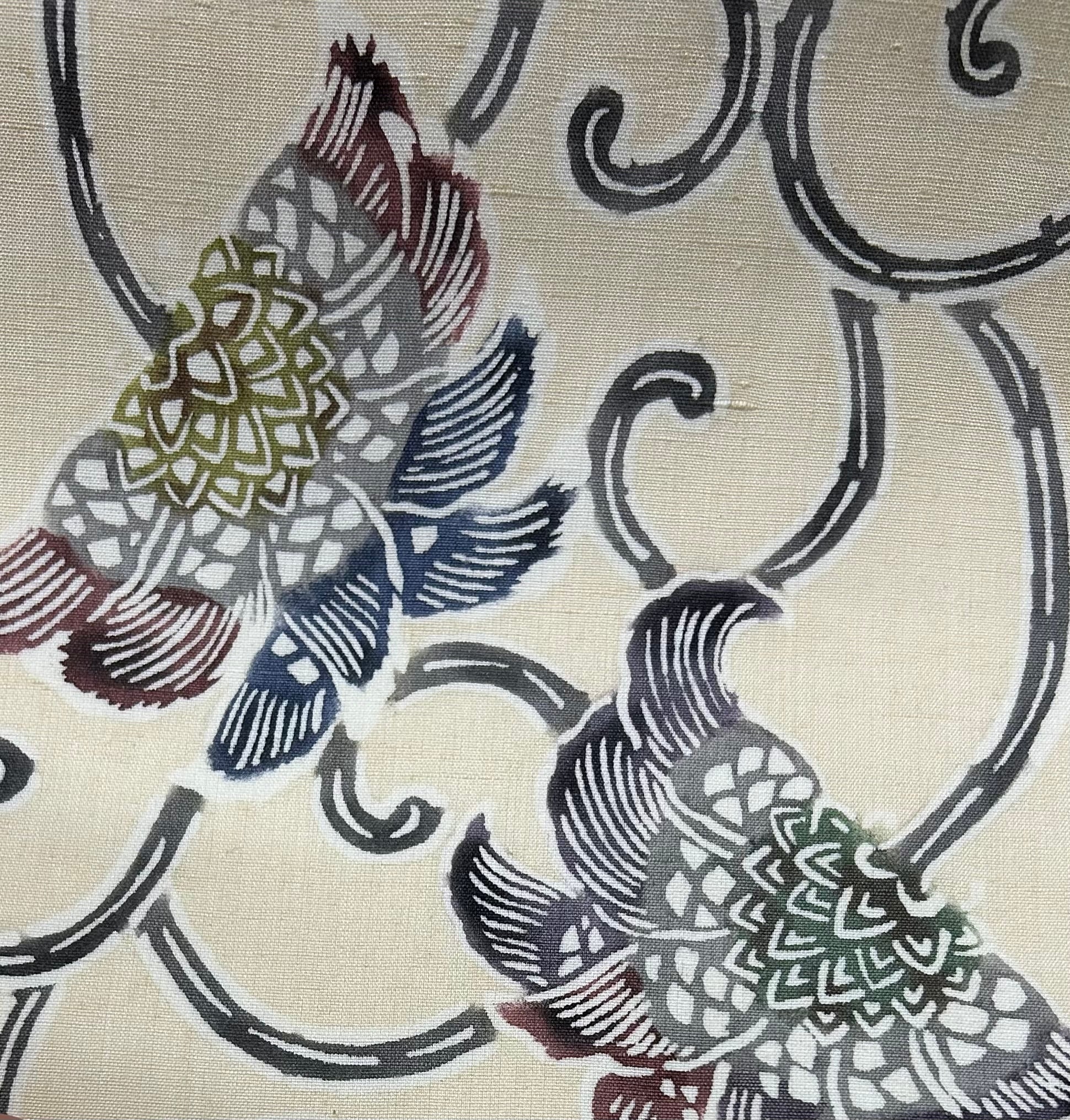 こちらは、鳥の子色に型染めの唐花模様が美しい名古屋帯です。墨色、鉄御納戸、赤銅色、鶸色、木賊色といった多彩な色合いの濃淡で染められており、見る人を惹きつける深い魅力を持っています。ハリのある紬地は、着用することでその存在感を一層引き立てることでしょう。