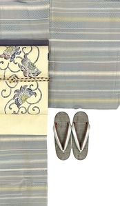 こちらは、光沢のあるグレー系の美しい紬です。利休鼠、白橡、亜麻色、榛色、御召御納戸色といった多彩な色合いが絶妙に溶け合い、見る者の目を惹きつけるきらめきがあります。光の当たり具合によって変わる玉虫のような輝きと、花織のような模様が横段に施されています。薄くつるっとした手触りも魅力の一つで、着用するたびに心地良さを感じられます。