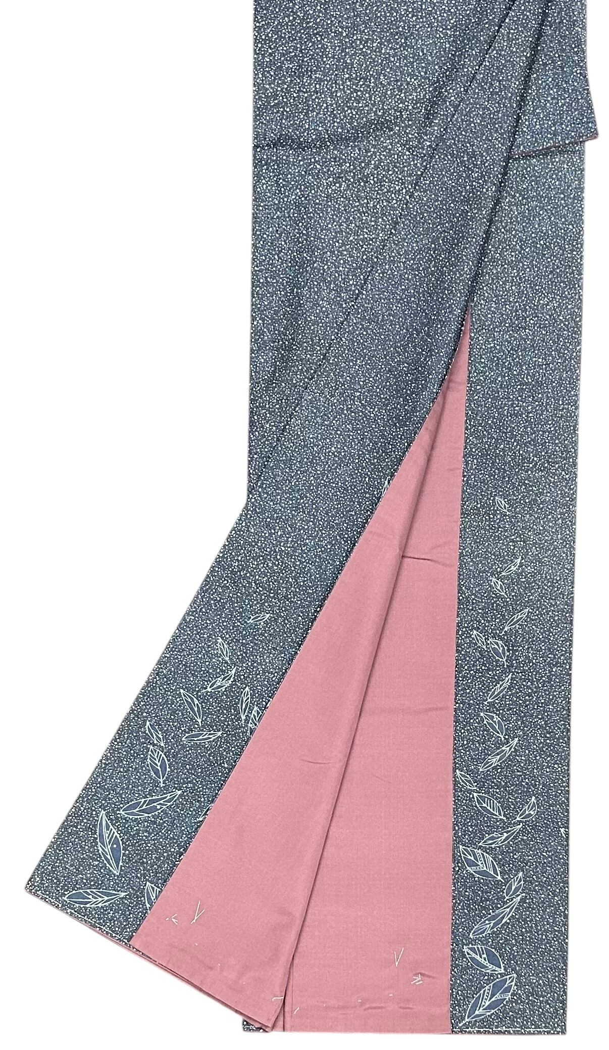 こちらは京の名工・川村久太郎さんによる素晴らしい付下げです。美しい御召納戸色がベースとなり、鉄御納戸色や生成り色などの点が重なり合った独特の地模様が特徴です。濃い目の秘秘色に縁取られた紺鼠色の葉が、全体に華やかな印象を与えています。柔らかめの肌触り、落款、しつけ糸つき。