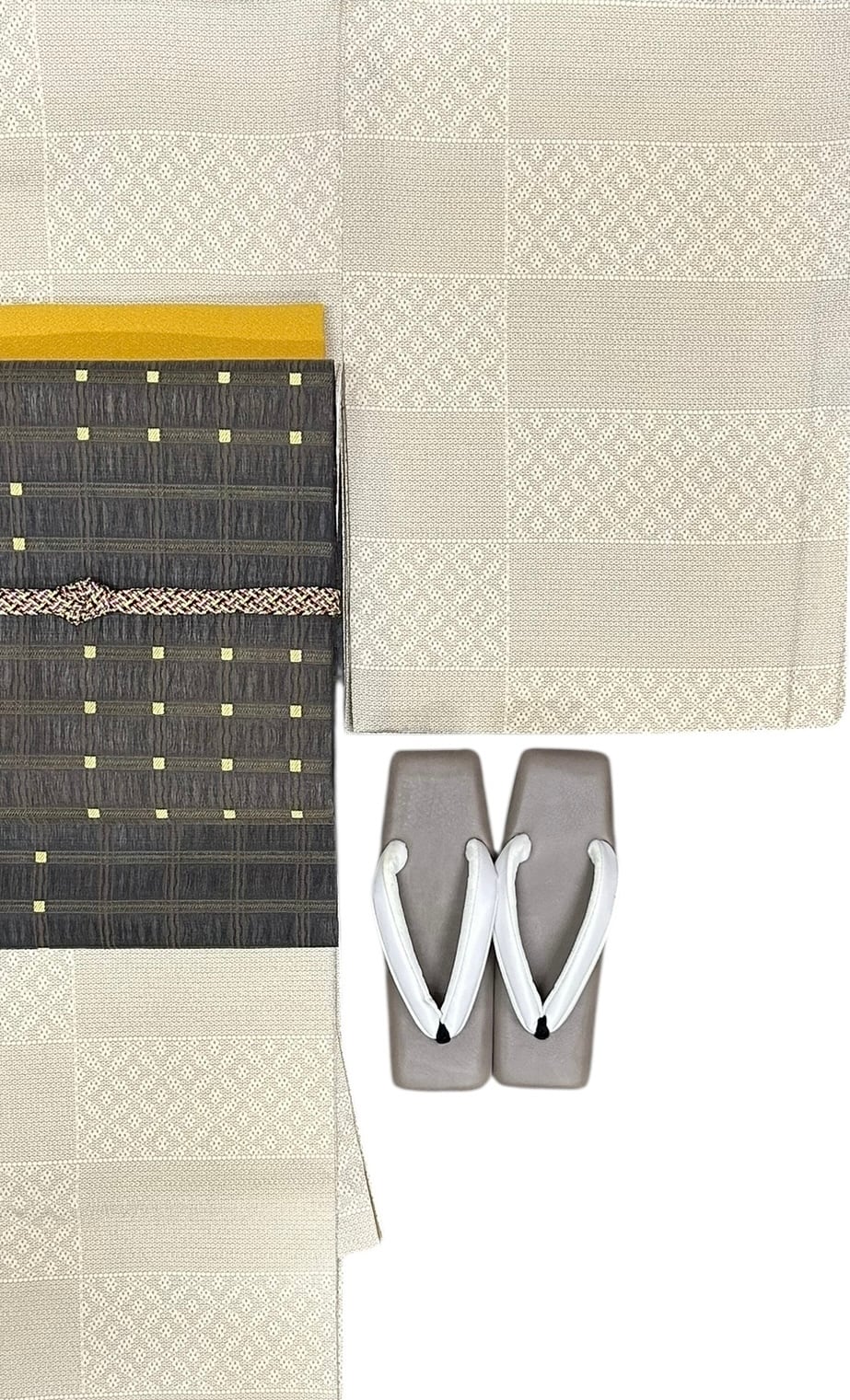 こちらは、練色と墨黒色が見事に融合した、贅沢な塩沢のお着物です。きめ細かな亀甲絣に七宝柄が施されており、非常に凝った織りがその魅力を際立たせています。程よいハリとさらっとした肌触りが特徴で、着心地も抜群です。しつけ糸つき。