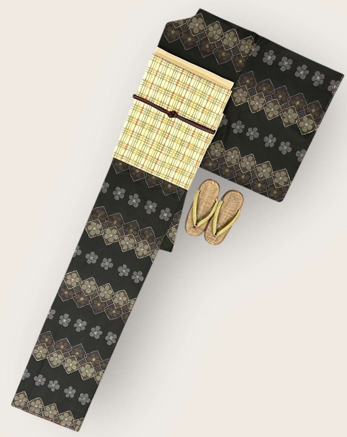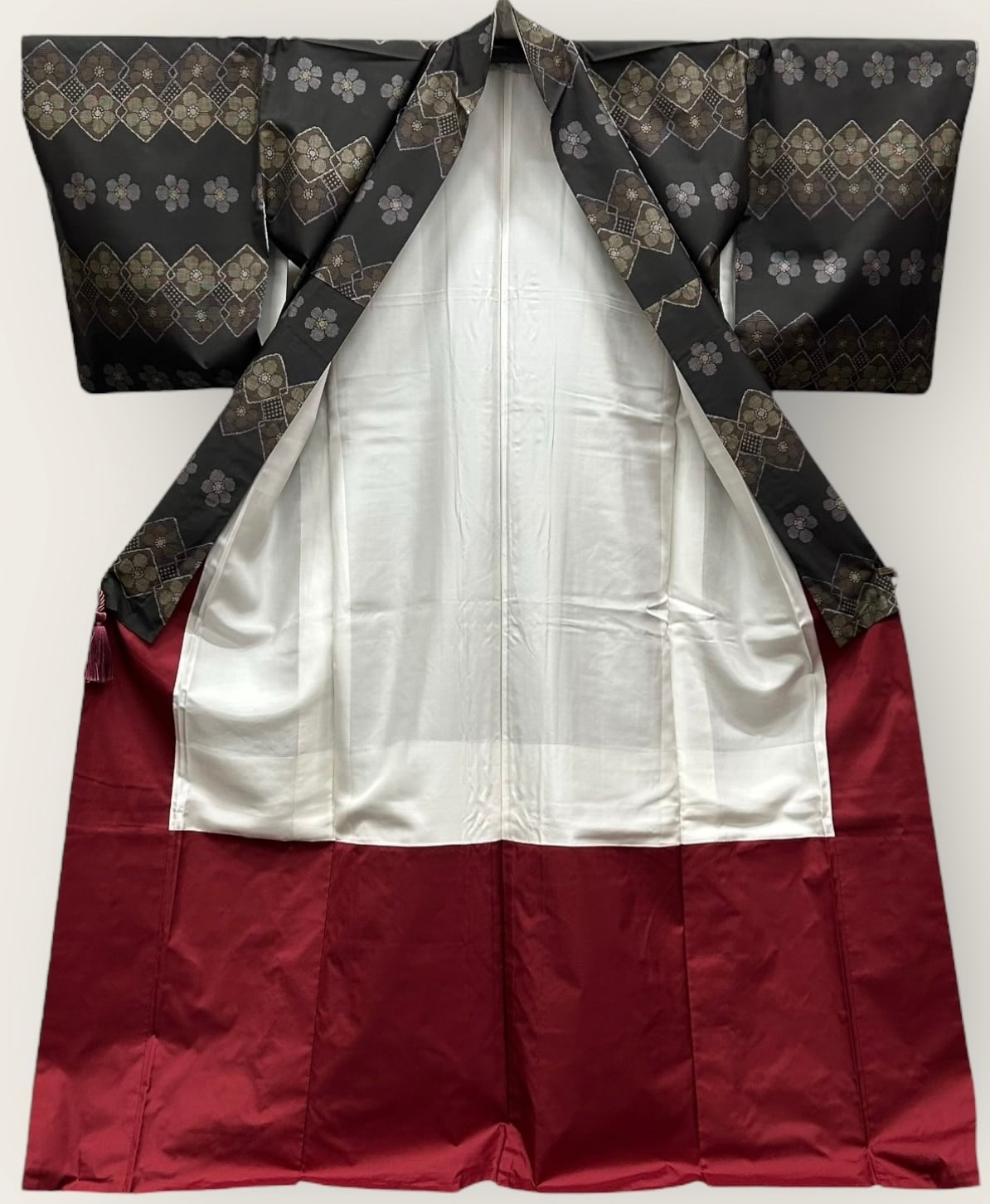 こちらは、風格ある大島紬のお着物 です。黒地にかわいらしい花びらと色合いに癒されるデザインは、見る人を魅了します。ハリがあり、シャリっとした肌触りが特徴で、着用するたびに心地良さを感じていただけます。証紙、反端、しつけ糸もついており、安心してお選びいただける一品です!