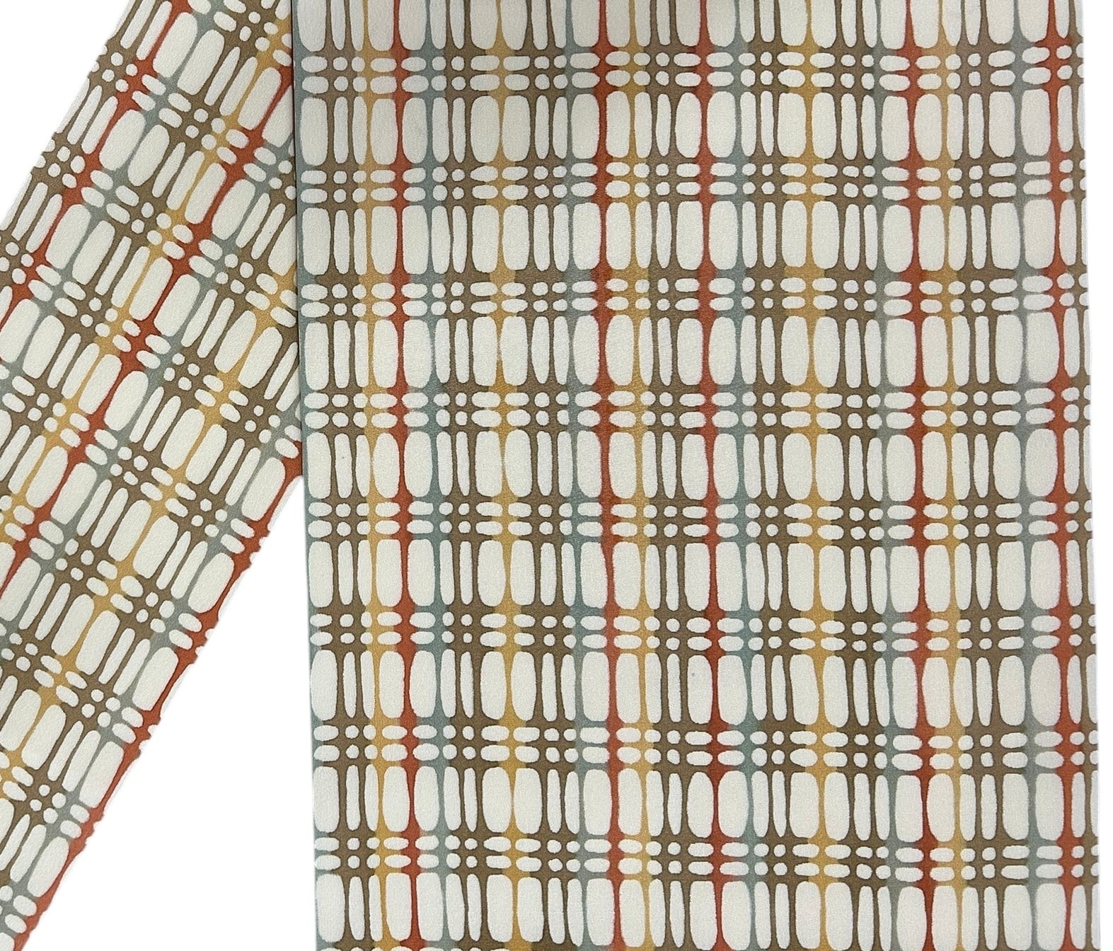 こちらは、型染の美しい名古屋帯です。砥粉色の地に、片面全通の幾何学模様が施されたデザインは、おしゃれを一層引き立てます。柔らかめの地は、肌触りも心地良く、着用時のストレスを軽減します。お色味は飴色、駱駝色、枯茶色、豆がら茶色などと多彩で、様々なコーディネートが楽しめる一品です。