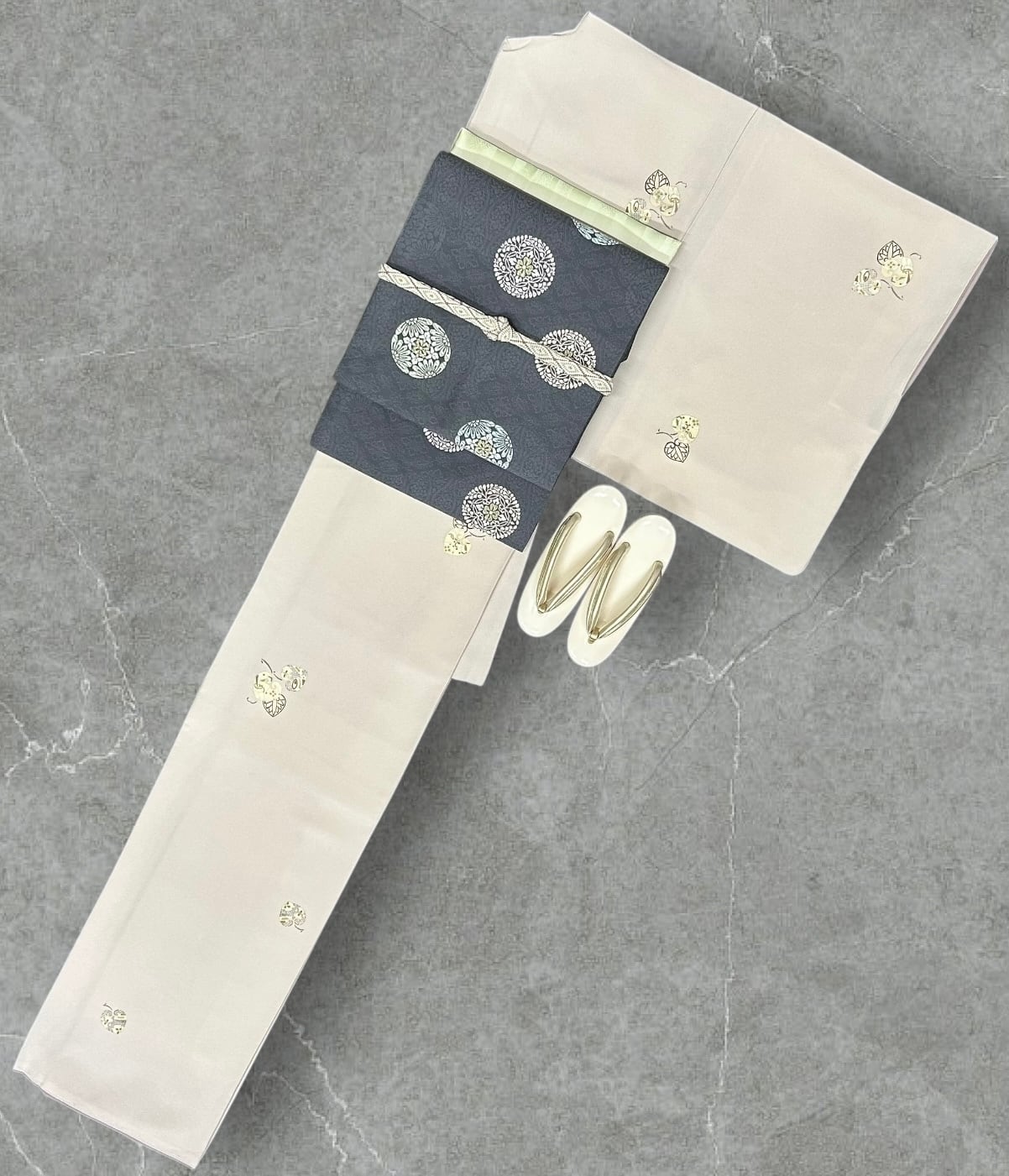 こちらは、優雅な名古屋帯 です。鈍色の地に施された立涌文や菱文の地紋は、上品な雰囲気を醸し出し、桜色 白藍色 若葉色などと金糸の優しいパステル調の丸文が華やかさをプラスしています。しっかりとしたハリ感が特徴で、さらっとした肌触りが心地よく、特別な場面にもふさわしい一品です。