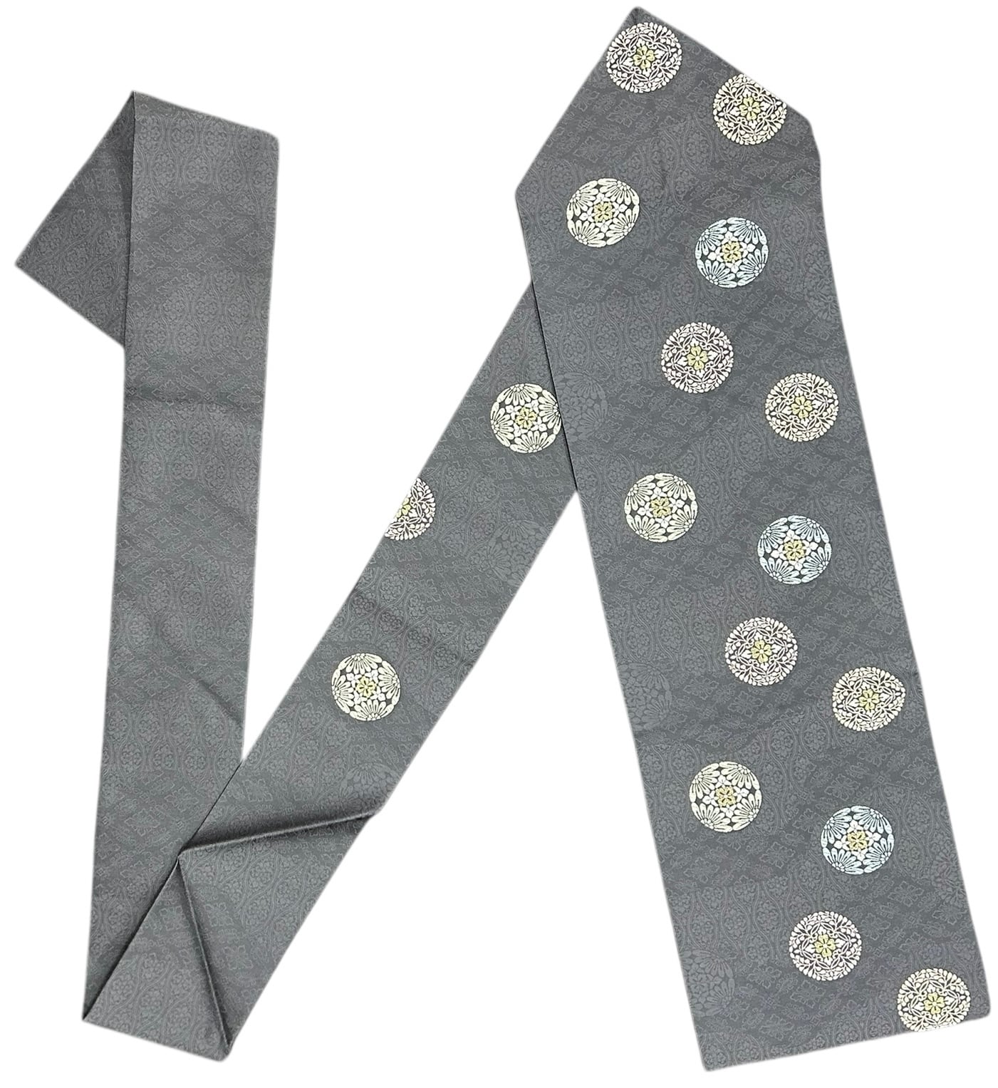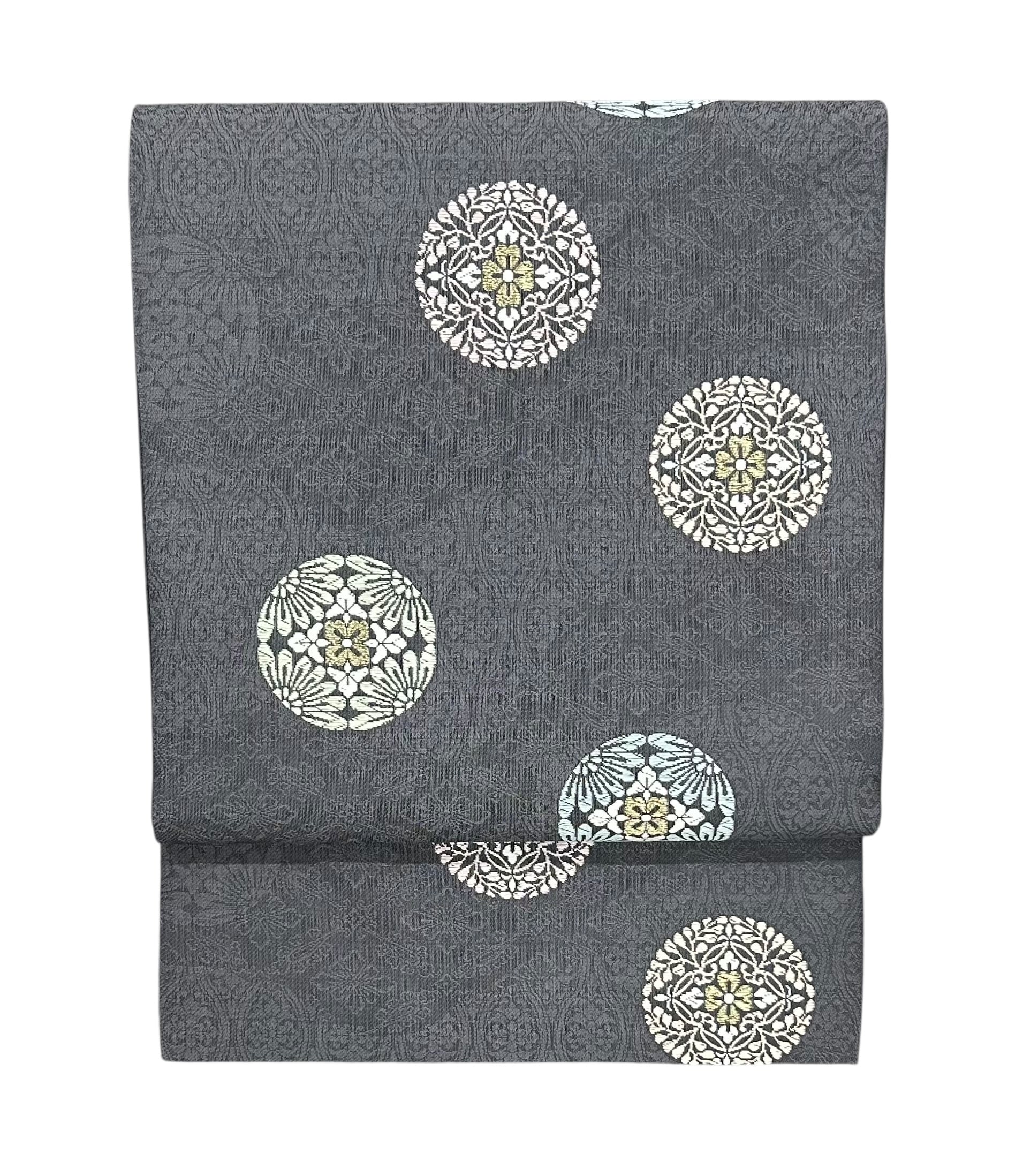 名古屋帯 未使用品 立涌文 菱文などの地紋の鈍色の地 優しいお色味の丸文 長さ 371㎝ Q5176