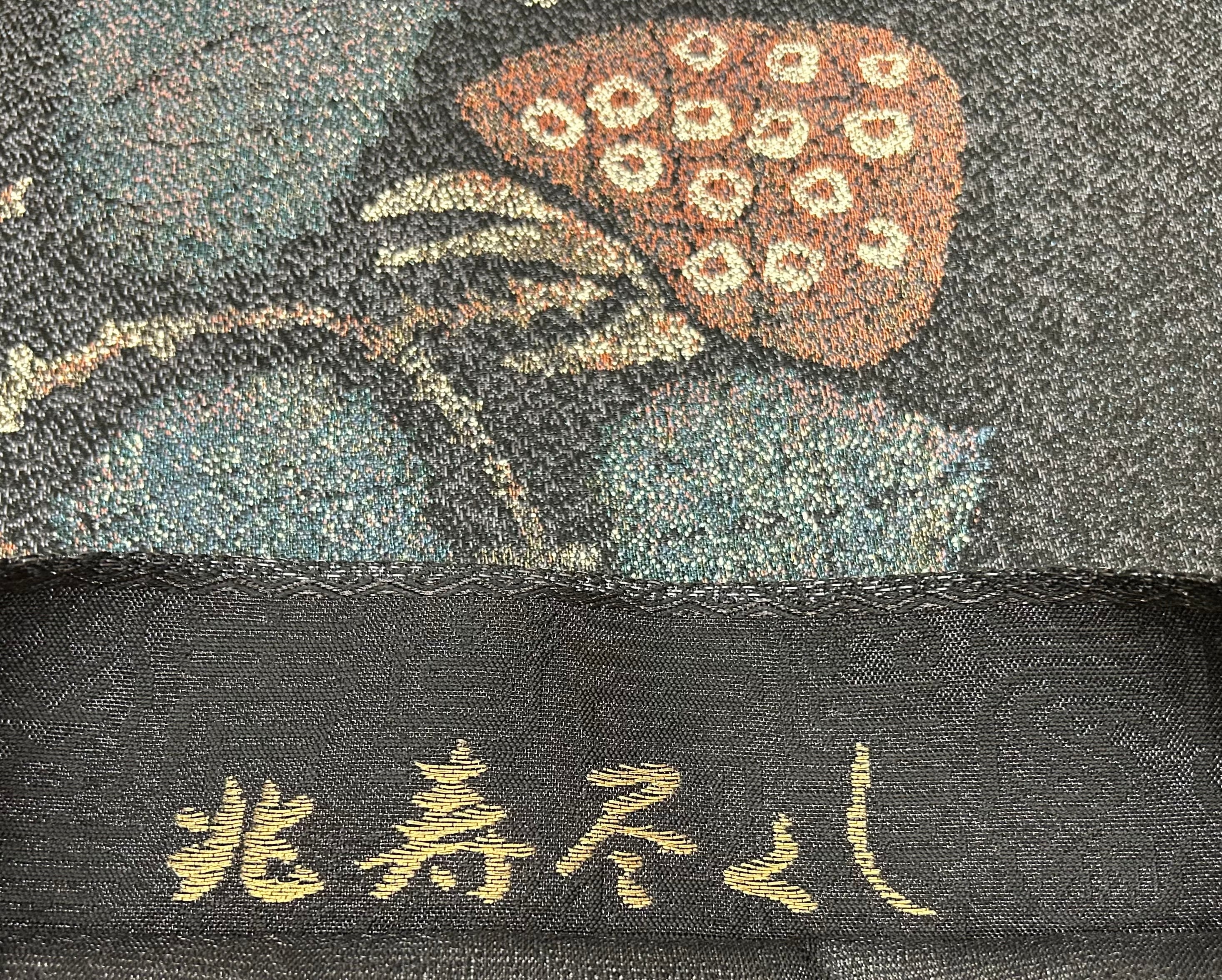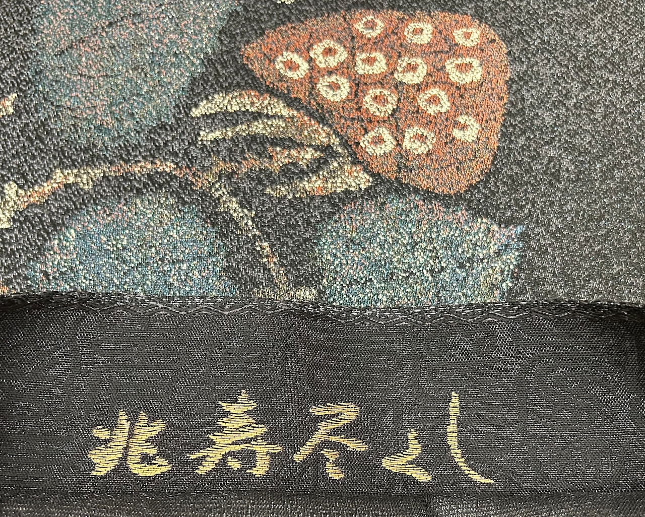 こちらは、黒地に魅力的な苺柄を描いた誉田屋源平衛の袋帯です。ハリとシャリ感のある素材で、ラメを含んだ柿茶色、象牙色、高麗納戸色などで表現した大きな苺が、華やかさを演出します。たれ先には、愛らしいてんとう虫がデザインされており、細部にまでこだわりが感じられます。