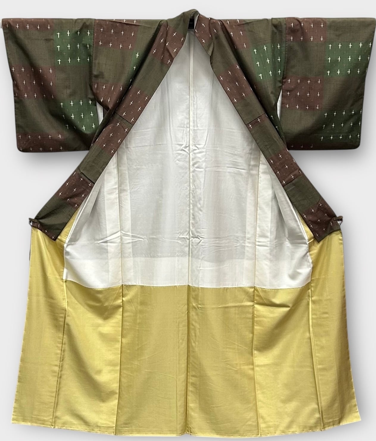 紬 革色×赤褐色 格子に白い十字絣 裄丈 67㎝ K5342