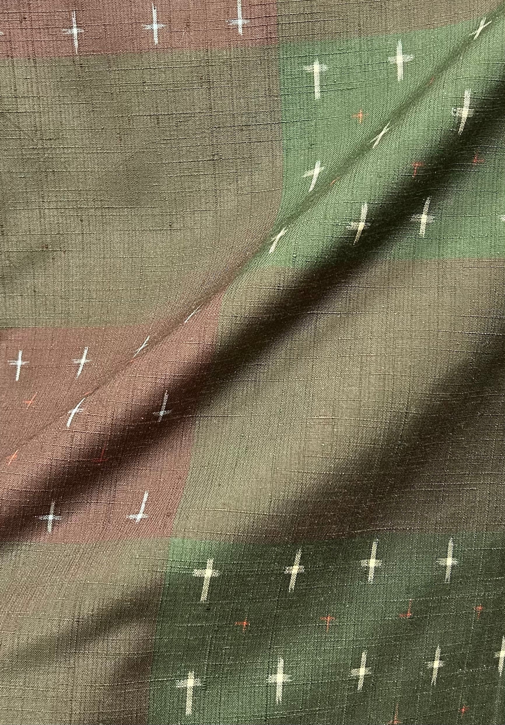 こちらは、革色と赤褐色が美しく交じり合った格子柄の紬で、白い十字絣がアクセントとなっています。独特な風合いの縦にフシの多い生地が、上品でありながら温かみを感じさせ、どのシーンでも際立つ存在となります。カジュアルながらも洗練された印象を与え、多様な着こなしにご利用いただけます。