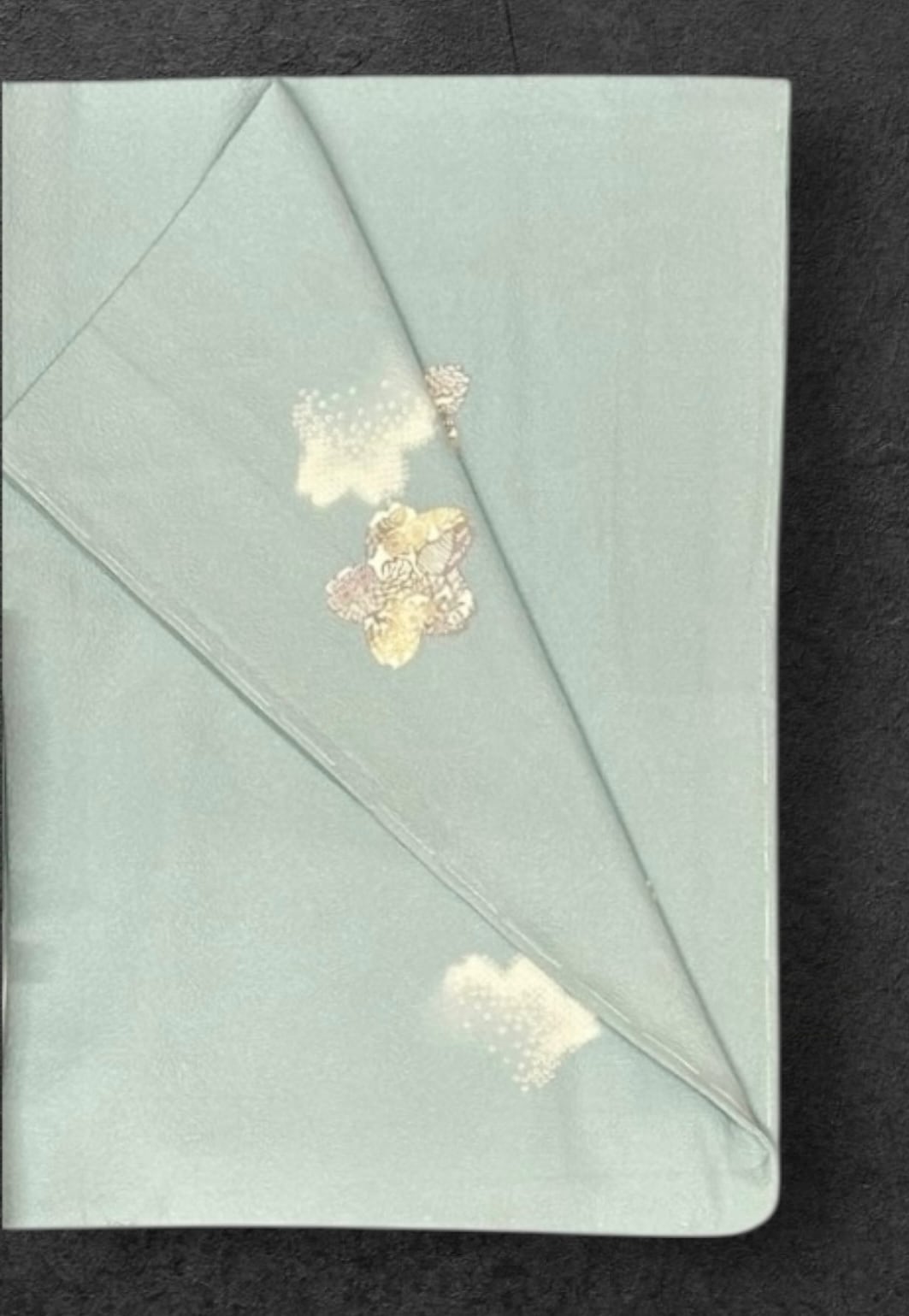 こちらは、小紋の秘色色の地に桜の花柄が施された愛らしい一品です。桜の花がポッポッと浮かぶ様子は、象牙色の鹿の子柄と淡い色合いとの型染めで見事に表現されています。ちりめん地の柔らかな質感が、着る人に優しい印象をもたらします。春の訪れを感じさせるデザインで、特別な日にも日常使いにもぴったりの着物です。