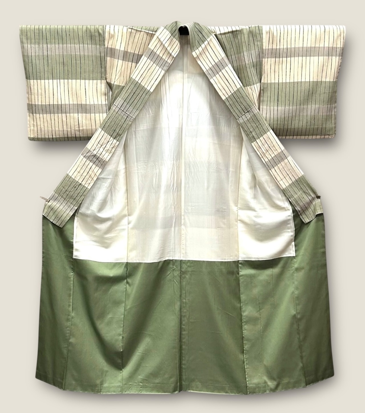 こちらは、洗練された美しさを感じる紬のお着物、砥粉色の地に柳茶色と茶鼠色のバランスが絶妙に組み合わされた一品です。濃藍色の縦縞とぽつぽつと見られるシボが、独特の風合いを醸し出しています。さらりとしたハリのある肌触りが、着る人に心地よさを提供するでしょう。
