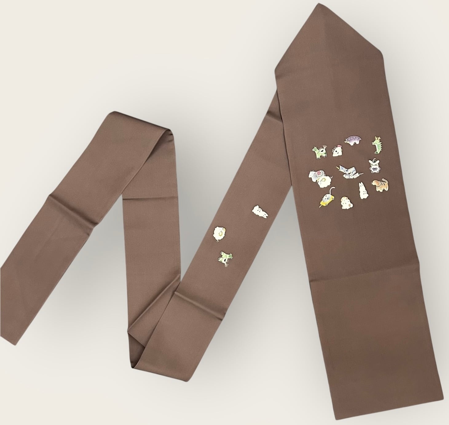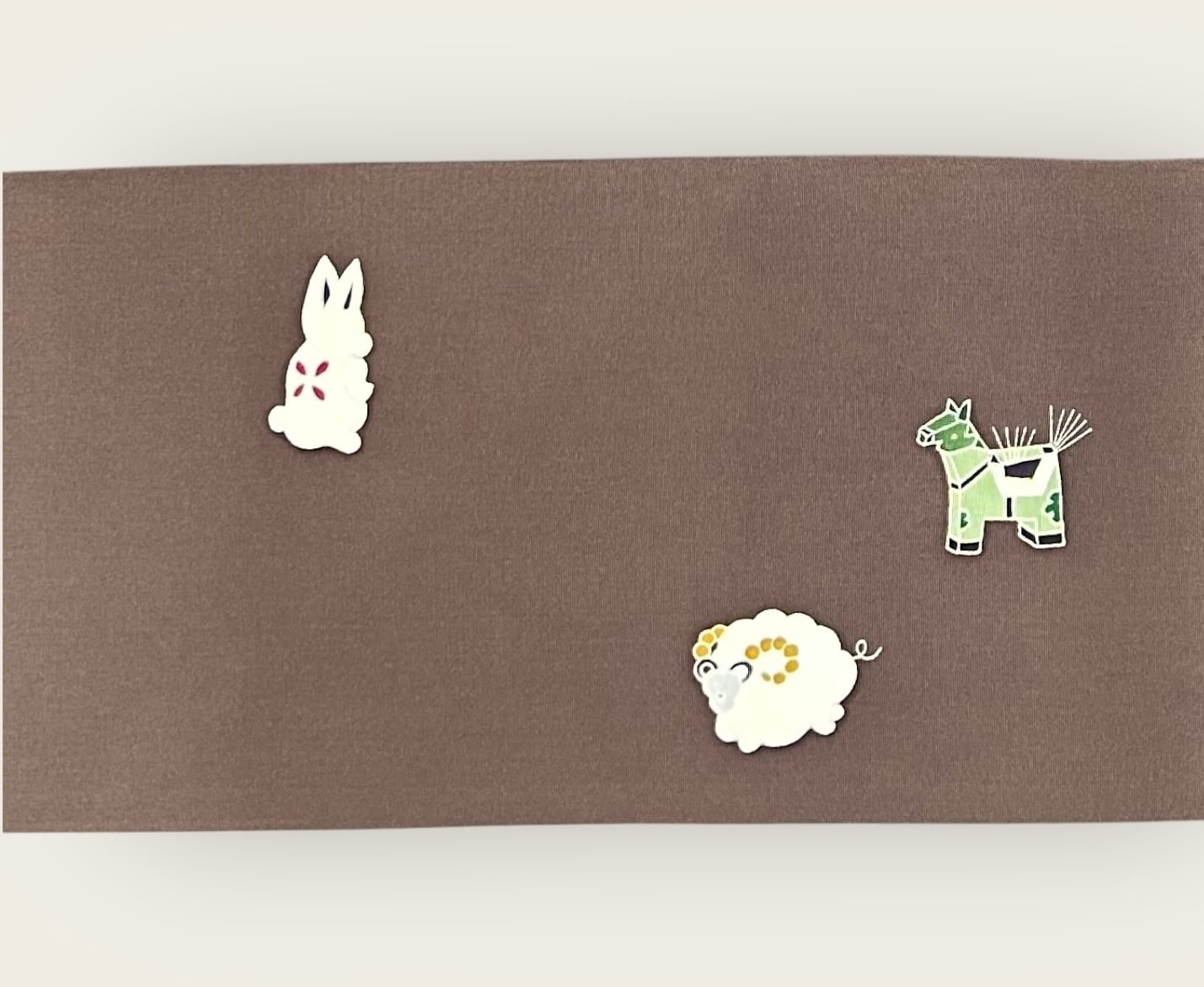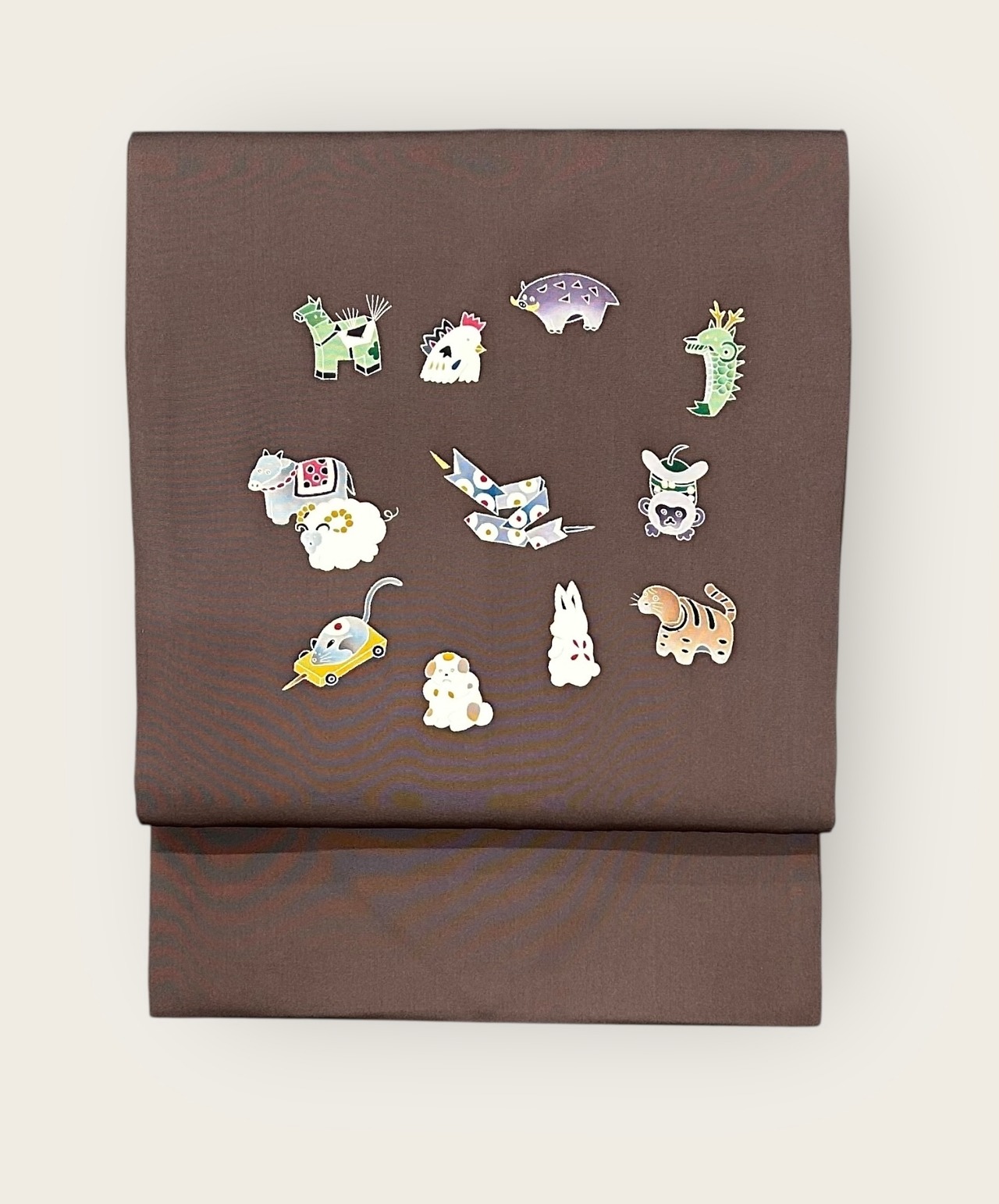 名古屋帯 塩瀬 穏やかな茶褐色の地 可愛らしい表情の干支 長さ 378㎝ Q5973