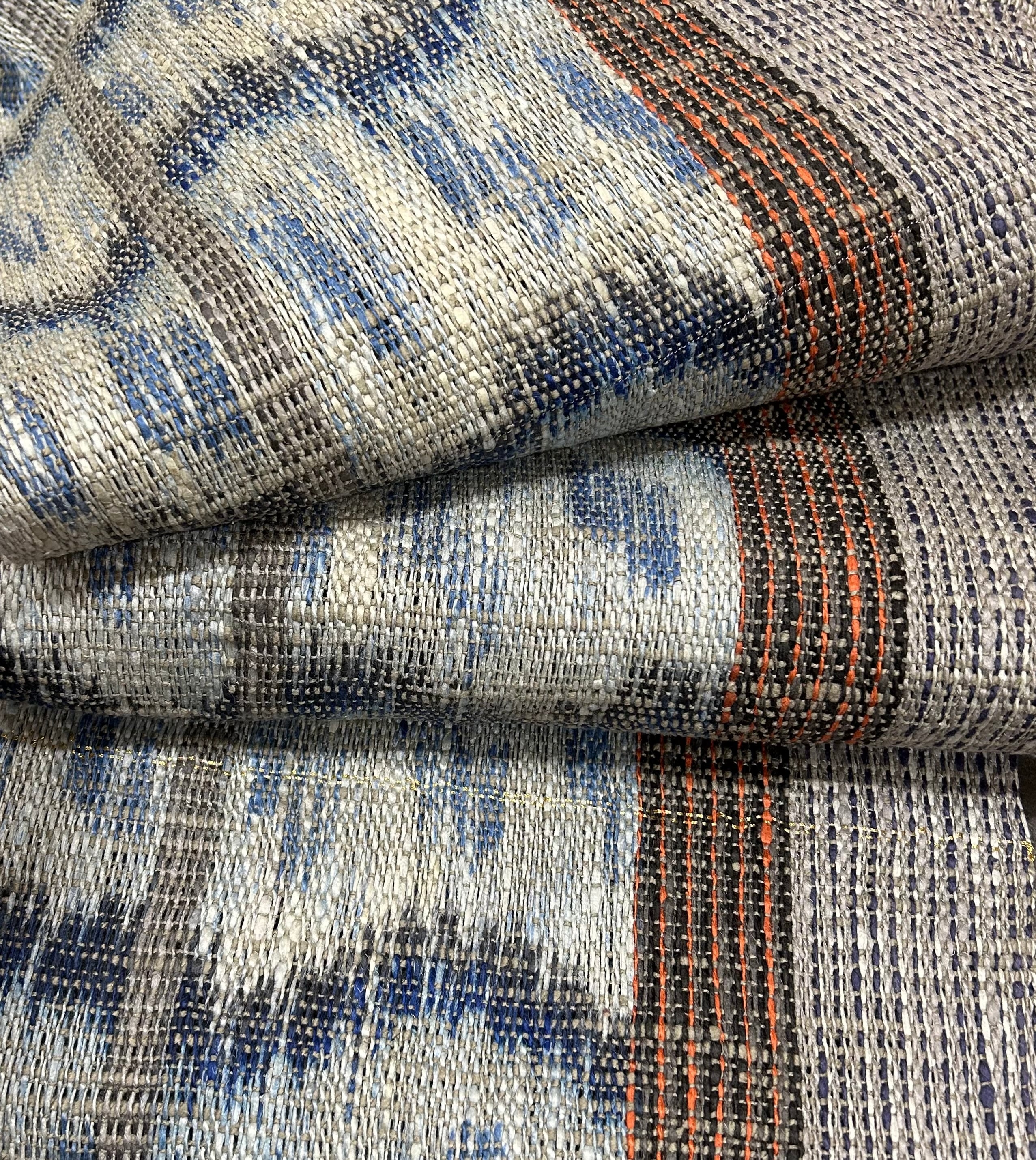 八寸名古屋帯 藍色の濃淡×茶鼠色×黄赤色 ザックリとしたとても凝った織 長さ 376㎝ Q5133
