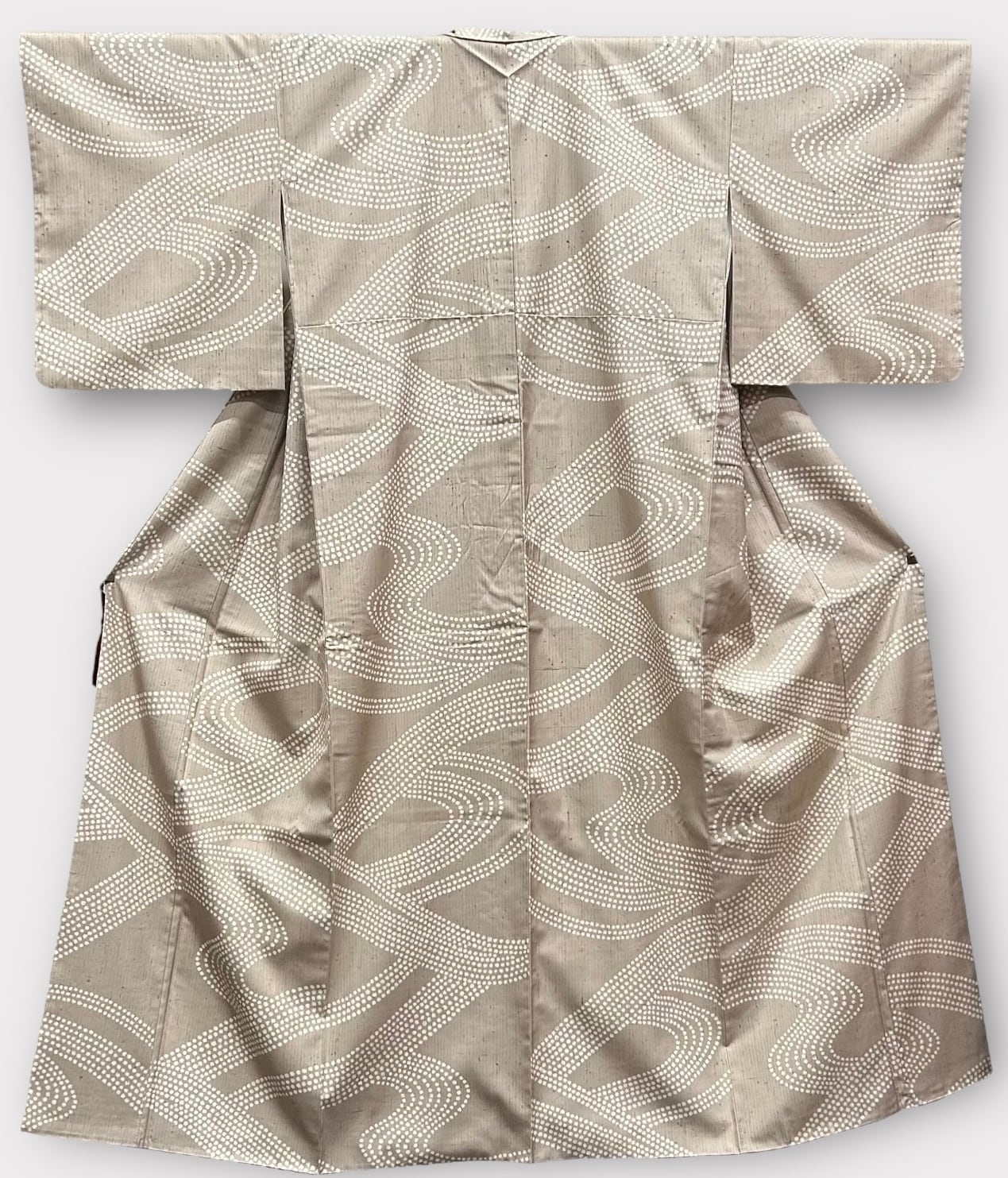 こちらは、風合い豊かな染めの紬のお着物です。薄めの白茶色の地に生成り色の小さな星のような流線模様が施された美しい一品です。フシが多めで程よいハリを感じられ、なめらかな肌触りが魅力的。