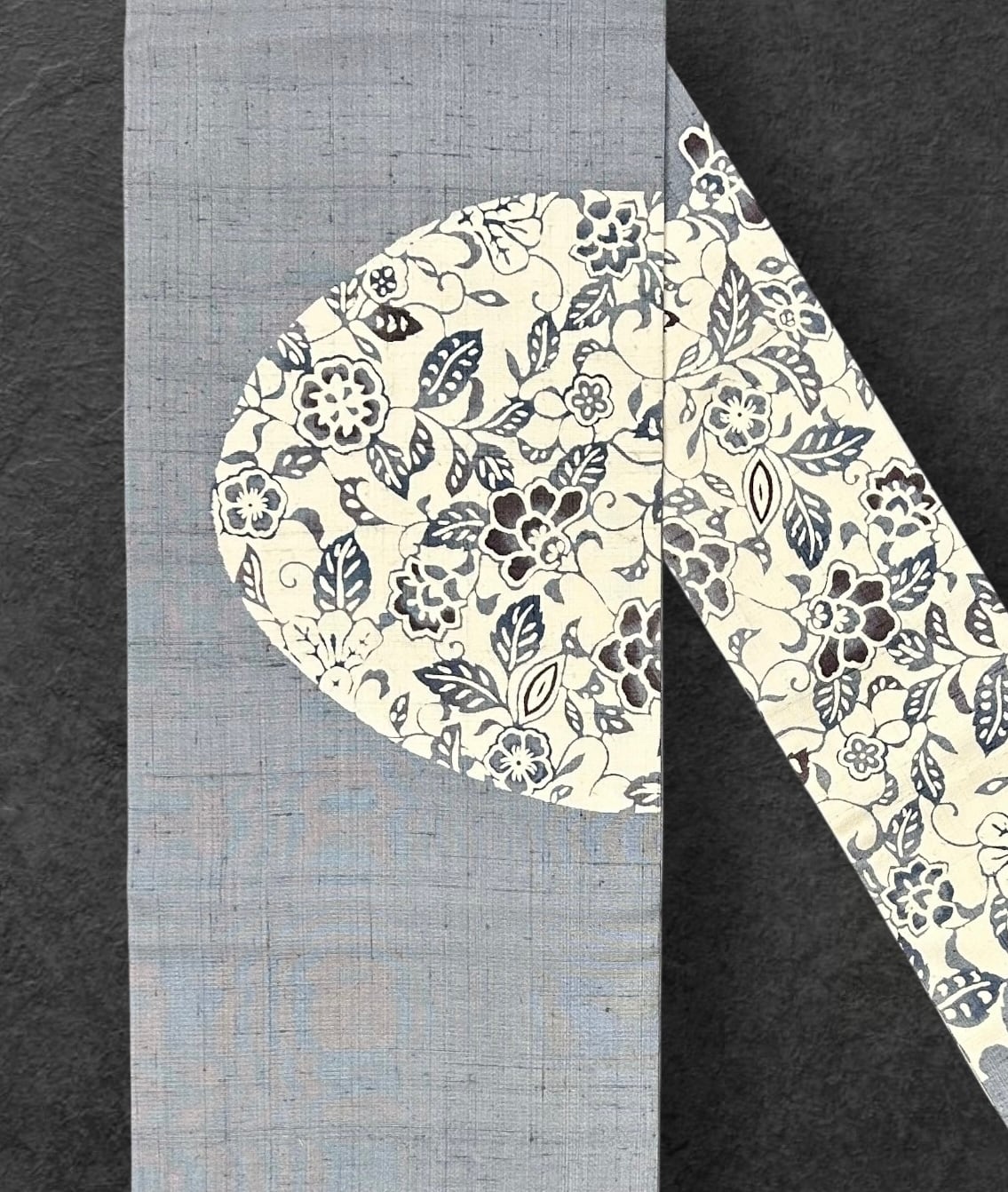 こちらは、落ち着きのあるほんのり青みがかった灰青色の地に、美しい草花柄が施された名古屋帯です。型染の生成り色に藍色や涅色の草花が華やかに表現されており、フシが多めで程よいハリを感じられる一品です。さまざまなお着物に合わせやすく、上品な装いを演出します。