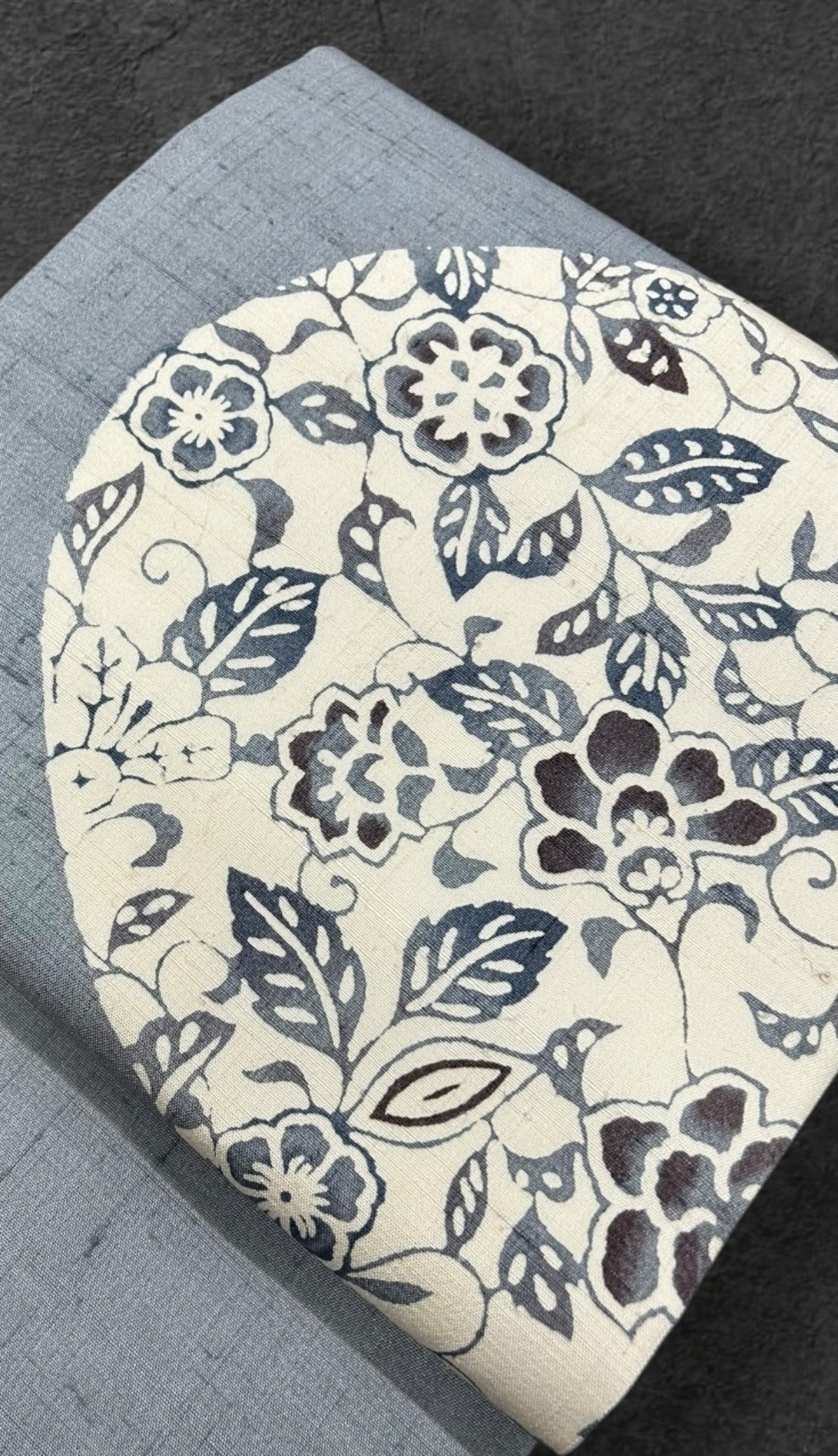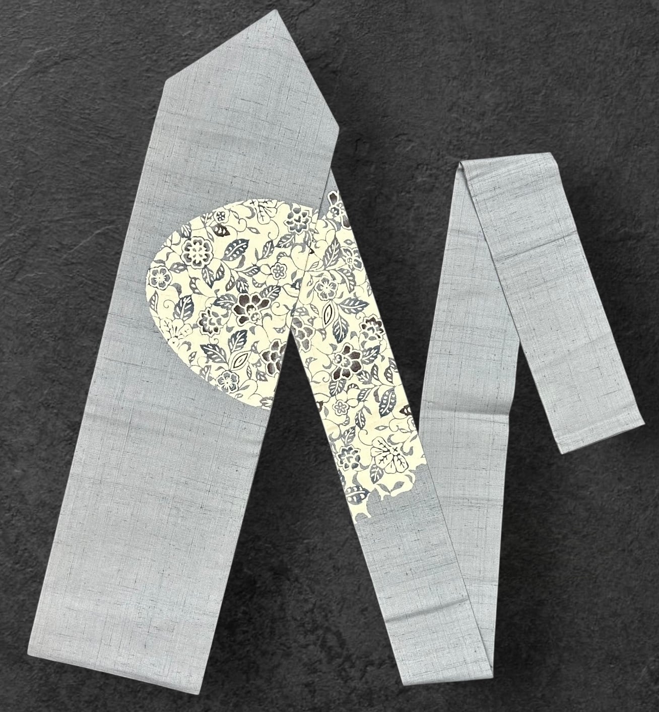 名古屋帯 紬地 型染 青みがかった灰青色の地 上品な草花のお太鼓柄 長さ 376㎝ Q5762