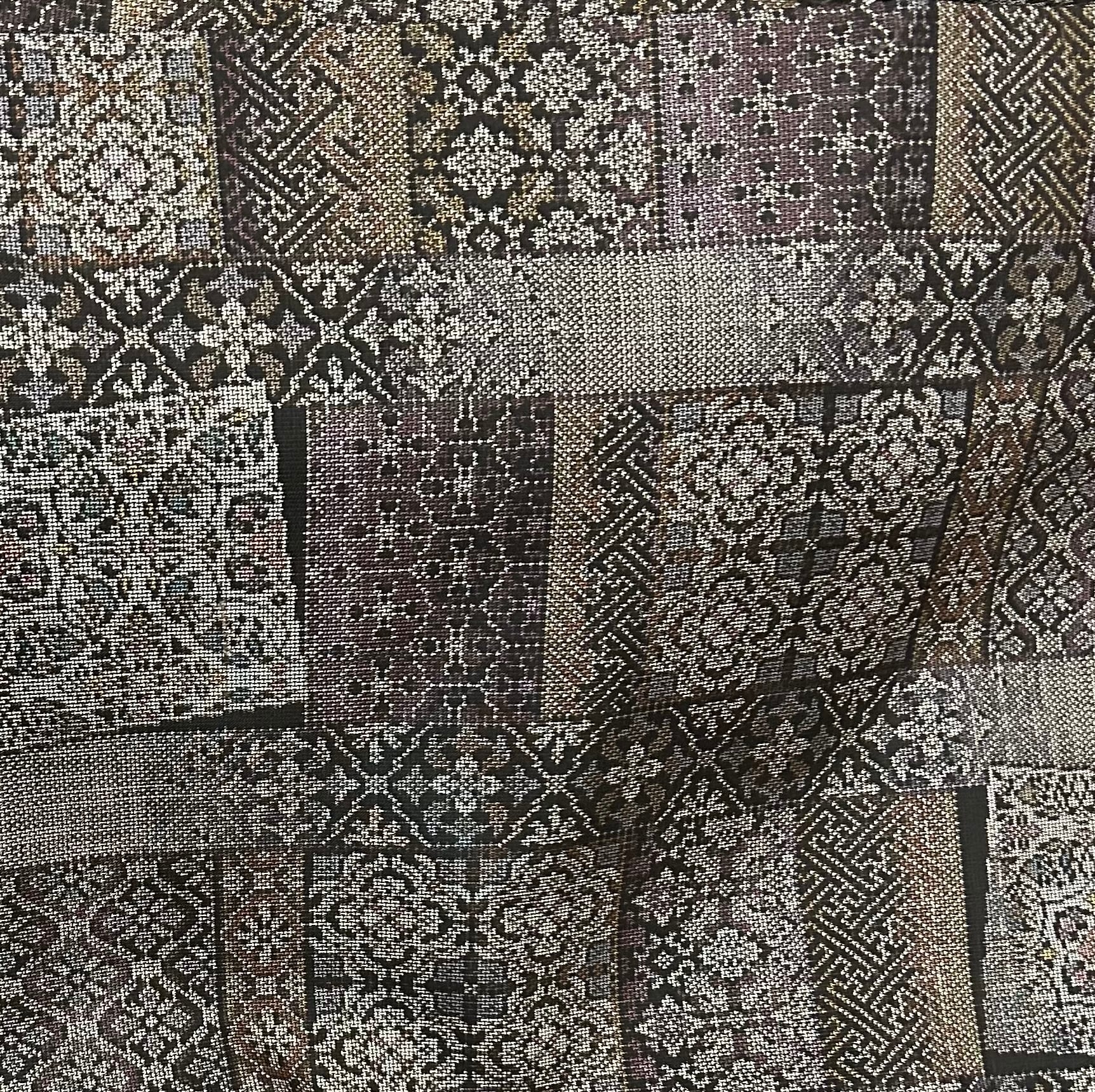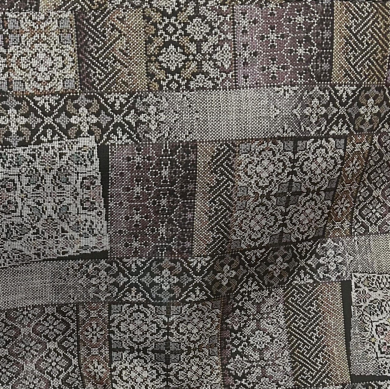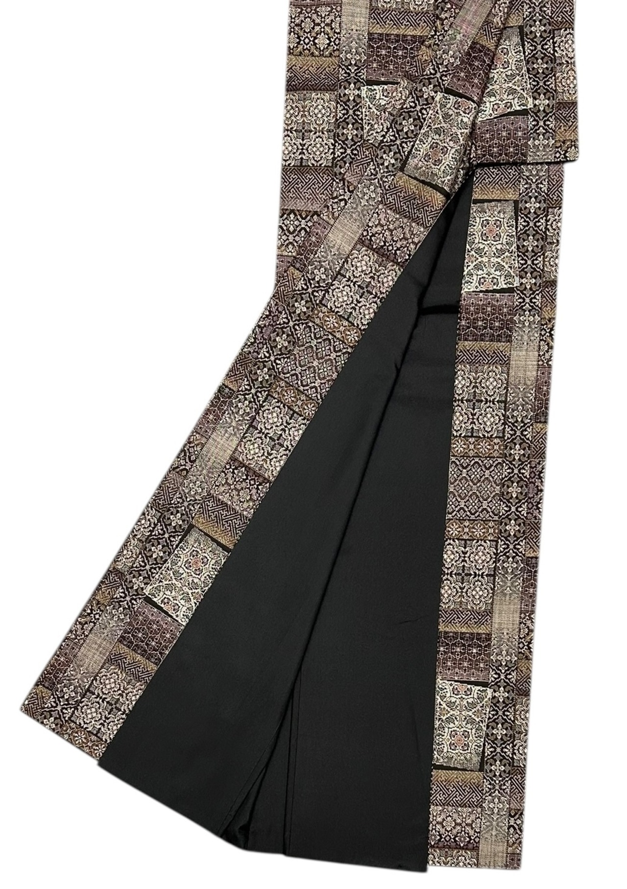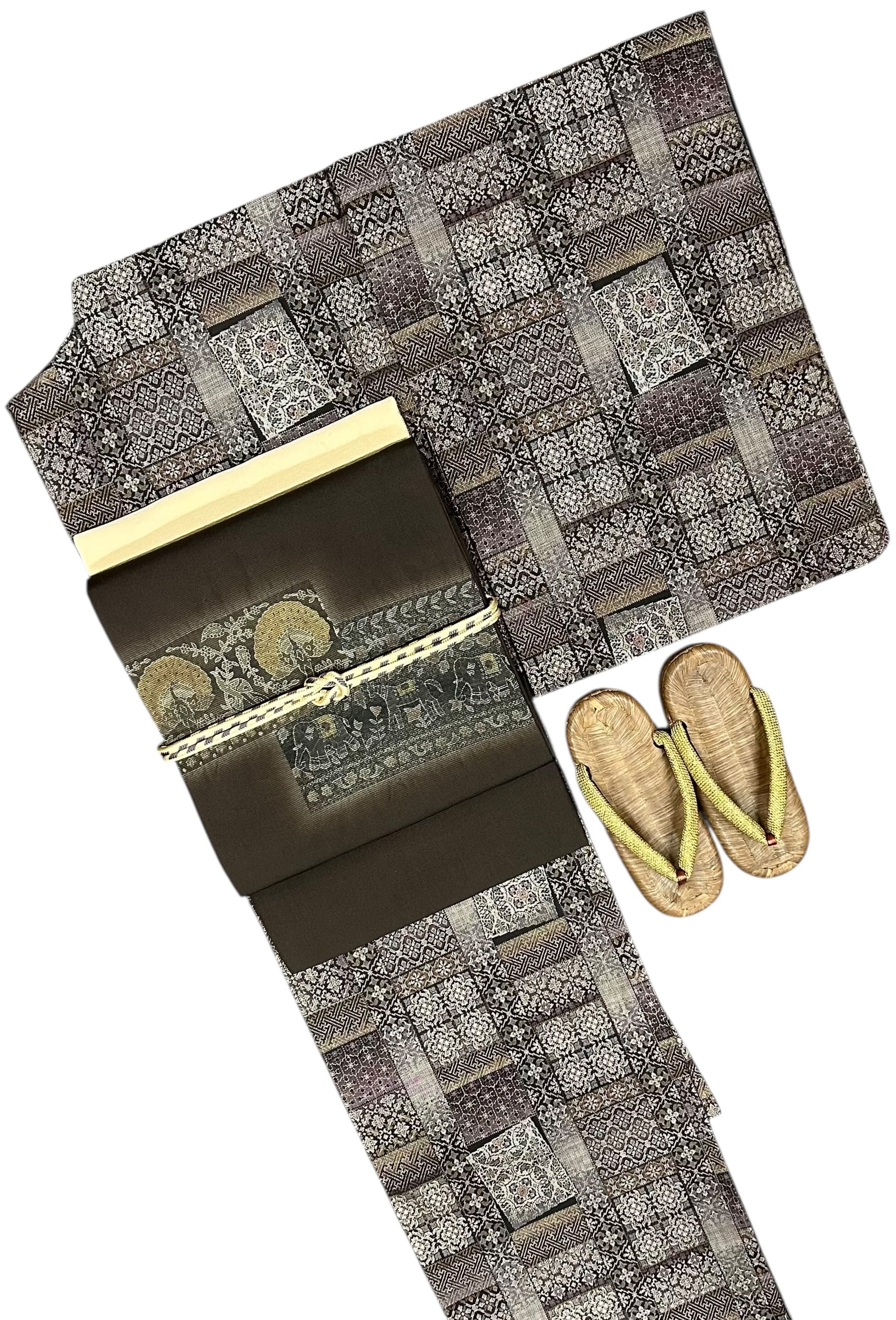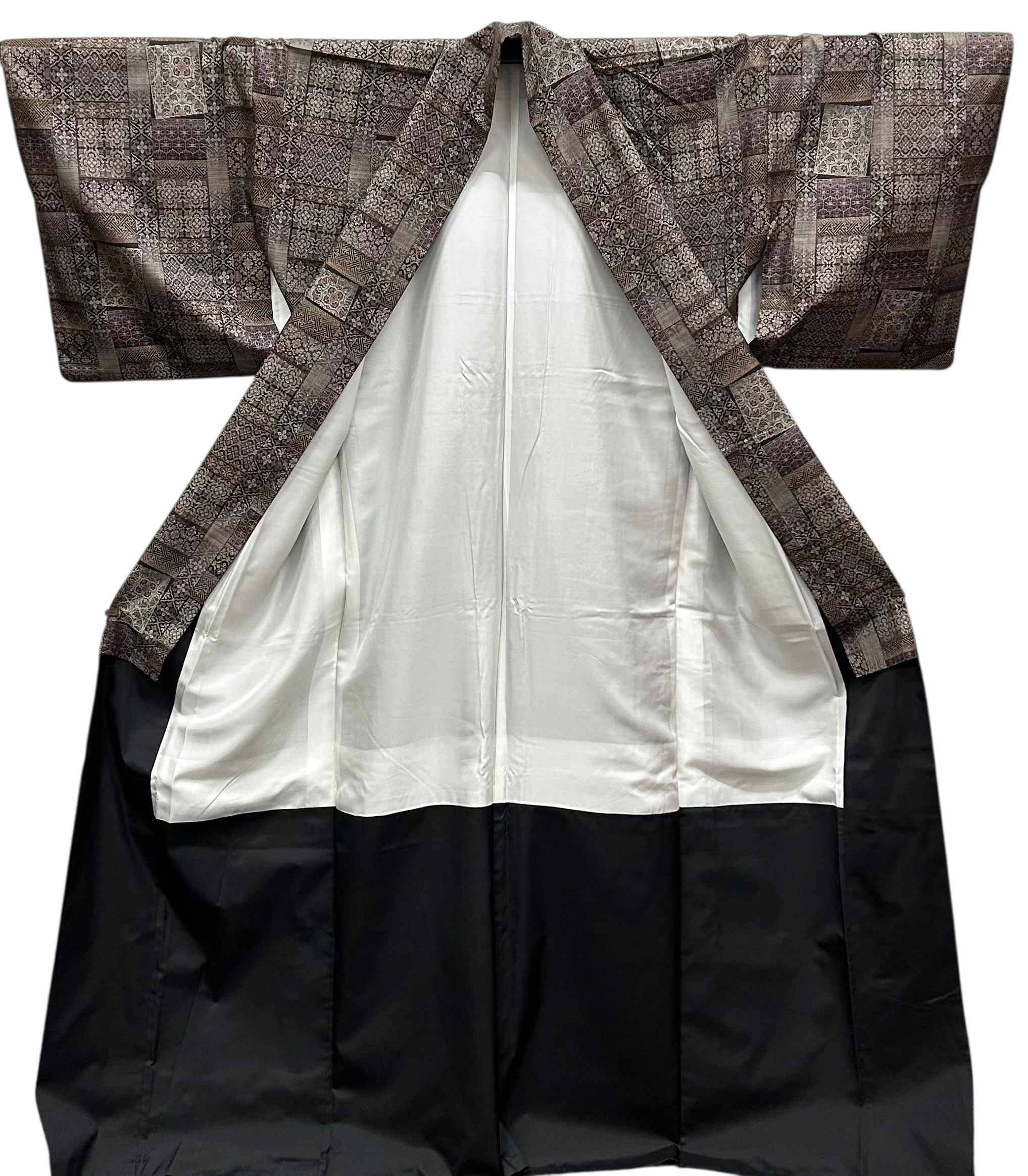 こちらは、大島紬の豪華なお着物です。黒や茶系の深みのある色味を基盤に、幾何学模様や花柄、沙綾形などを細かくつなぎ合わせた模様、古典裂華紋 が施されています。大島紬特有のハリと、なめらかな肌触りが特徴で、着用することで特別なひとときを演出します。上品さと豪華さを兼ね備えた一品です! 窪田織物株式会社 証紙 反端つき。