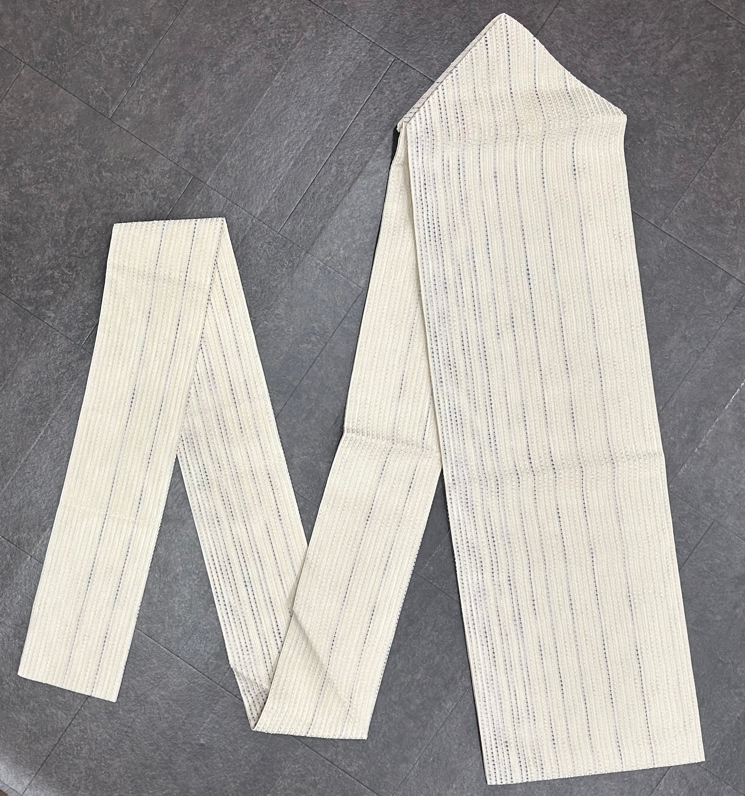 こちらは、洗練された風合いを持つ名古屋帯です。鳥の子色の地に、鳥の子色と舛花色、さらに秘色色と白藍の濃淡の糸を経糸に使用し、緯糸には細い糸をざっくりと織り込んでいます。ぽつぽつと不ぞろいの小さな玉模様が浮かび上がり、遠目からは縦のストライプに見える特徴が魅力的な一品です。厚めのハリのある生地感が、帯のデザインに深みを与えています!