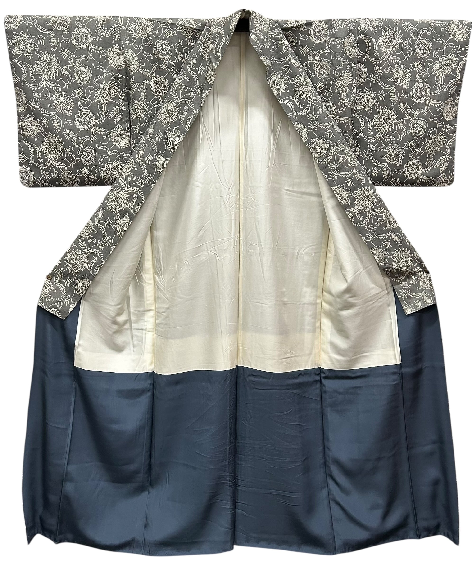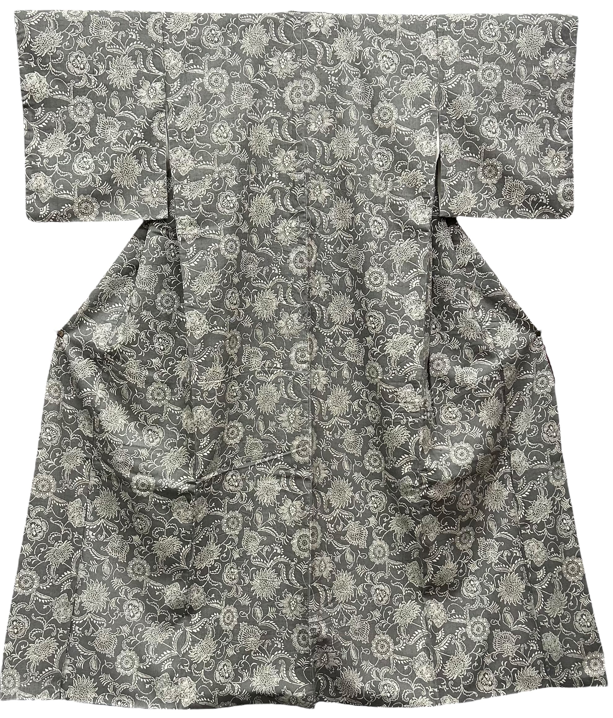 うすい墨色の地に、生成り色の大きめな唐花模様が全体に広がり、上品でありながら華やかさもある紬です。少しフシのあるさらっとした地は、心地よい着心地を実現し、日常の装いに特別感をプラスします!