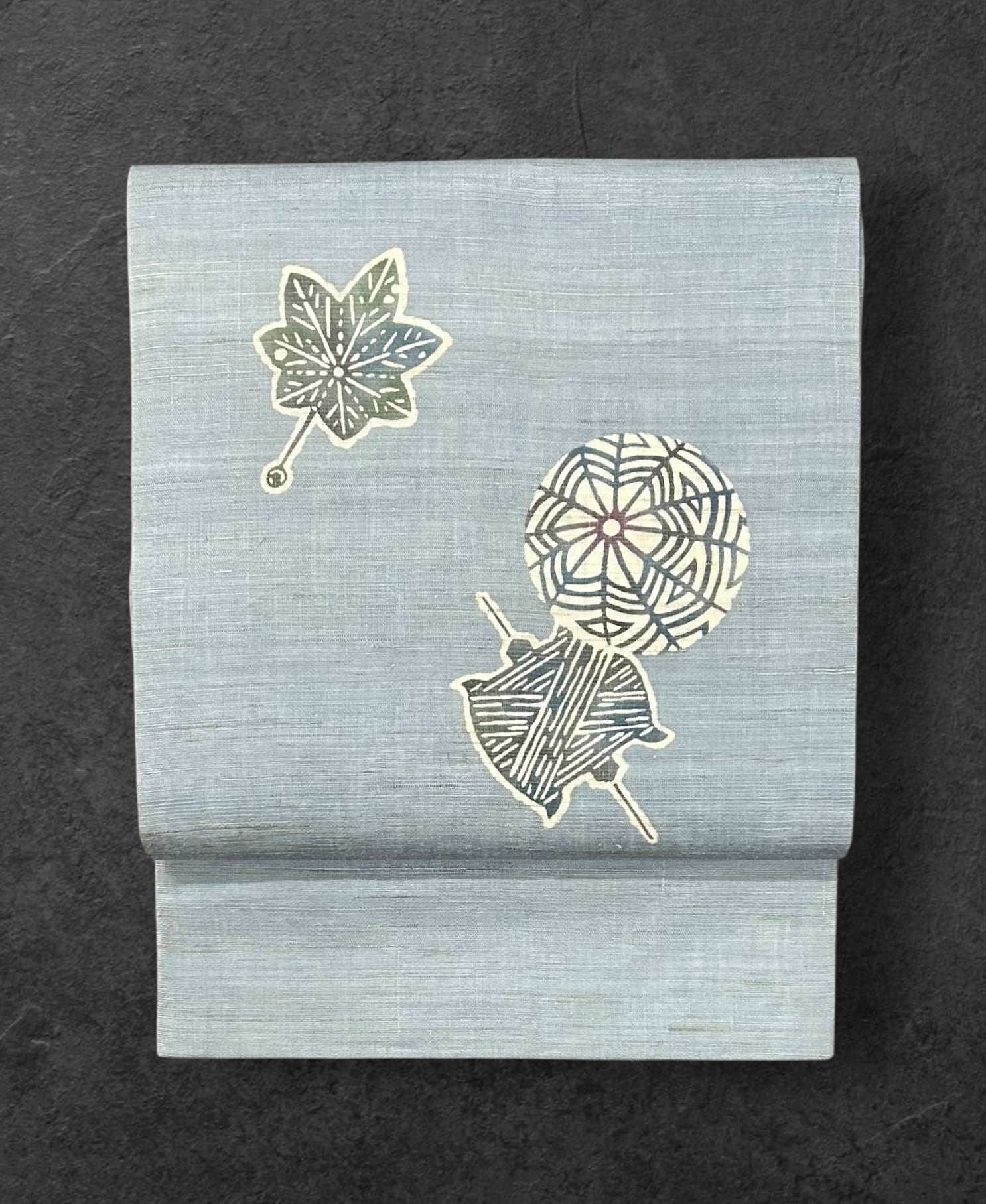 こちらは、紬地の美しい名古屋帯です。フシが多めの薄い舛花色の地に、糸巻や毬、葉などの型染めのお太鼓柄が優雅に描かれています。色合いは、紺鼠色、藍鉄色、御召茶色が見事に調和し、程よいハリ感が心地よい着用感を提供します。
