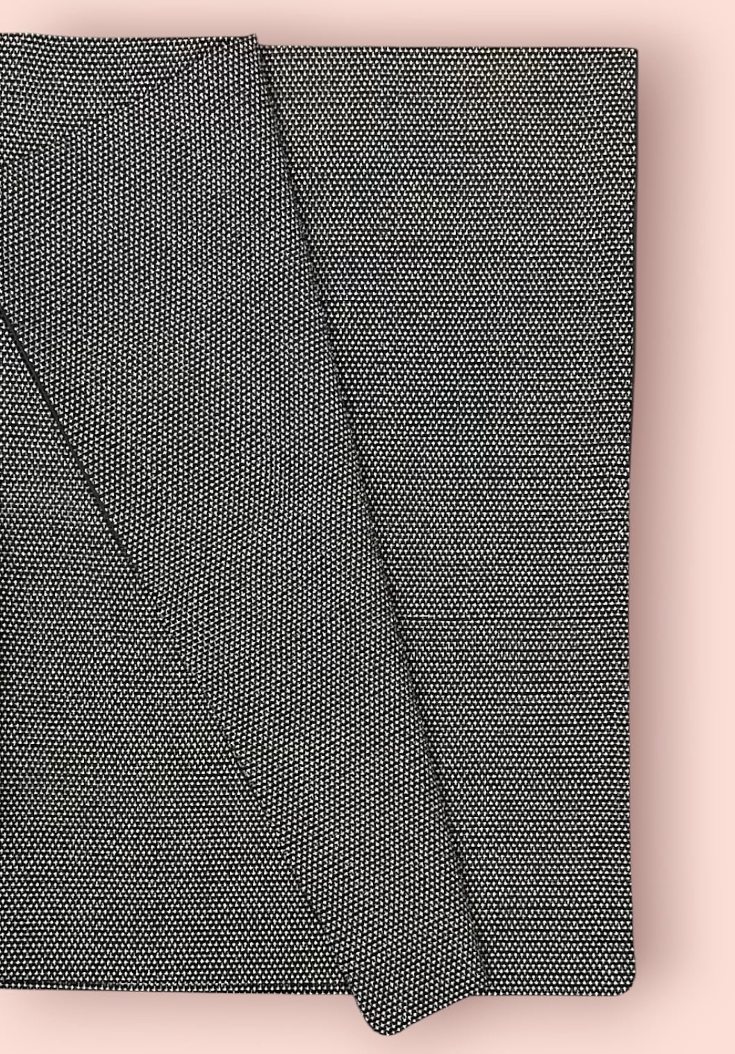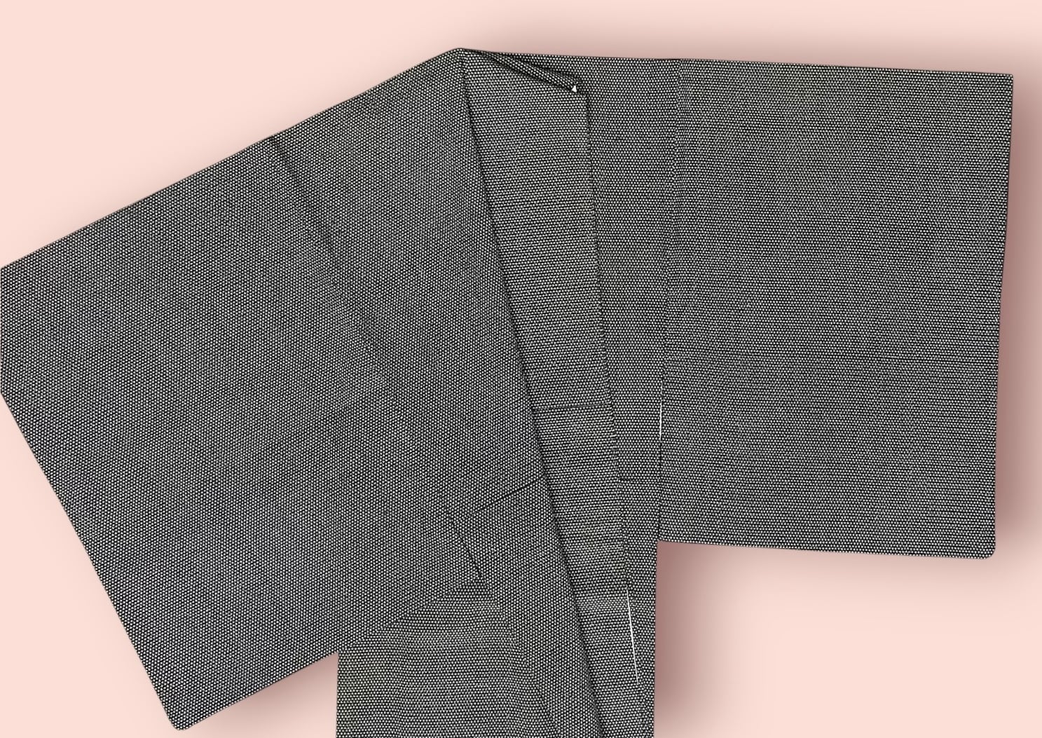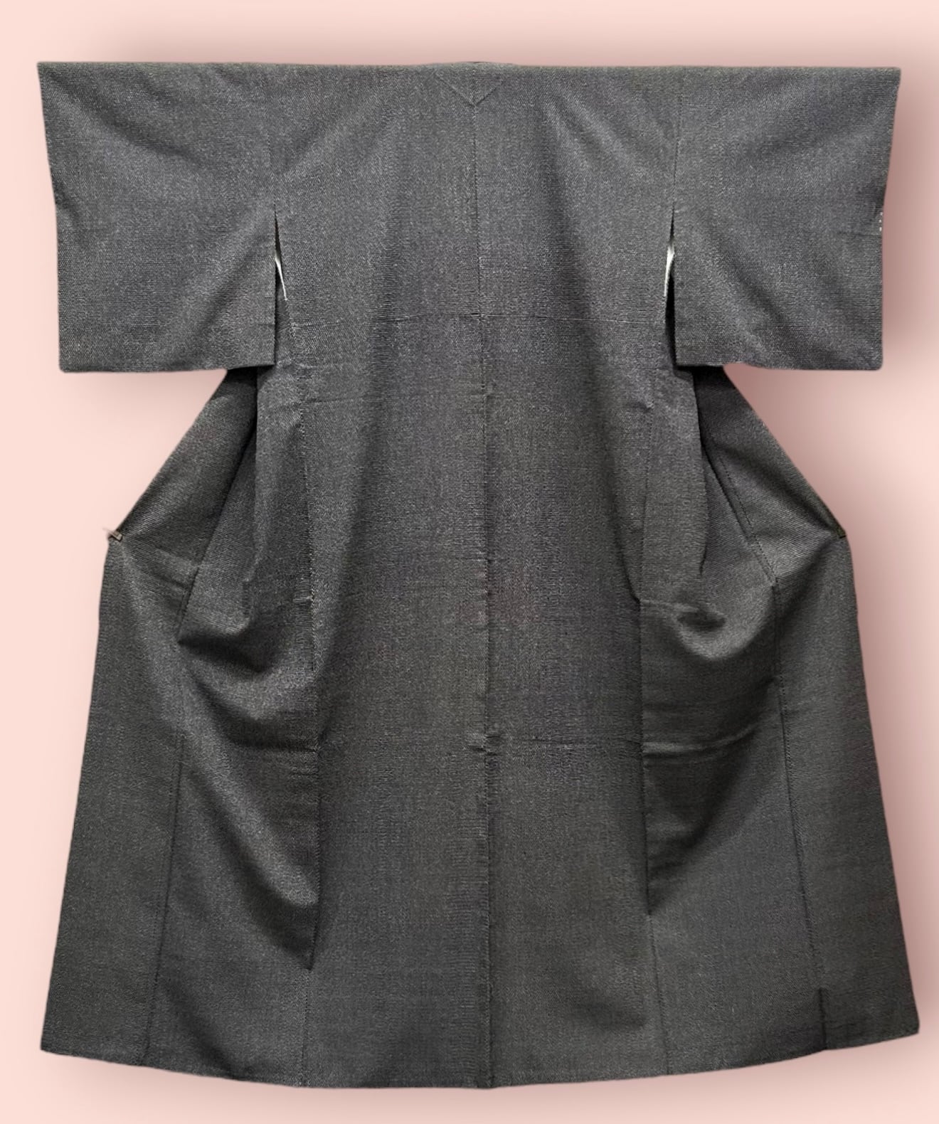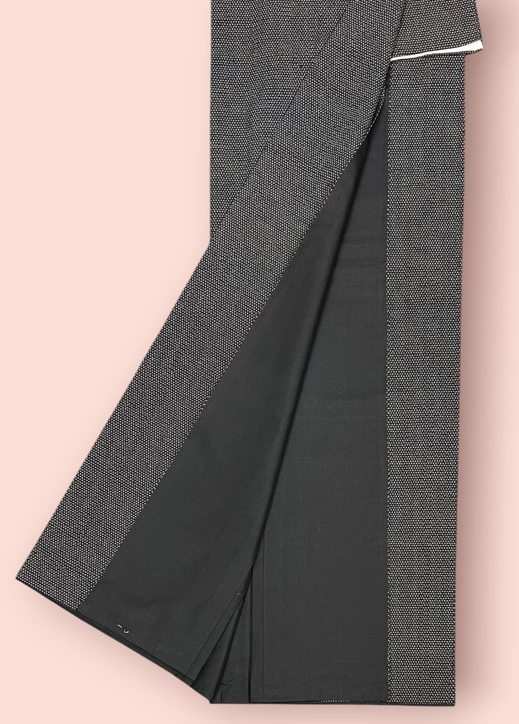 こちらは、本塩沢の上質なお着物です。モノトーンの落ち着いた色合いと、細かい十字絣が施されたデザインが特徴で、ハリのあるため息が出るような生地感が魅力です。