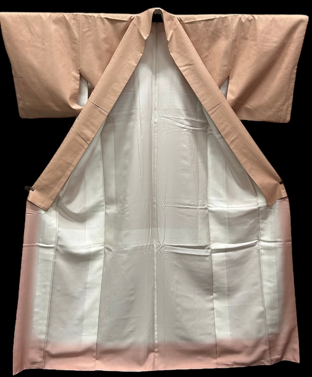 こちらは、特別な風合いを持つ紬のお着物です。オレンジがかった一斤染色の色無地が特徴で、しっかりとしたハリ感が魅力です。優美なシルエットを演出し、着用することで自信を与えてくれる一枚です。ぜひ、あなたの新たなコーディネートに取り入れてみてください。