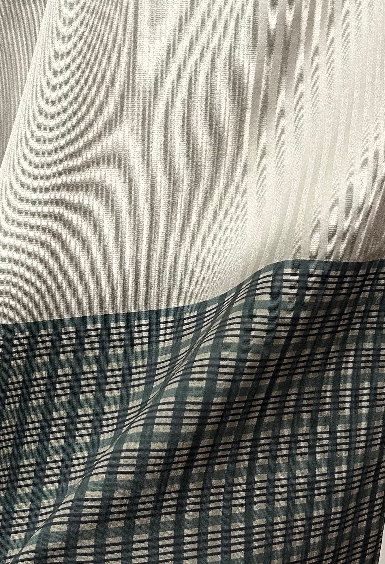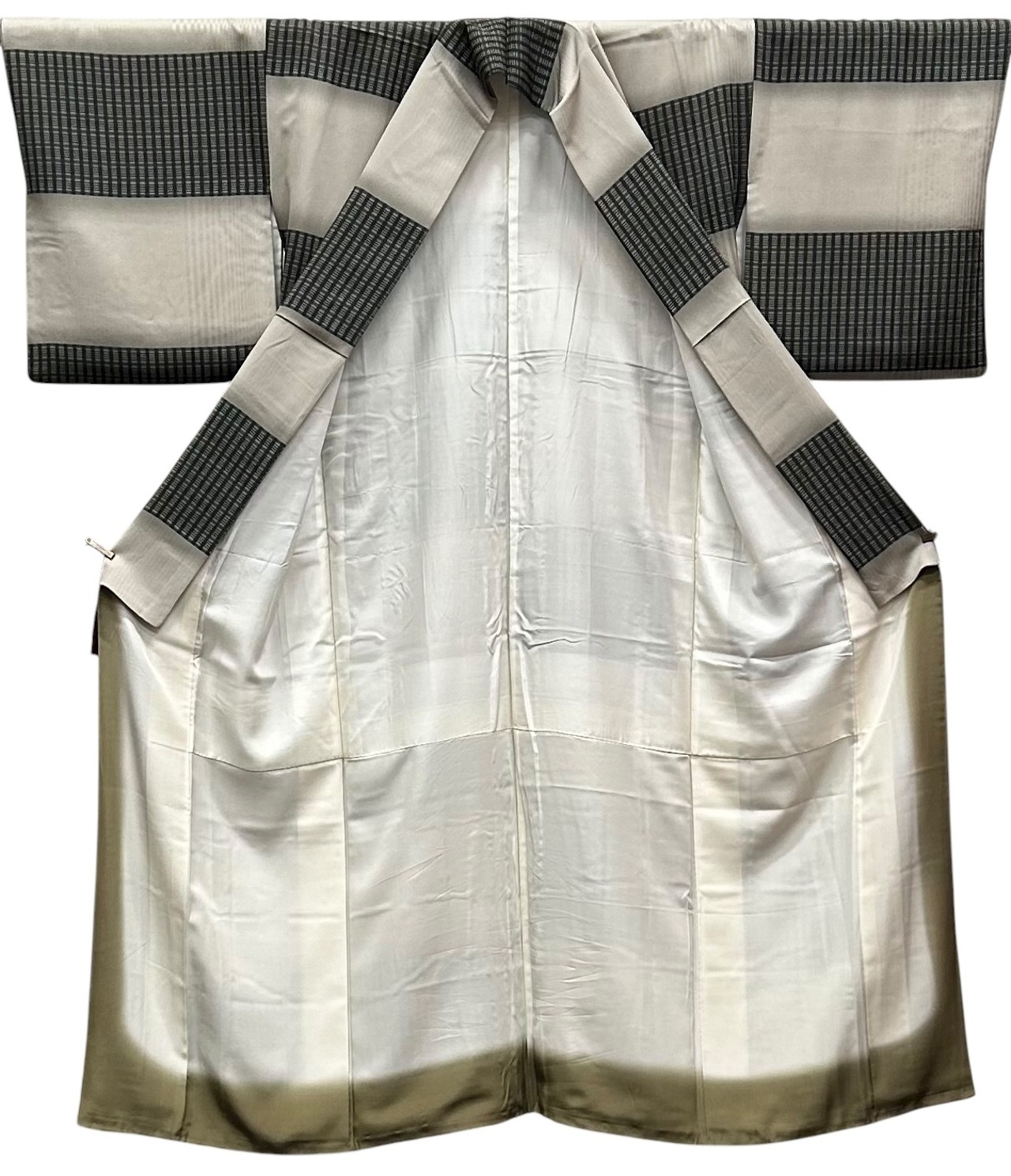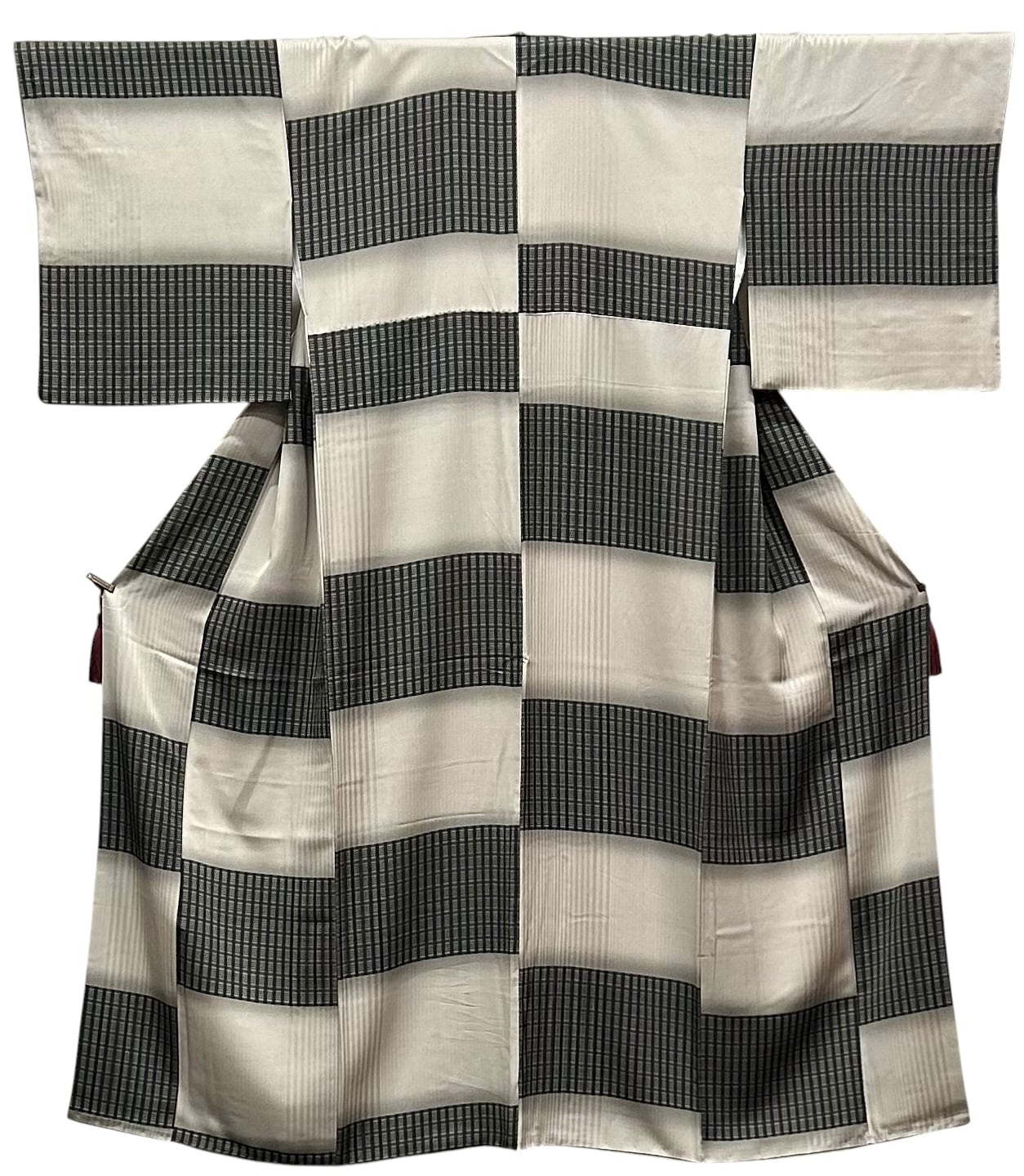 小紋 利休白茶色の地 暈し 革色の濃淡 黒などの変わり格子 横段 裄丈 67.5㎝ K5965