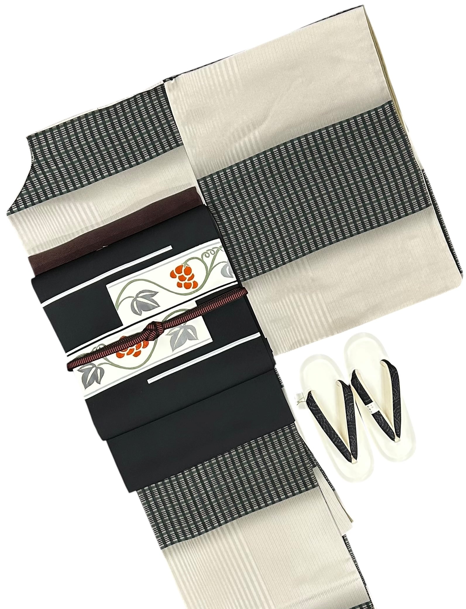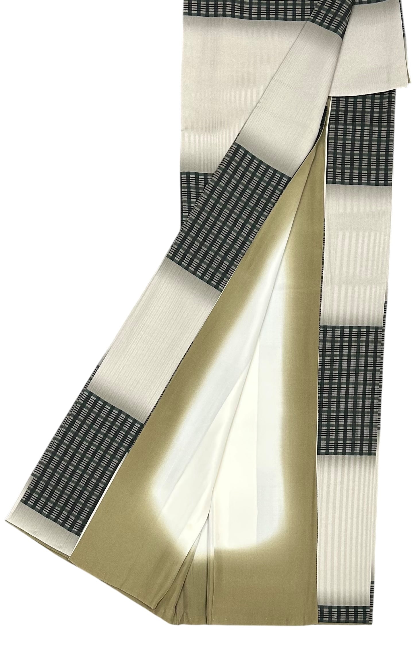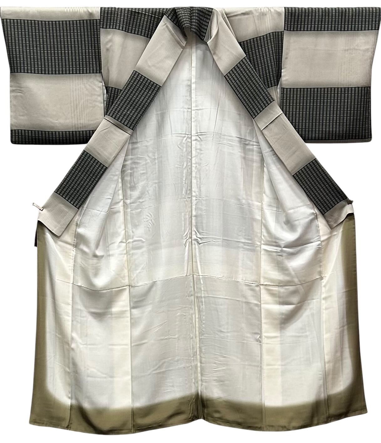 こちらは、美しい小紋のお着物です。縦縞の地紋の利休白茶色のぼかし地に、革色の濃淡と黒が絶妙に重なり合う 変わり格子が織りなす横段のような粋なデザインが魅力です。しっとりとなめらかな肌触りが特徴で、着用することでさらなる心地よさを感じていただけます。