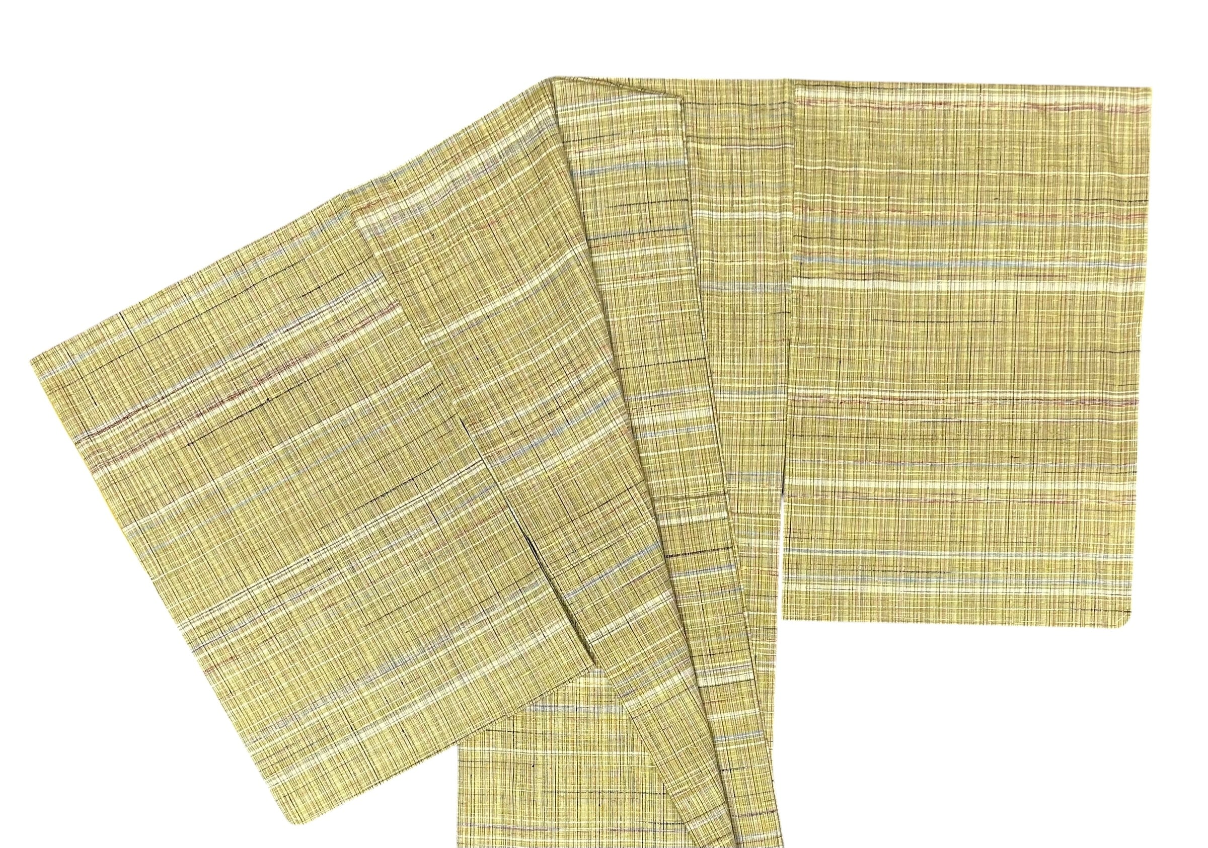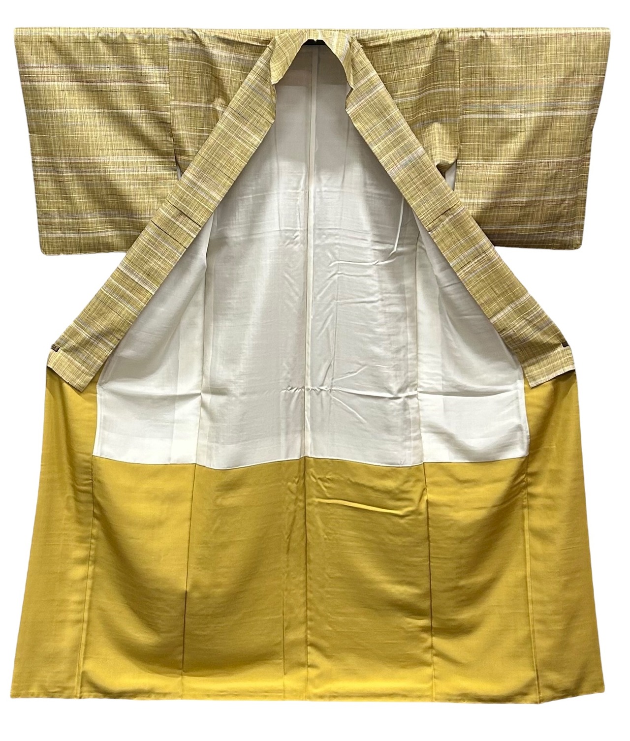 こちらは、心温まる印象を与える紬のお着物です。ほっこりとした芥子色の地に、茶系、緑系、水色などで格子模様が施され繊細さと上品さが漂います。柔らかめの肌触りは、着用することで心地よさをさらに感じていただける一品です。しつけ糸もつき。ゑり善お誂え。