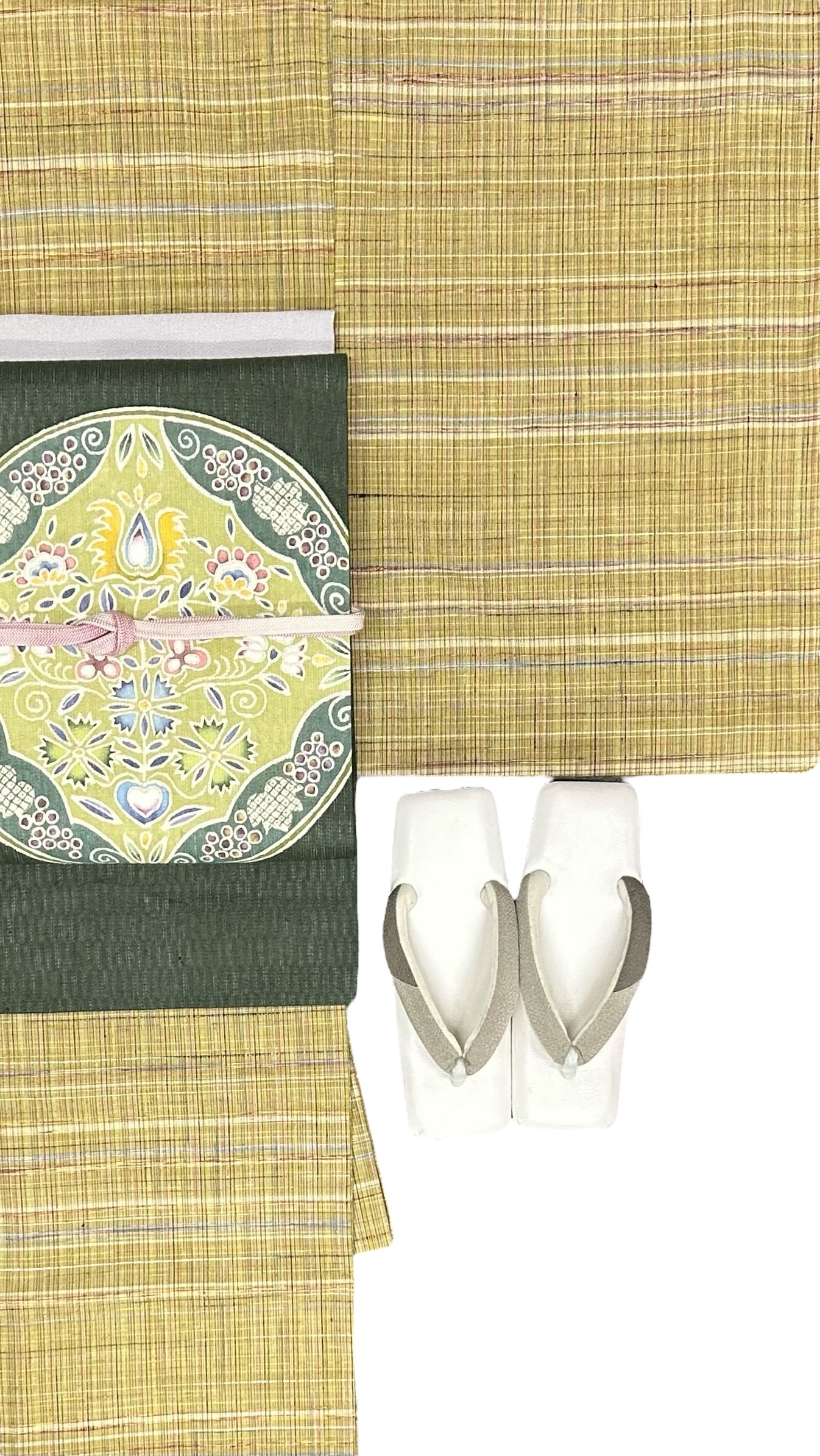 こちらは、優雅な名古屋帯です。緑がかった青鈍色の紬地に、縦線の幾何学模様の地紋が美しく施されており、パステル調の 草花や葡萄の華やかなお太鼓柄が特徴的です。程よいハリのある地、関東巻と関西巻で前腹の柄が異なるため、お好みに応じたスタイルを楽しむことができます。