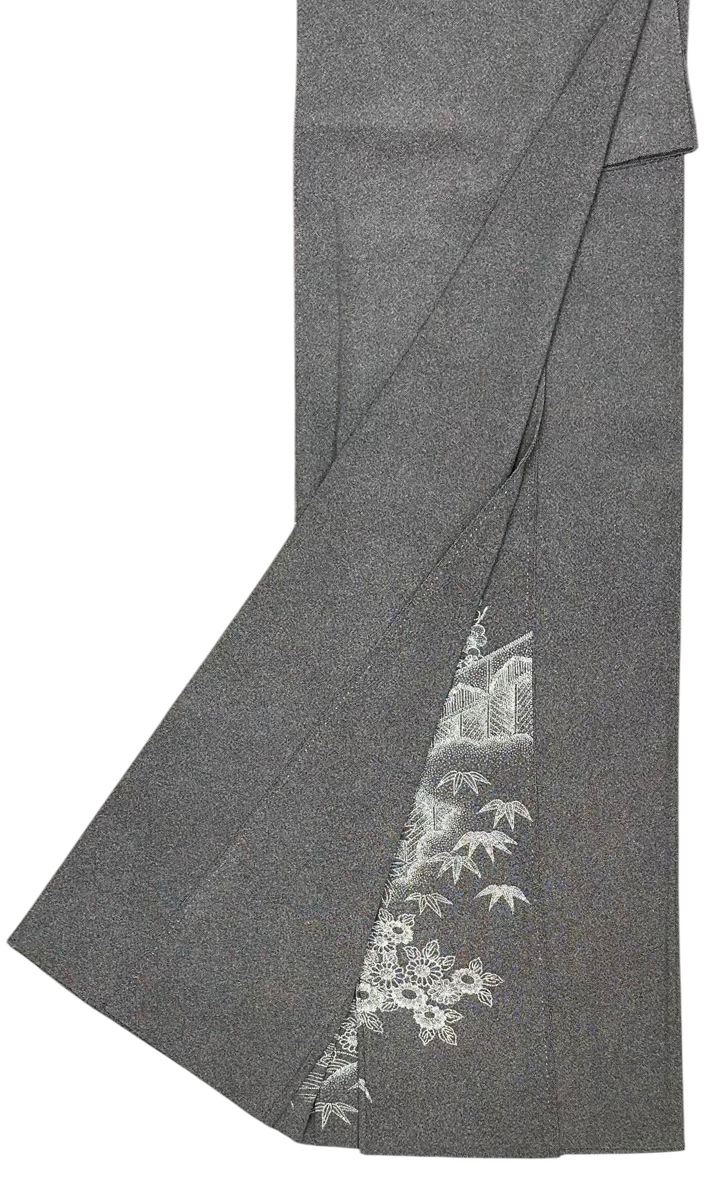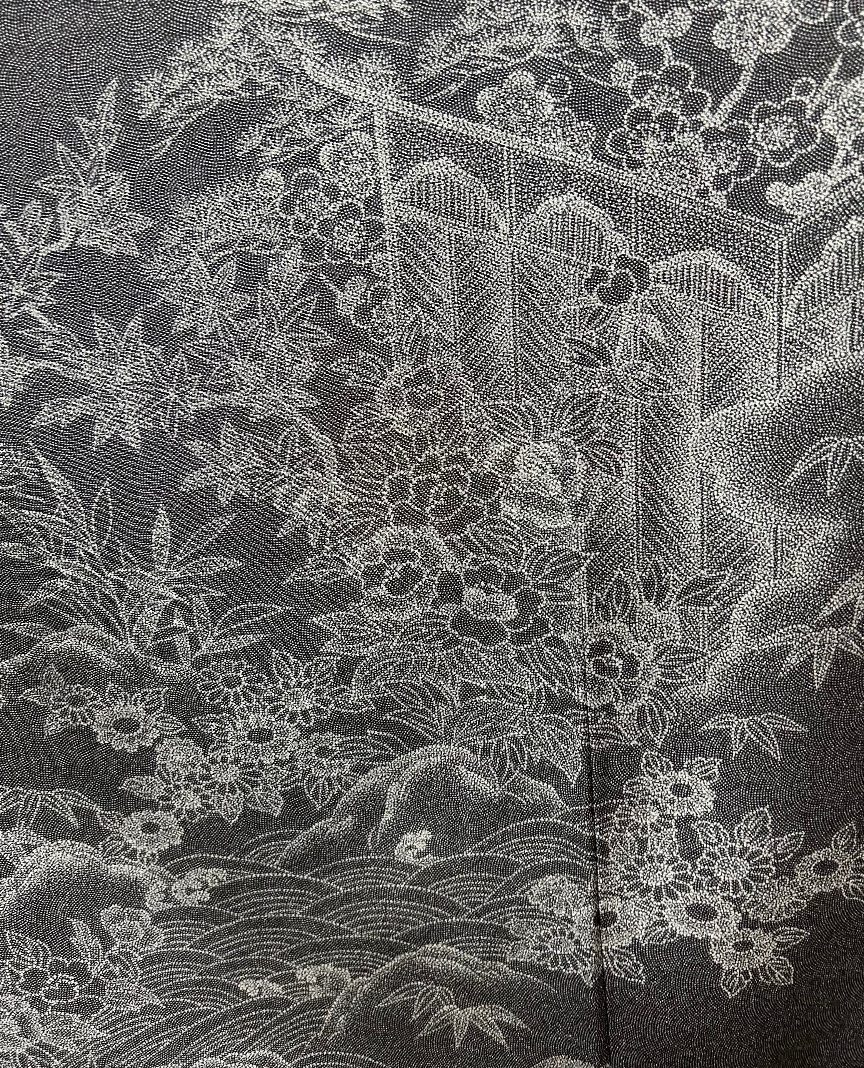 こちらは、洗練された美しさを持つ江戸小紋の着物です。黒色の鮫小紋が全体を覆い、八掛には四季の花々が丁寧にデザインされ、華やかさと高級感を醸し出しています。サラッとした手触りは、着ている方に心地よい感覚をもたらし、あらゆるシーンでの活躍が期待できる一品です。