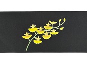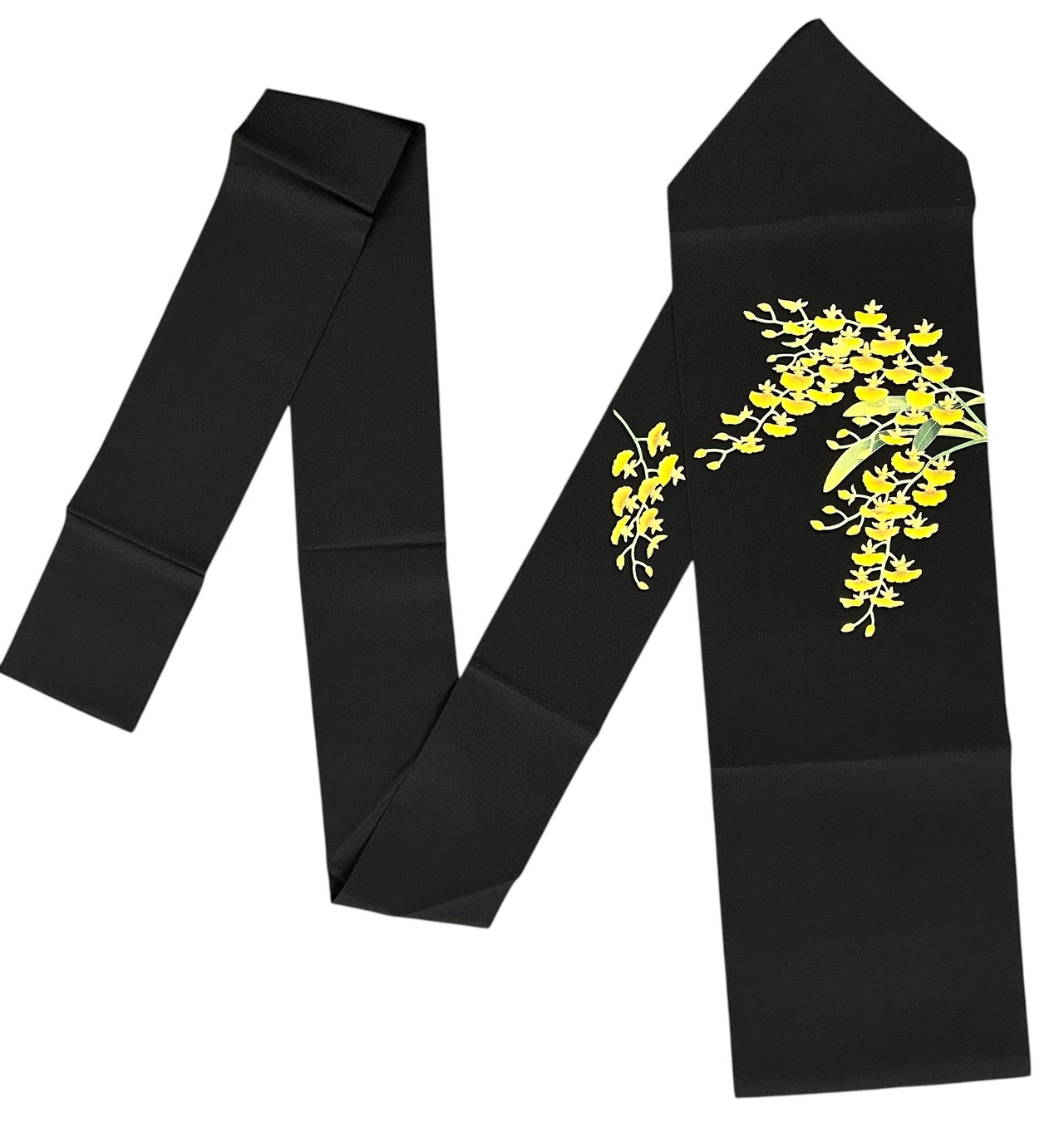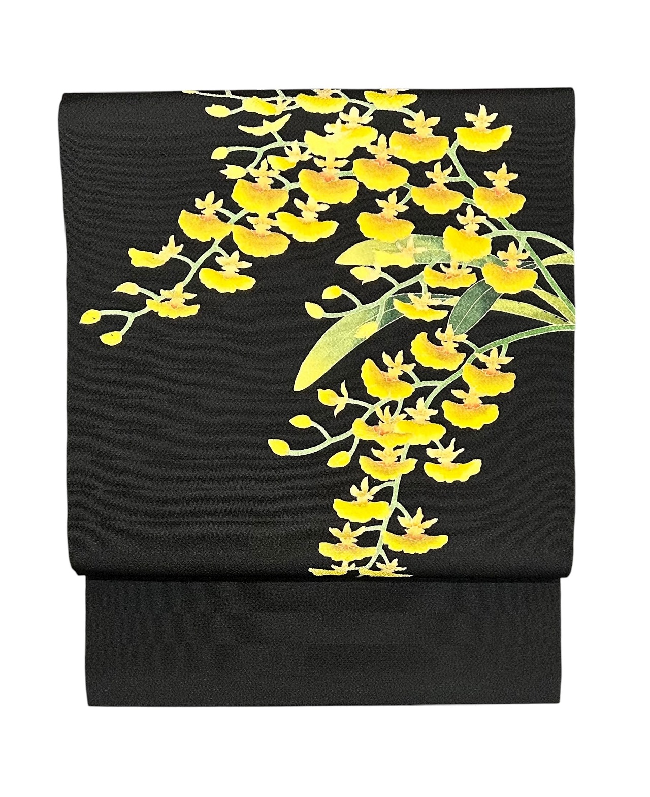 こちらは、洗練された名古屋帯です。黒地に映える卵色のラン科のオンシジウム柄が、全体に広がり、華やかさとともに高級感を醸し出しています。芯のある柔らかいちりめん地は、心地よい着用感を提供し、さまざまなシーンで活躍が期待できる一品です。