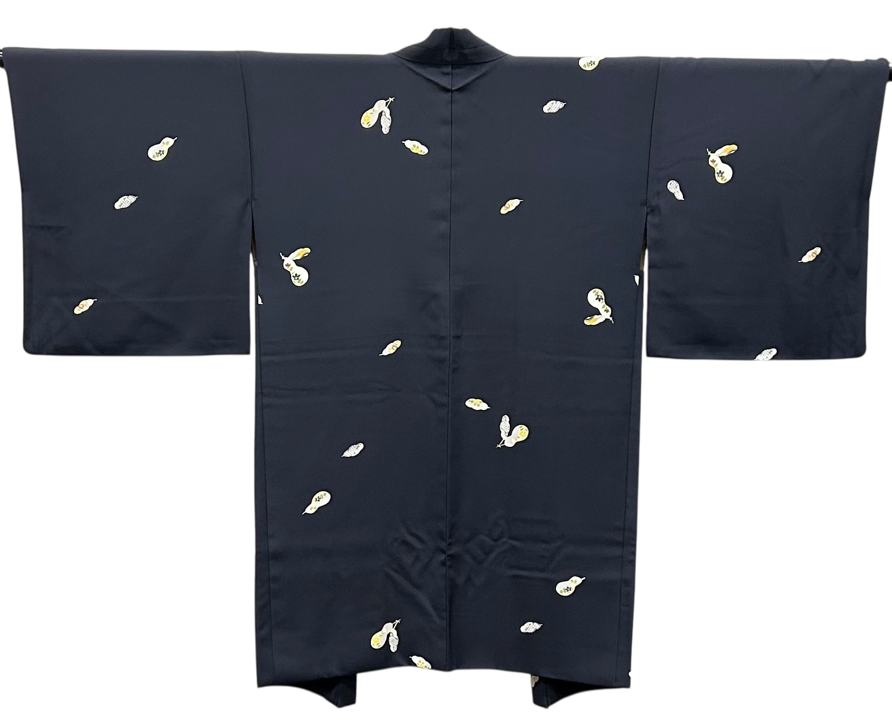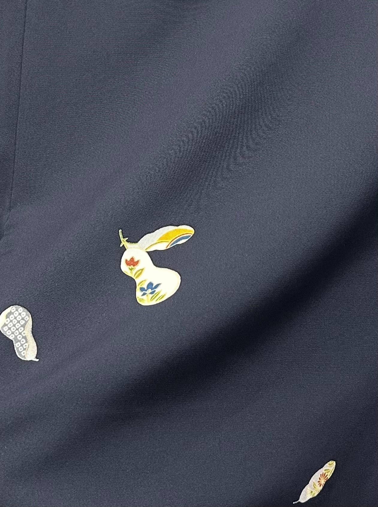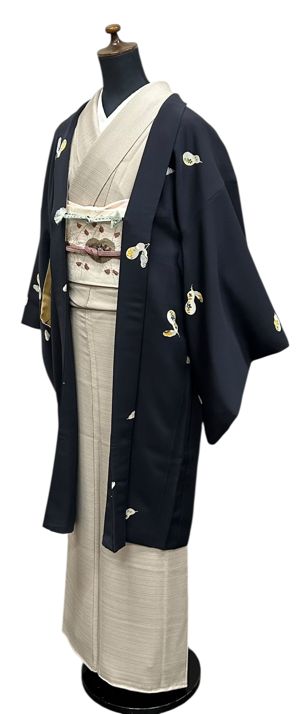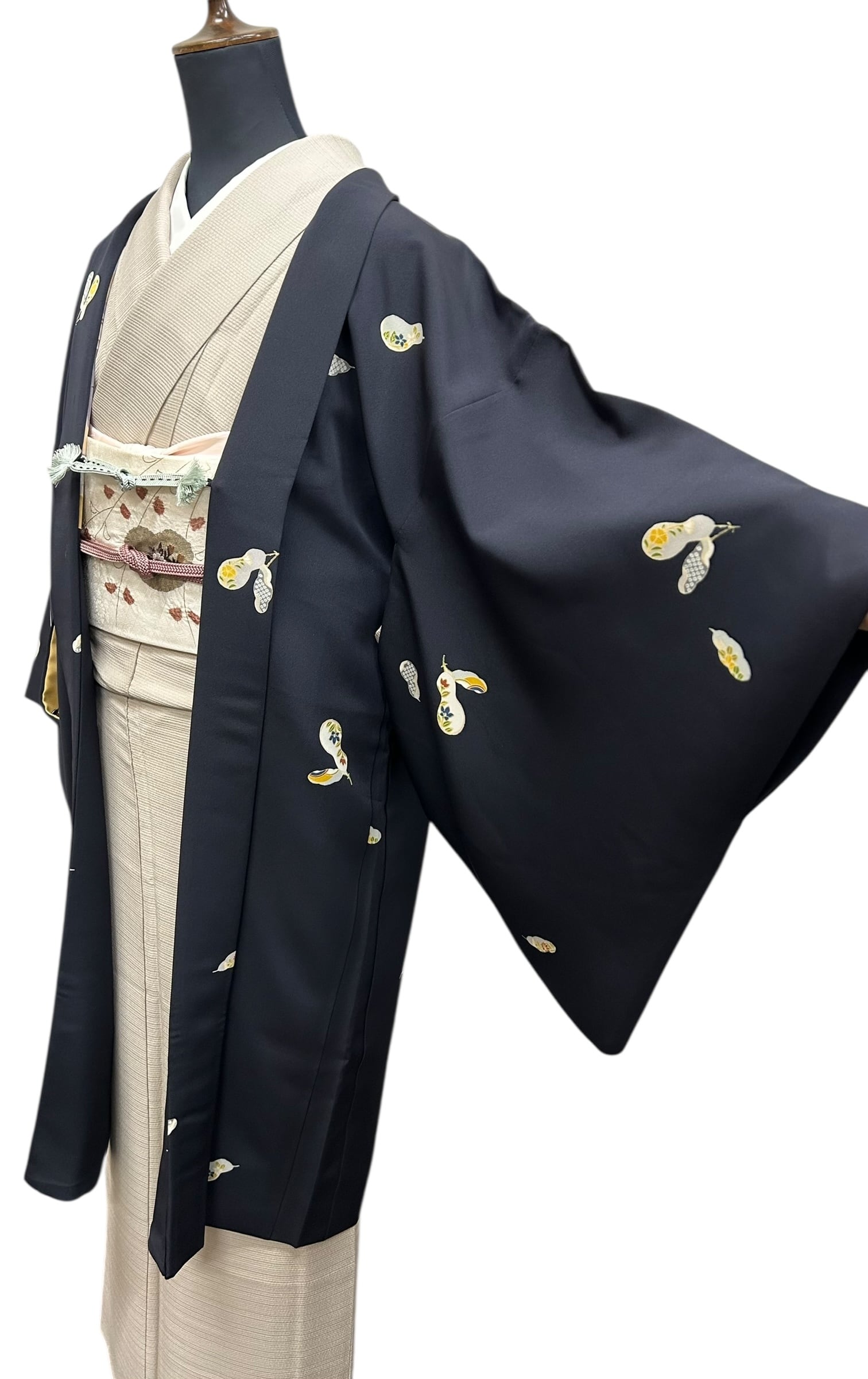 こちらは、遊び心あふれる魅力を持つ羽織です。黒地に可愛らしい瓢箪の飛び柄が散りばめられ、多色使いの草花や疋田柄が全体を華やかに彩っています。つるつるとしたなめらかな生地は、心地よい着用感を与え、様々なスタイルに合わせやすく、一枚あると重宝するアイテムとなっています。